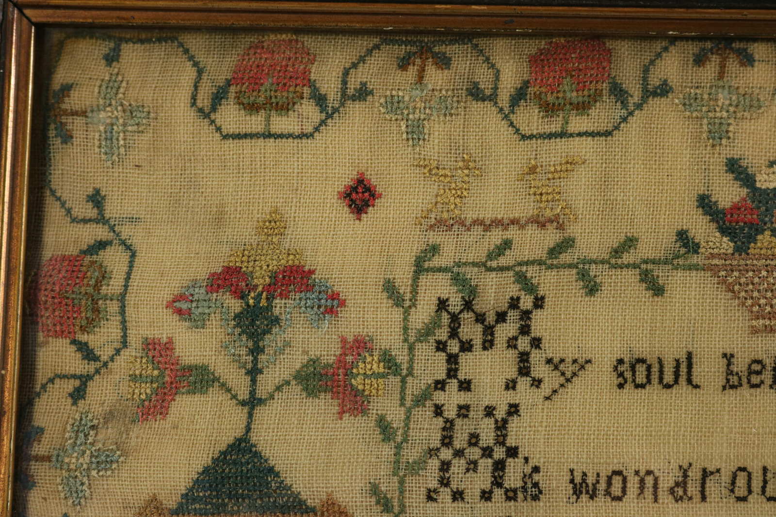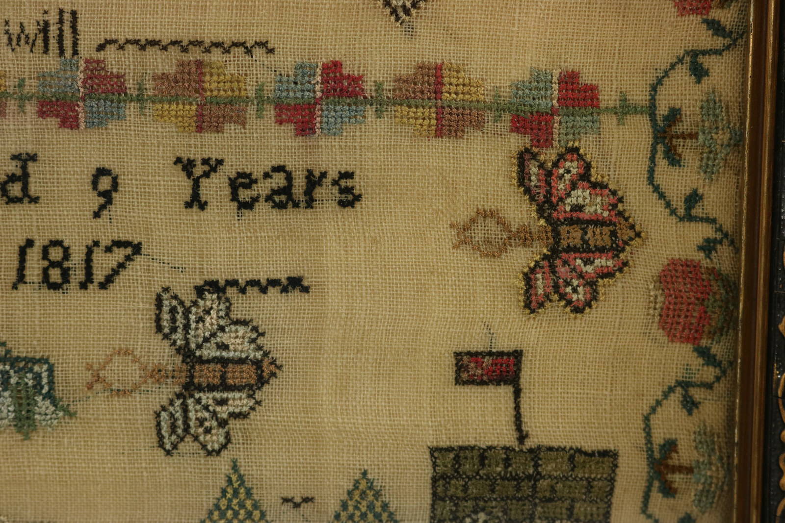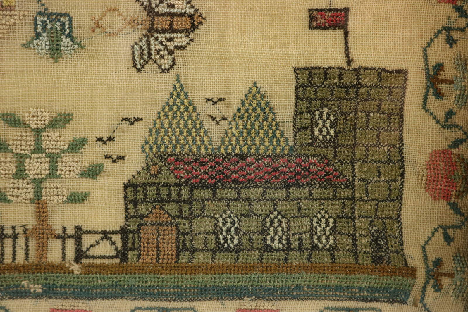 The sampler is worked in silk on linen ground, mainly in cross stitch.