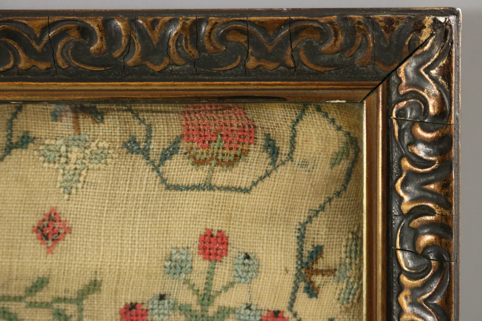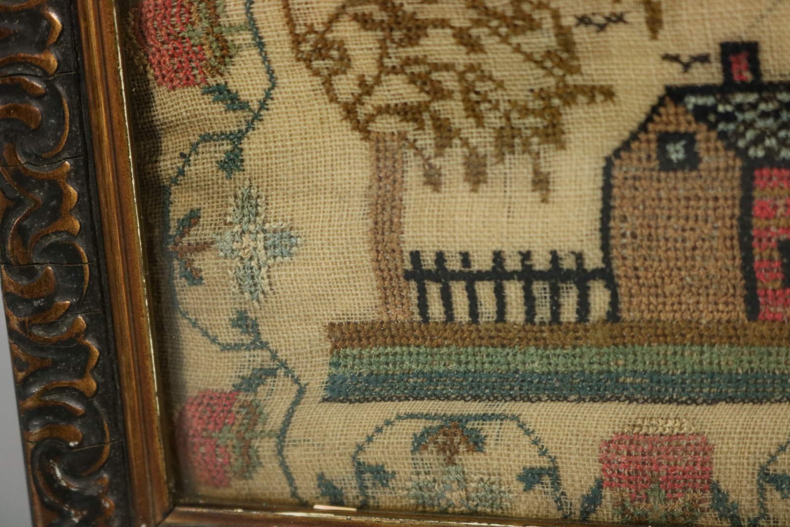 Mounting: The sampler is tacked to a wood stretcher frame. Frame backed with wood and sealed with tape.