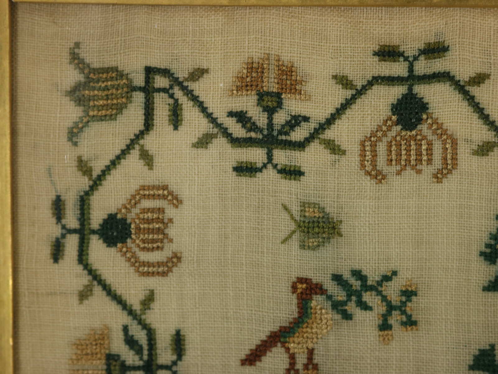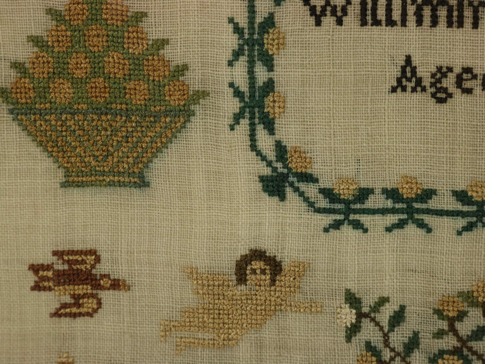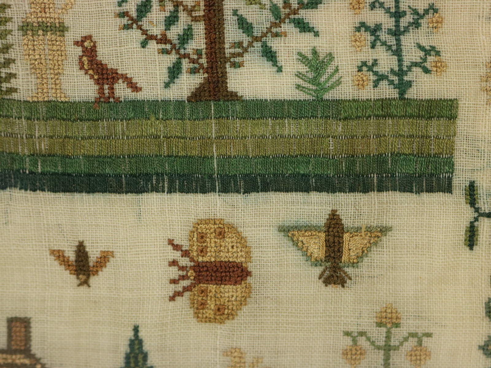 The sampler is worked in silk on linen ground, in a variety of stitches.