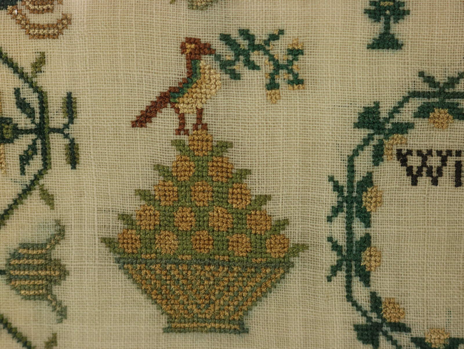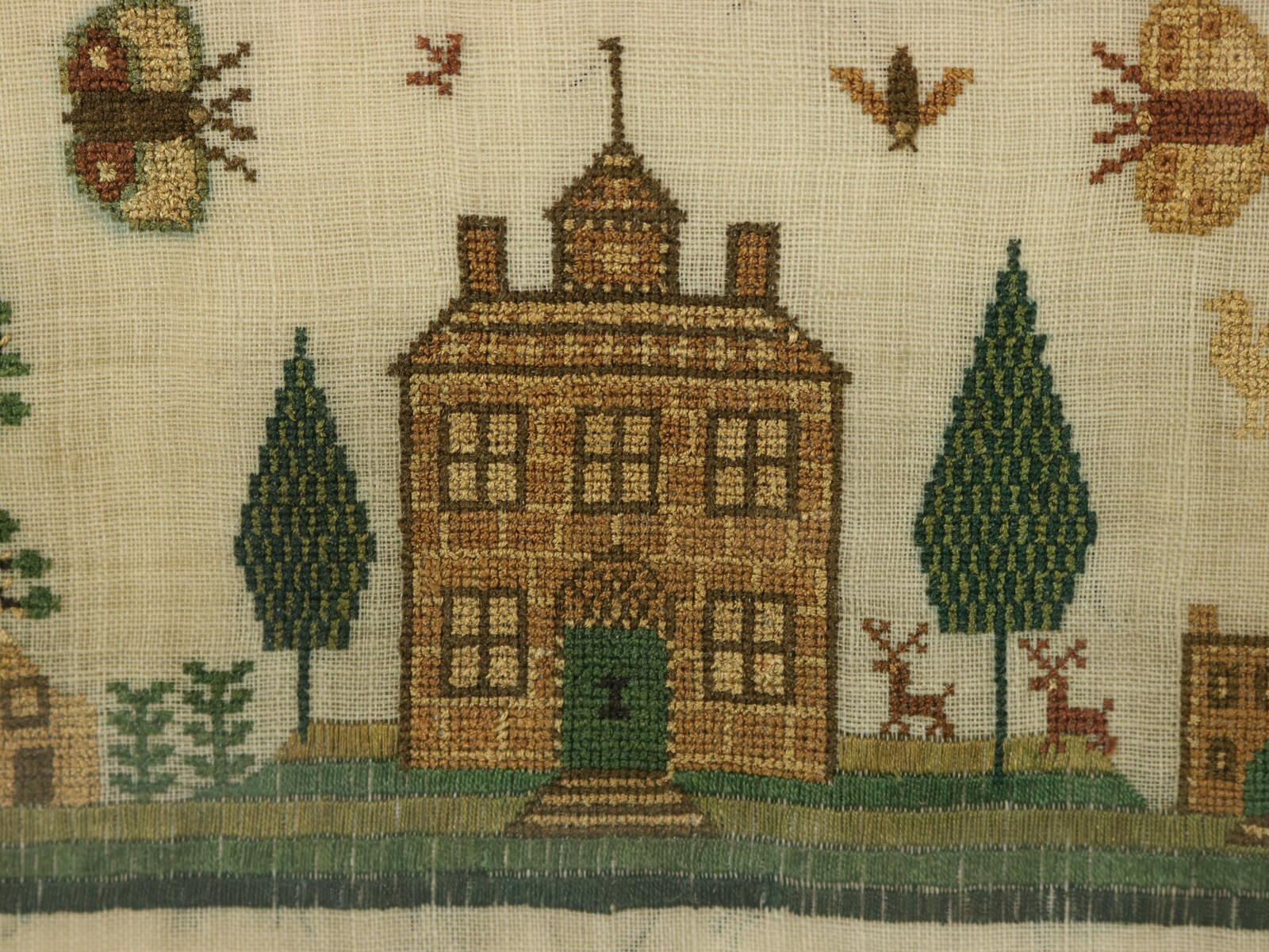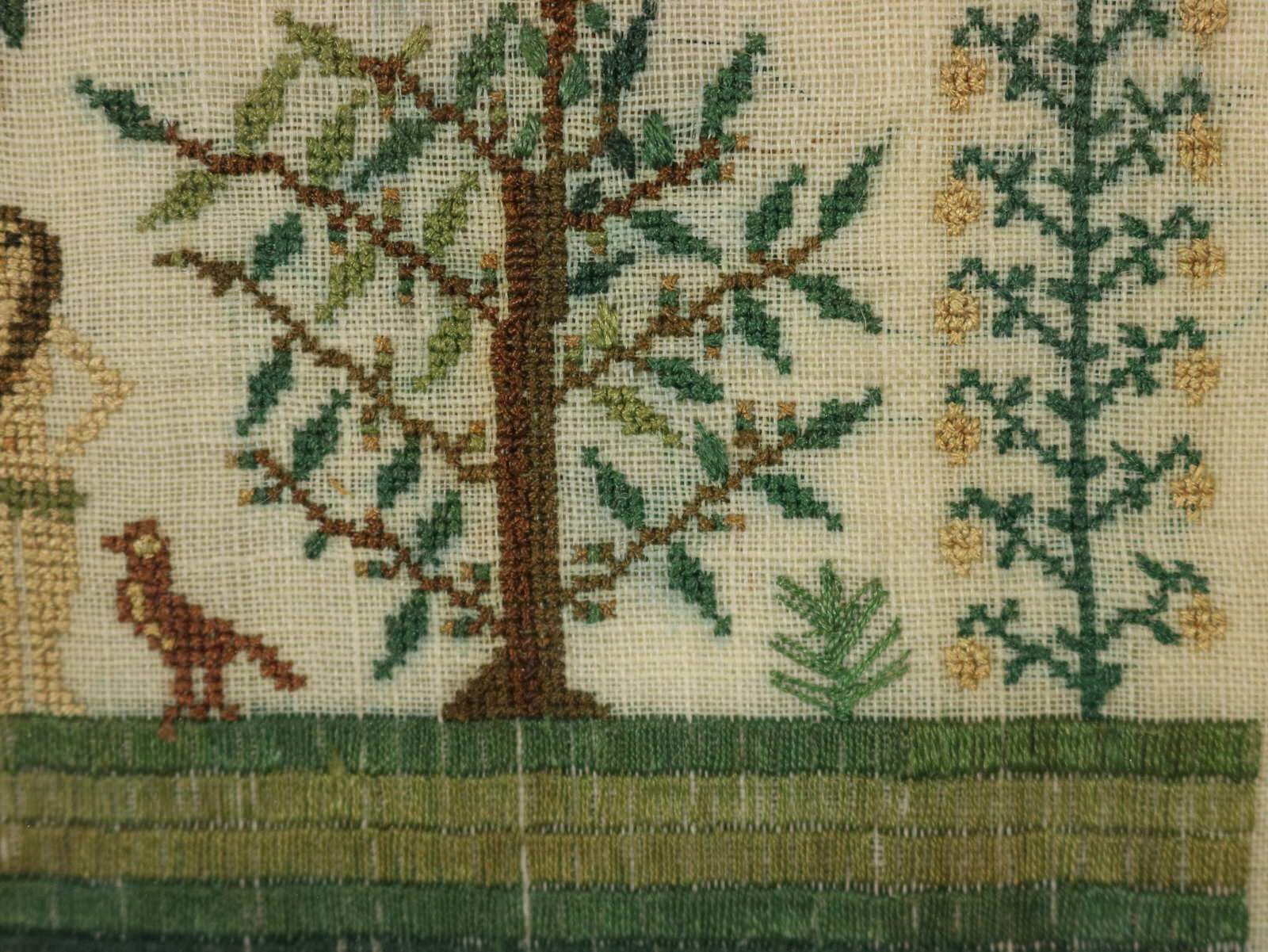 The sampler is worked in silk on linen ground, in a variety of stitches.