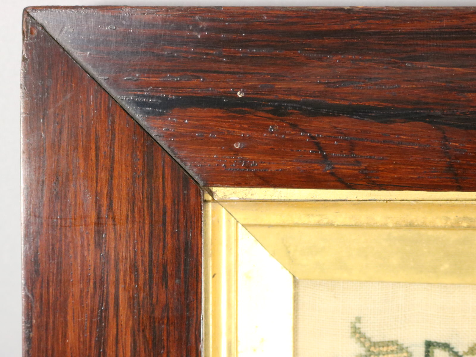 Framed in an old, possibly original, rosewood veneer frame with rippled, old glass.