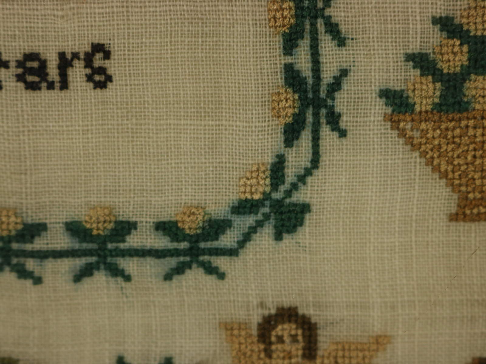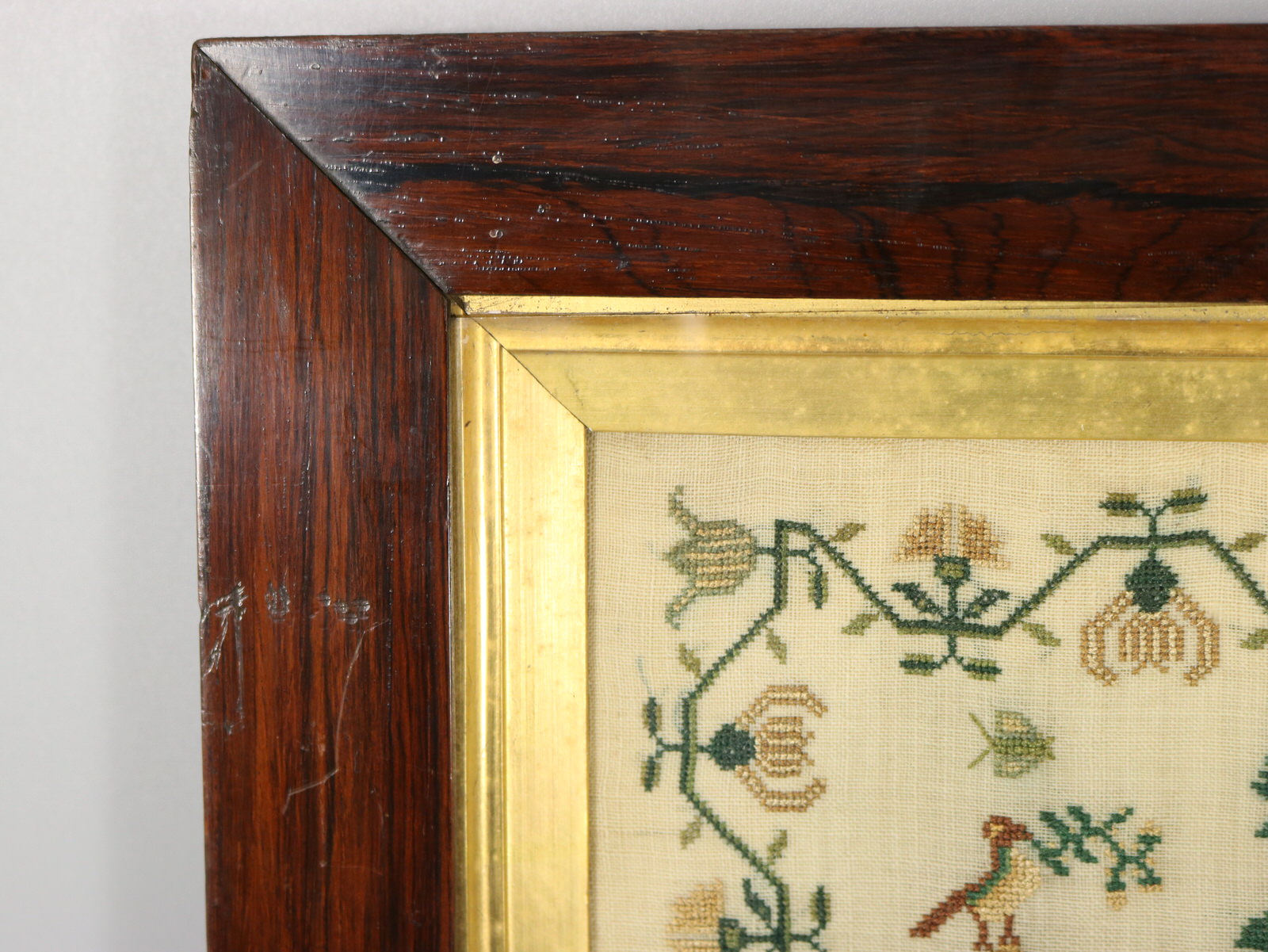 Mounting: The sampler is tacked to a wood stretcher frame. Frame backed with chipboard and sealed with tape.