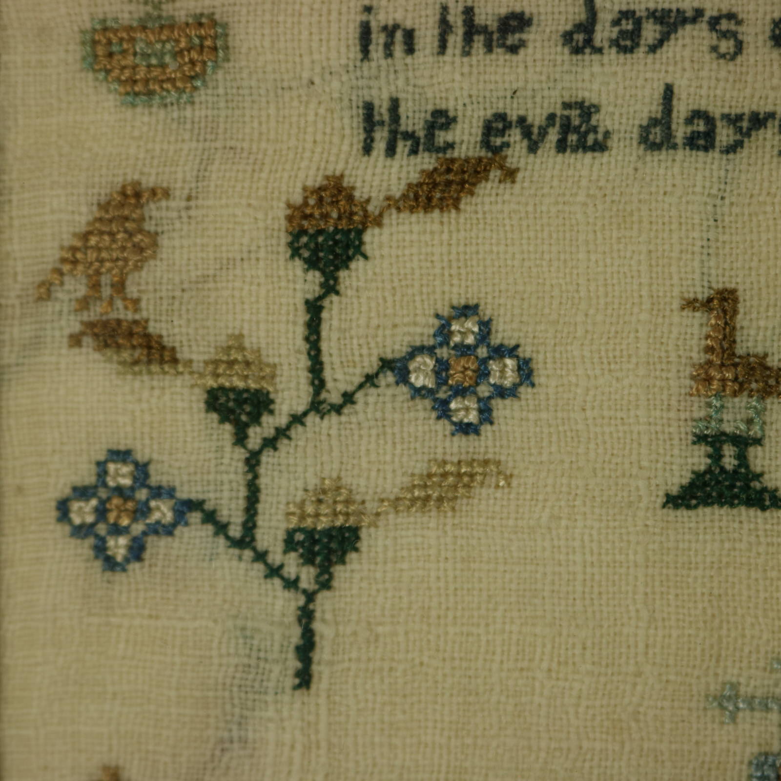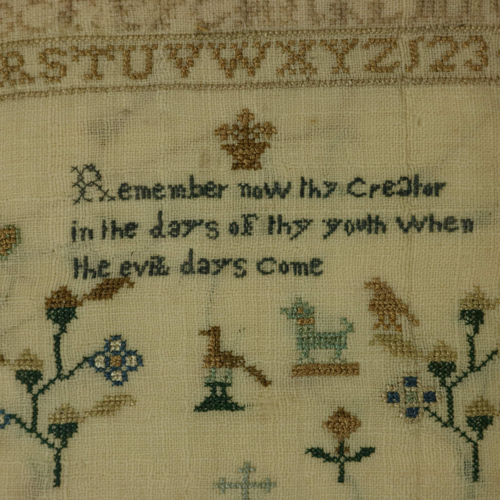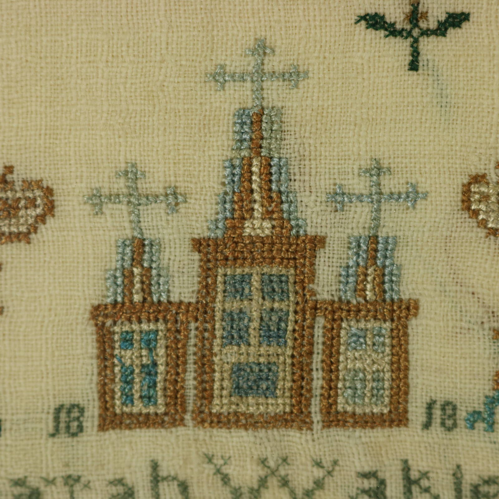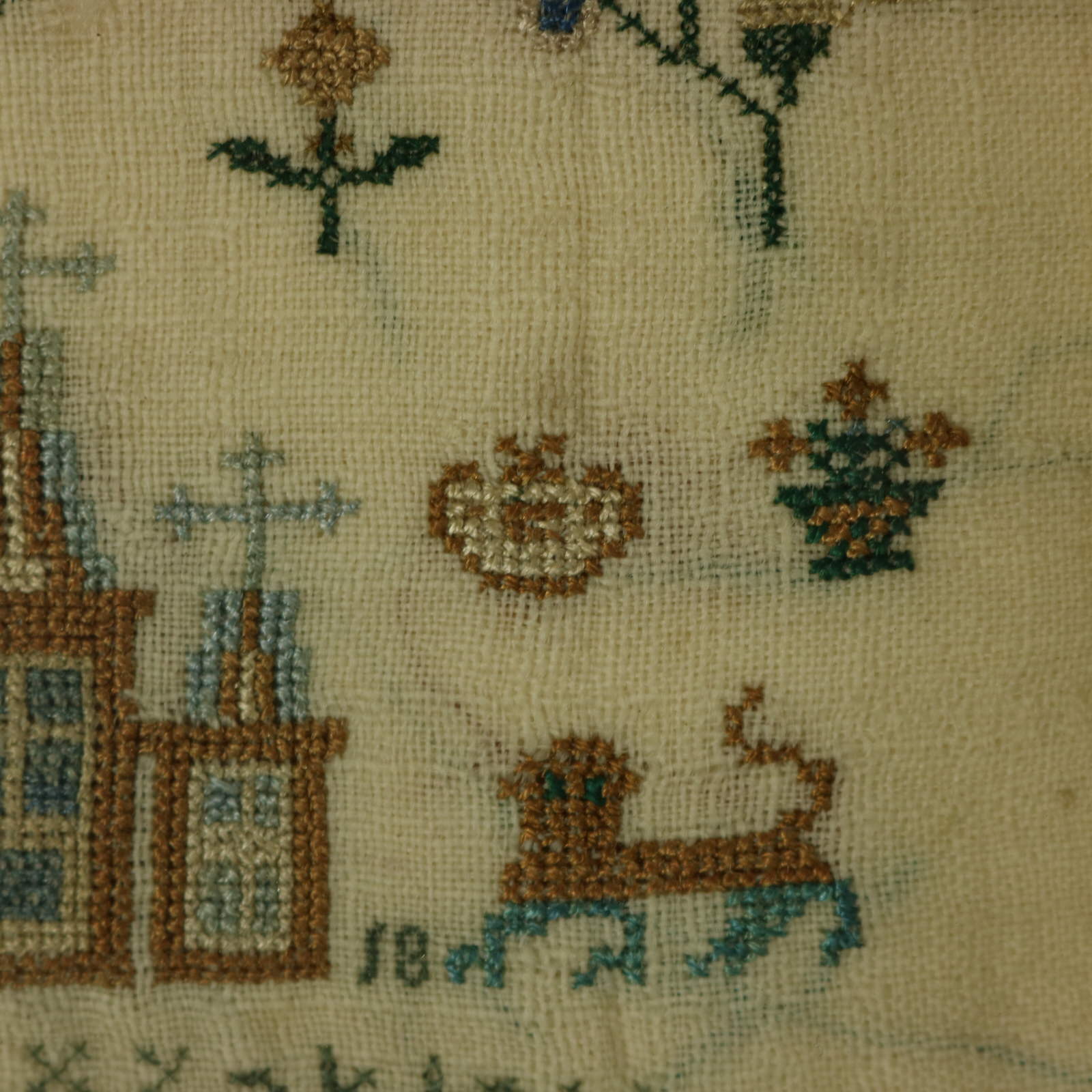 The sampler is worked in silk on linen ground, in cross stitch throughout.