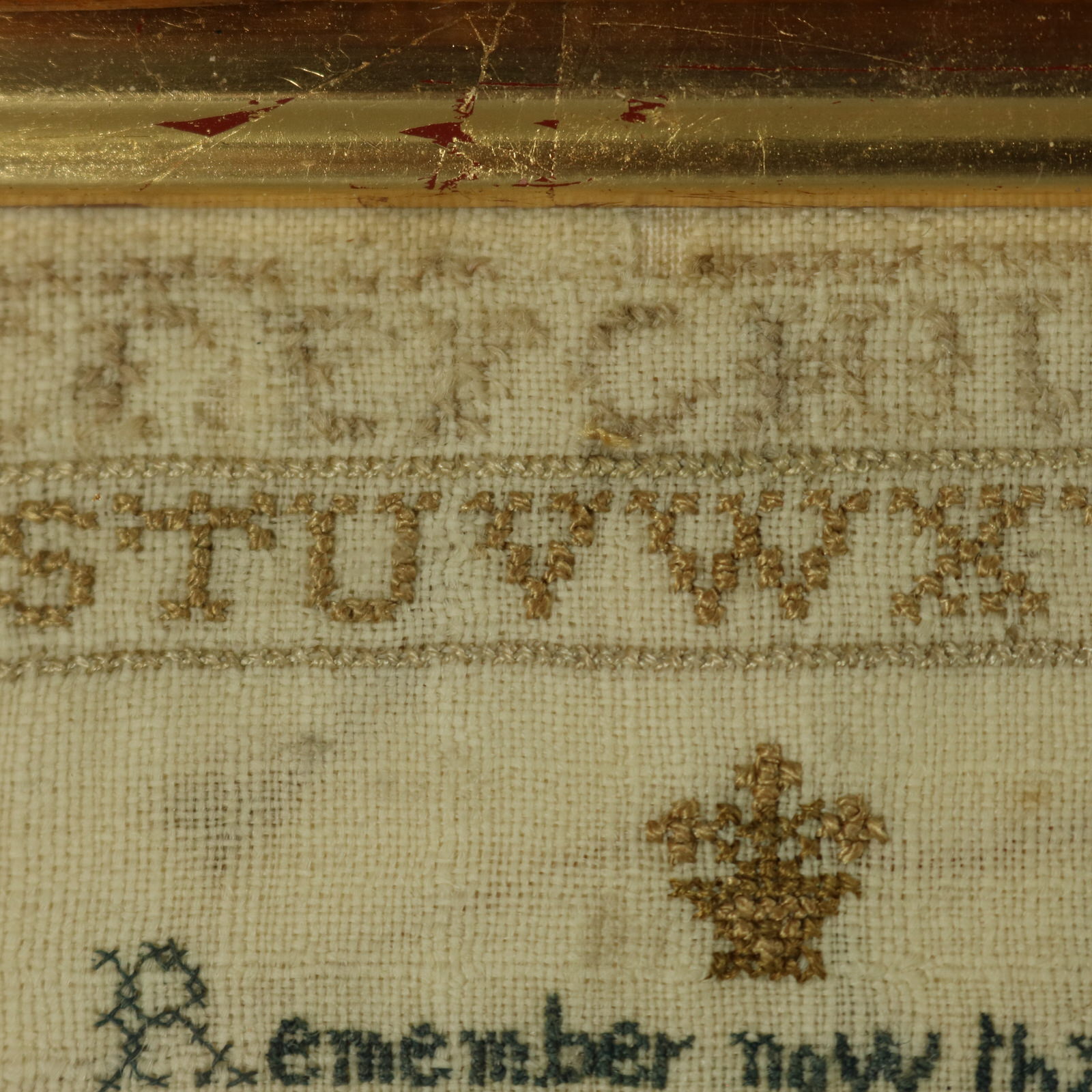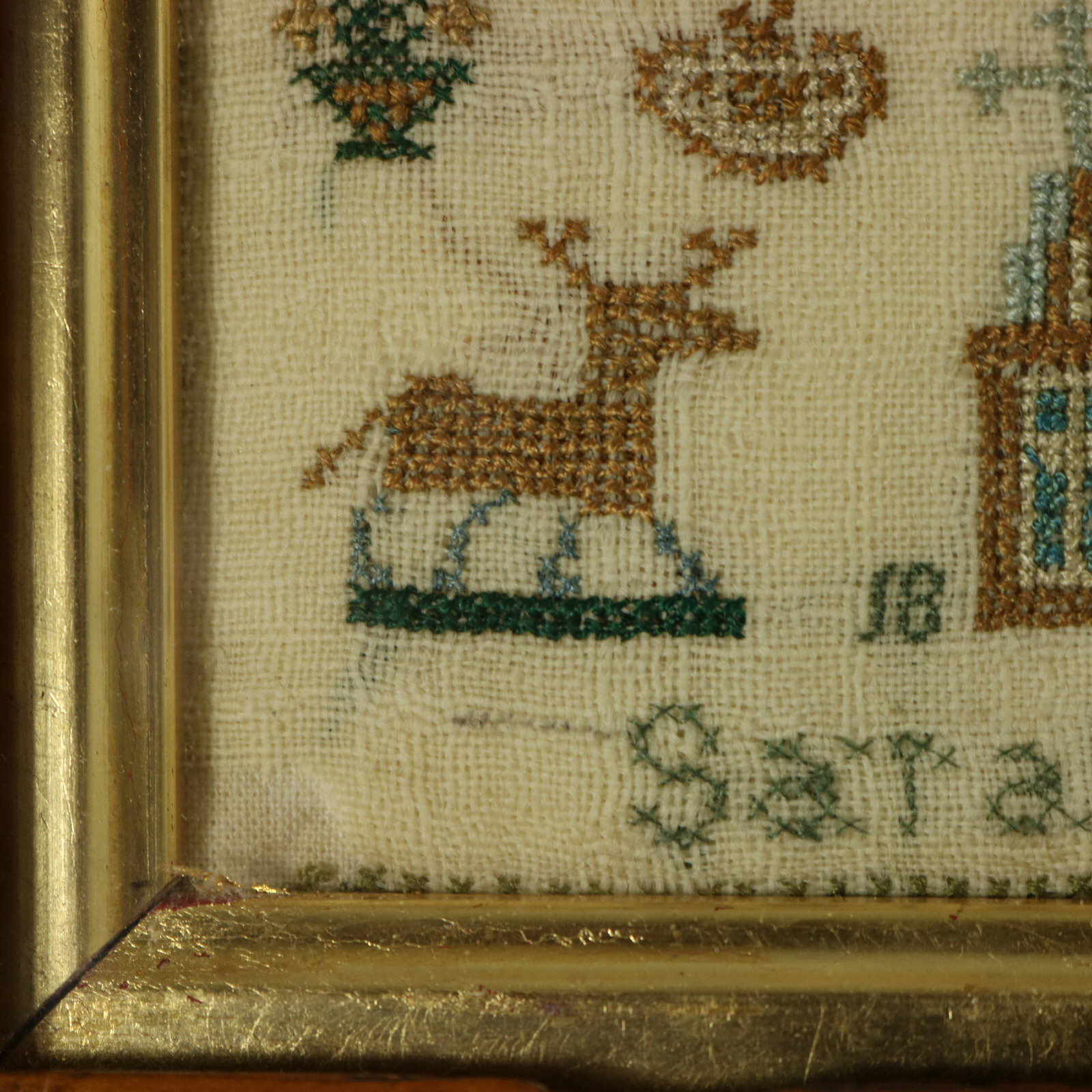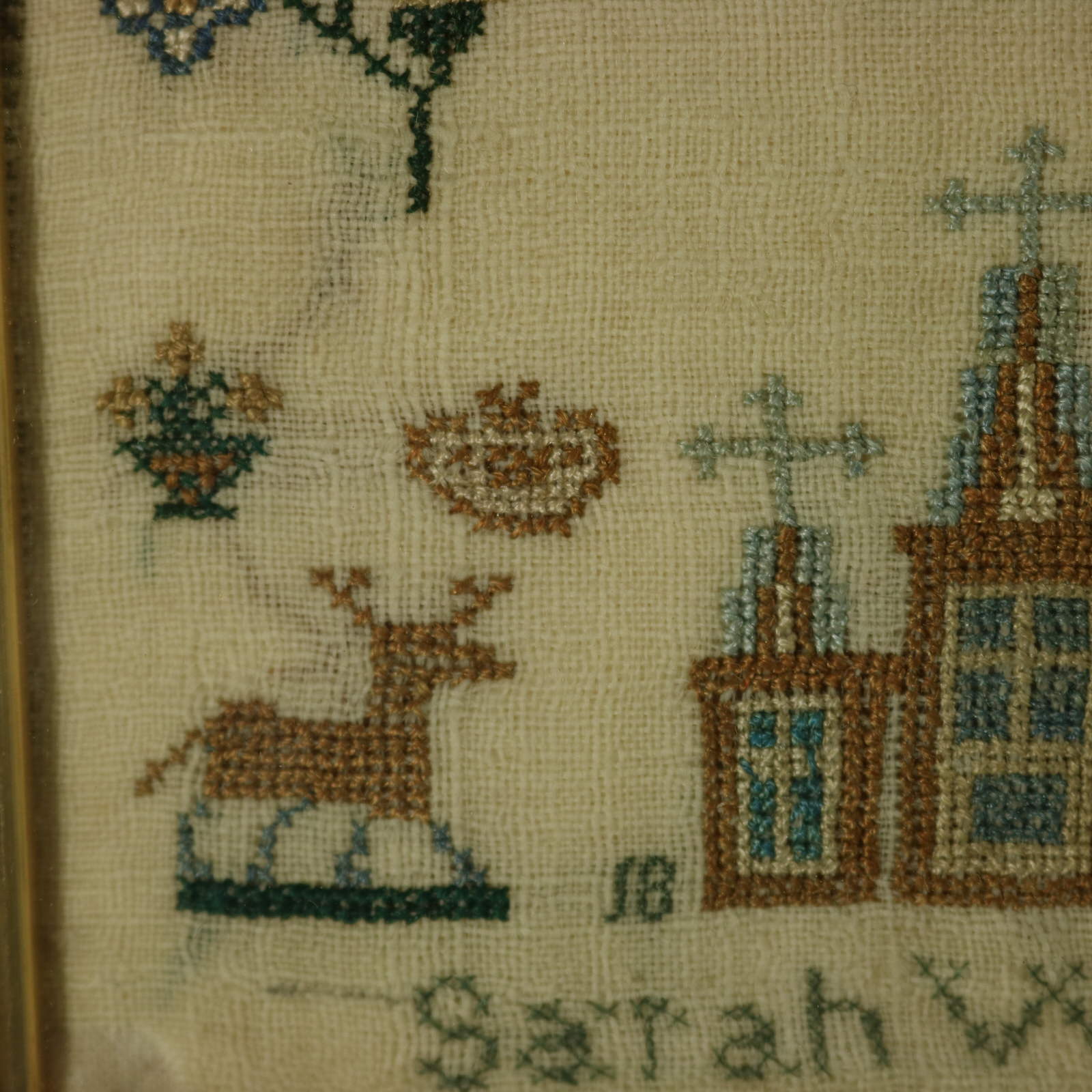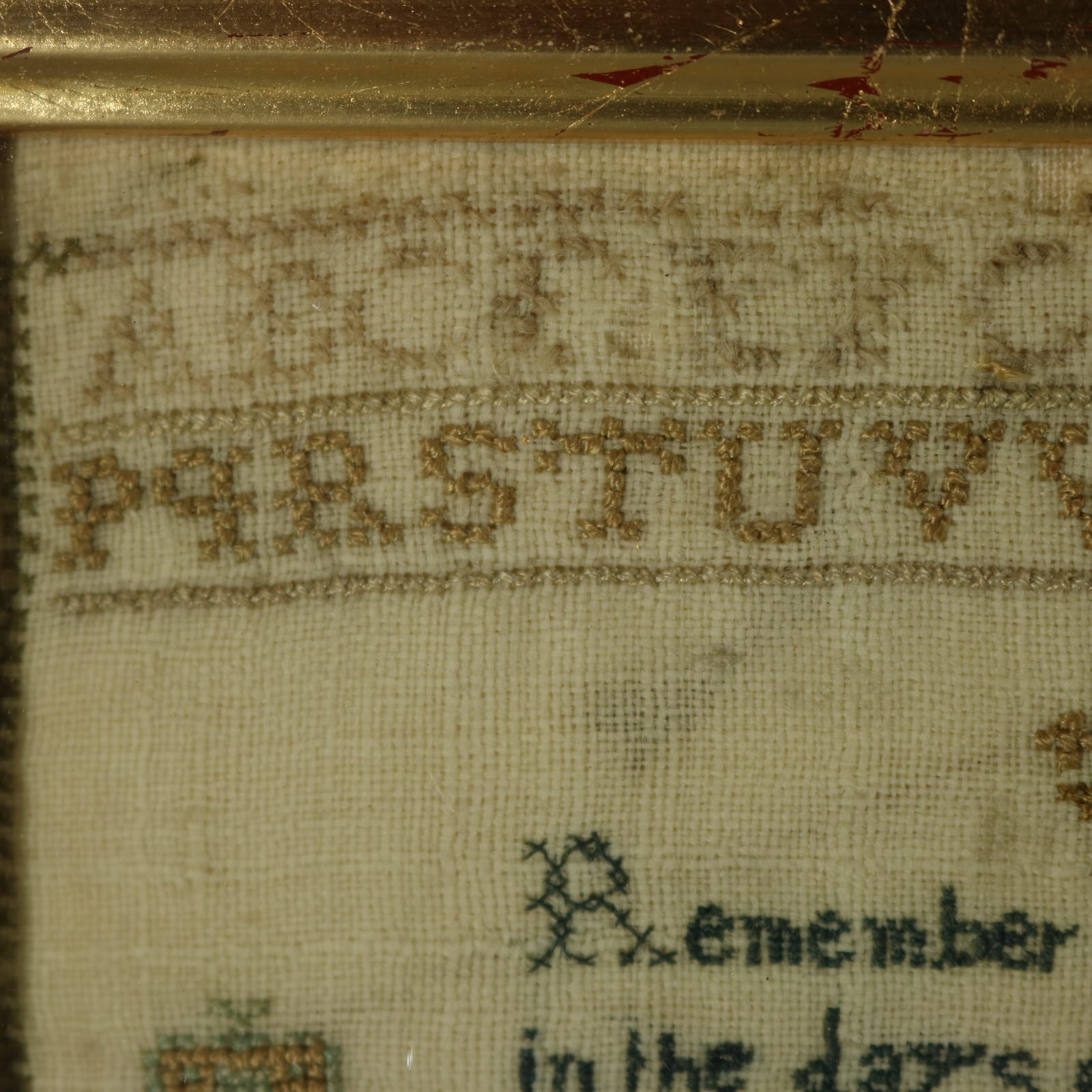Mounting: The sampler is fixed to linen. Frame backed with brown paper and sealed with tape.