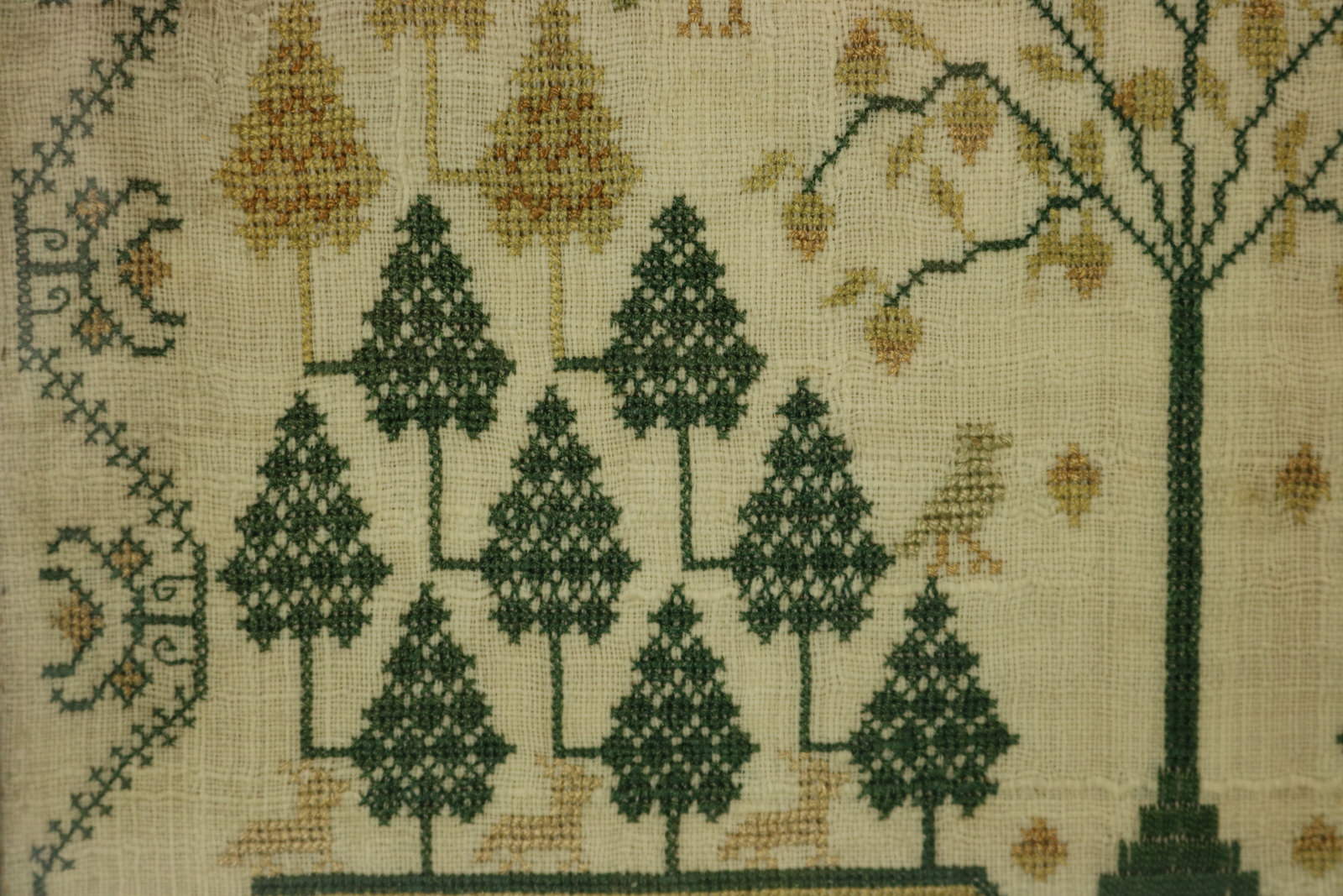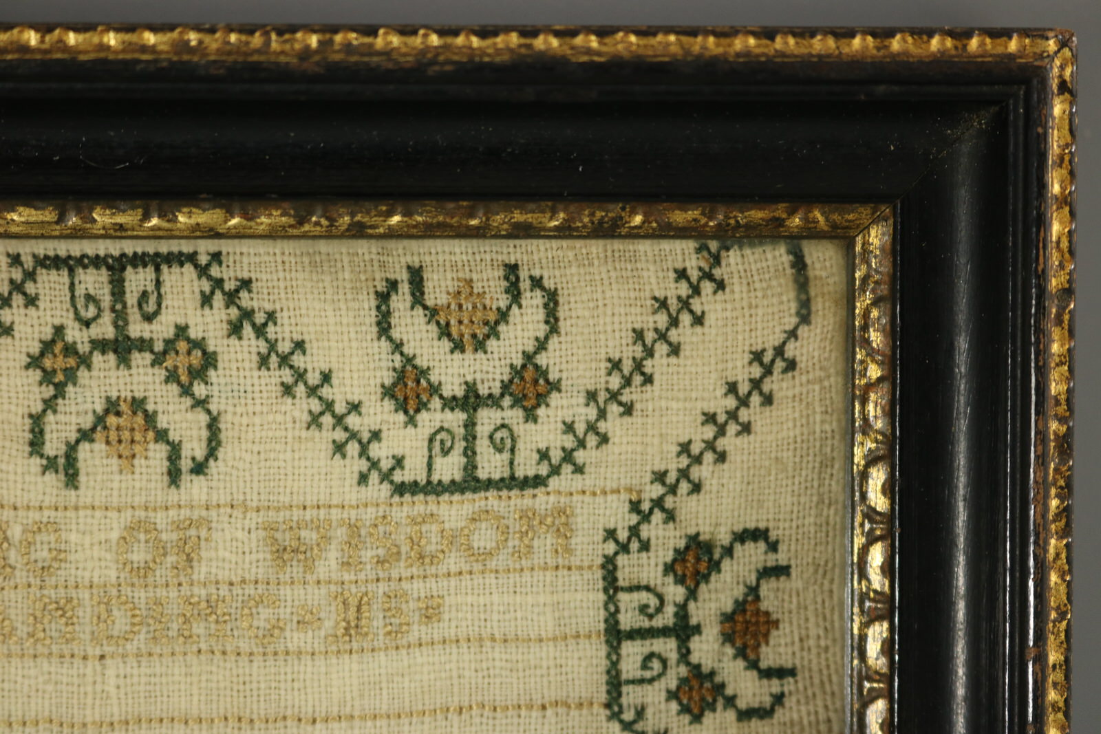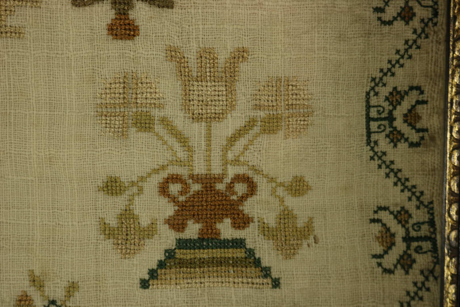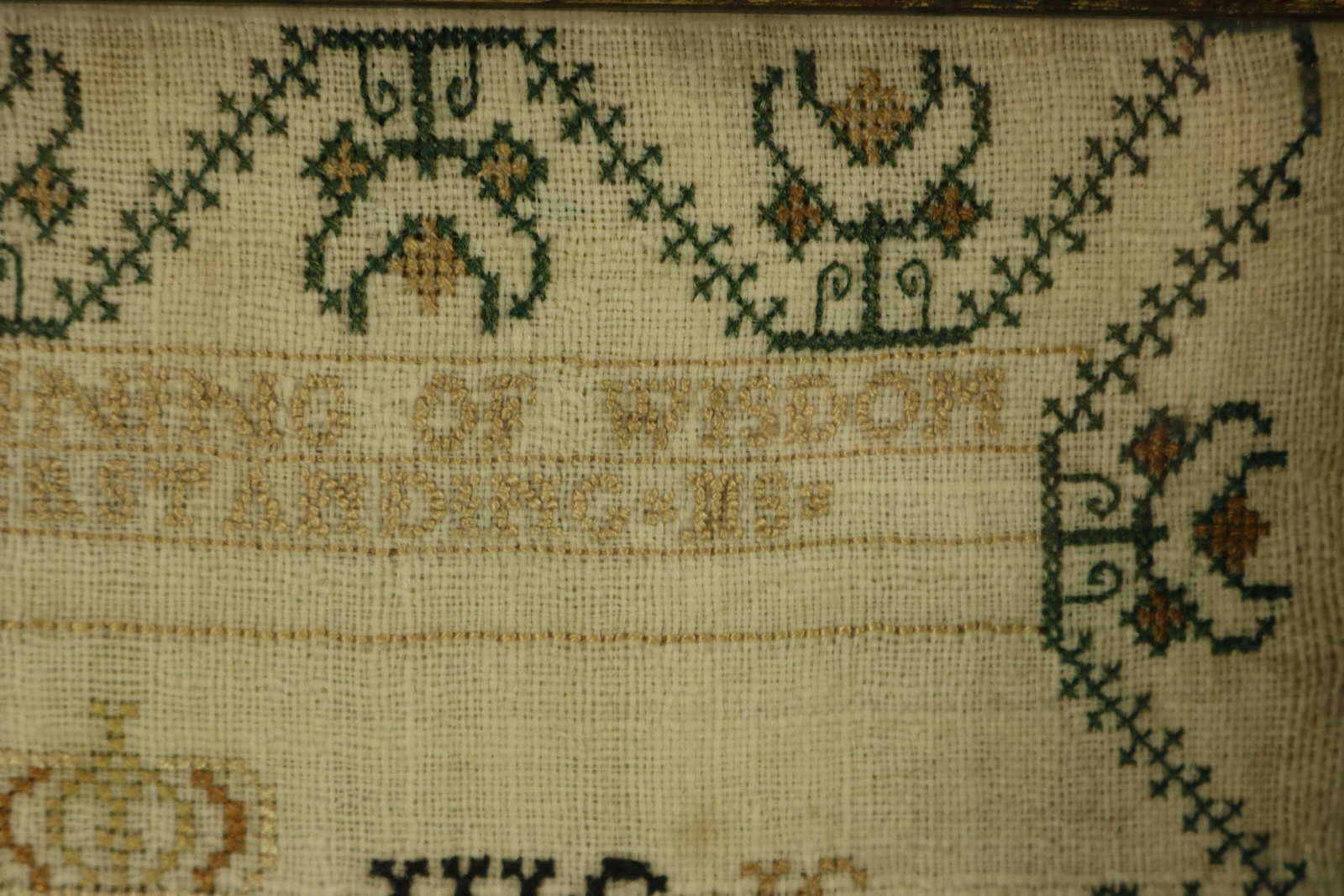 The sampler is worked in silk on linen ground, in cross stitch throughout. Meandering floral border.