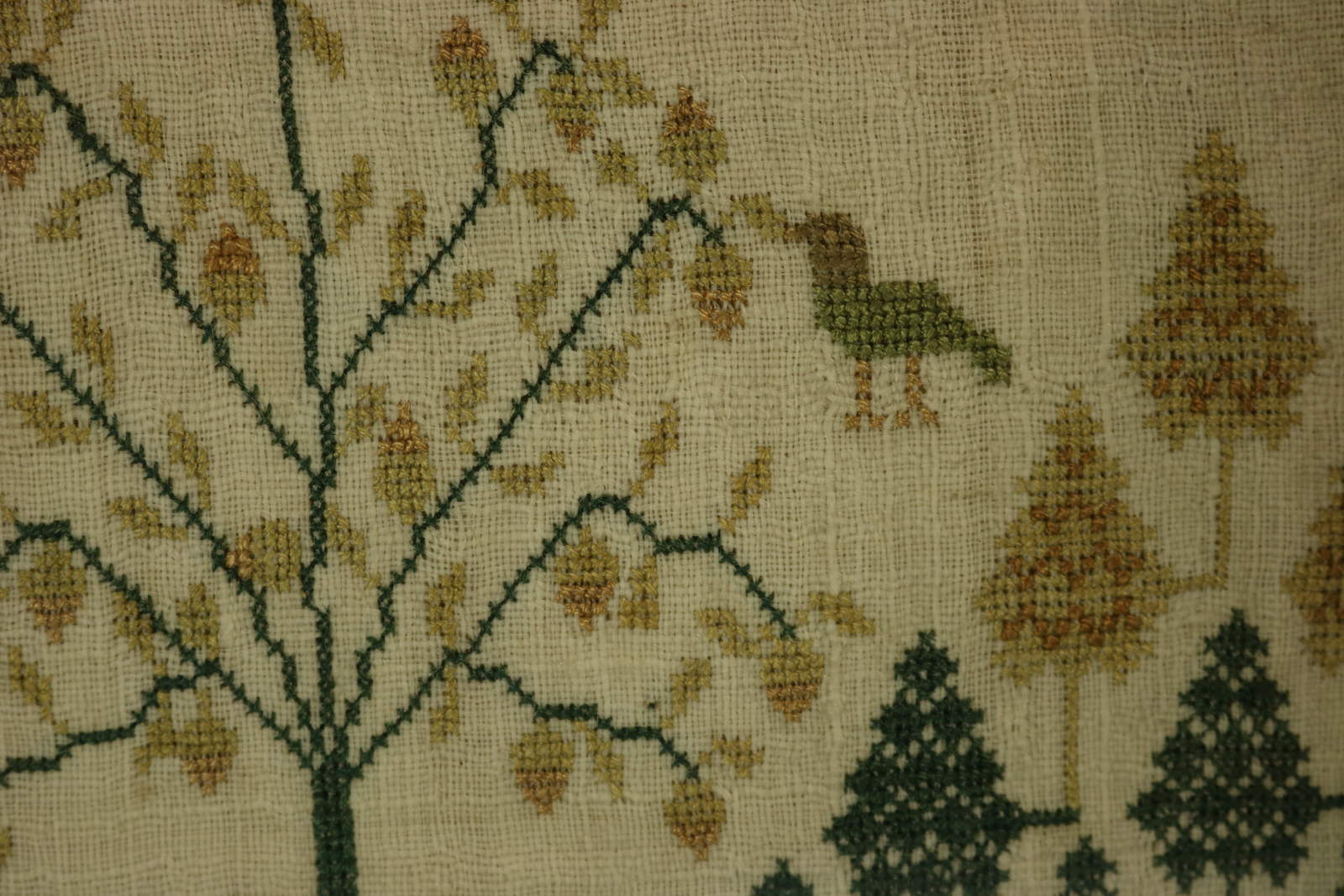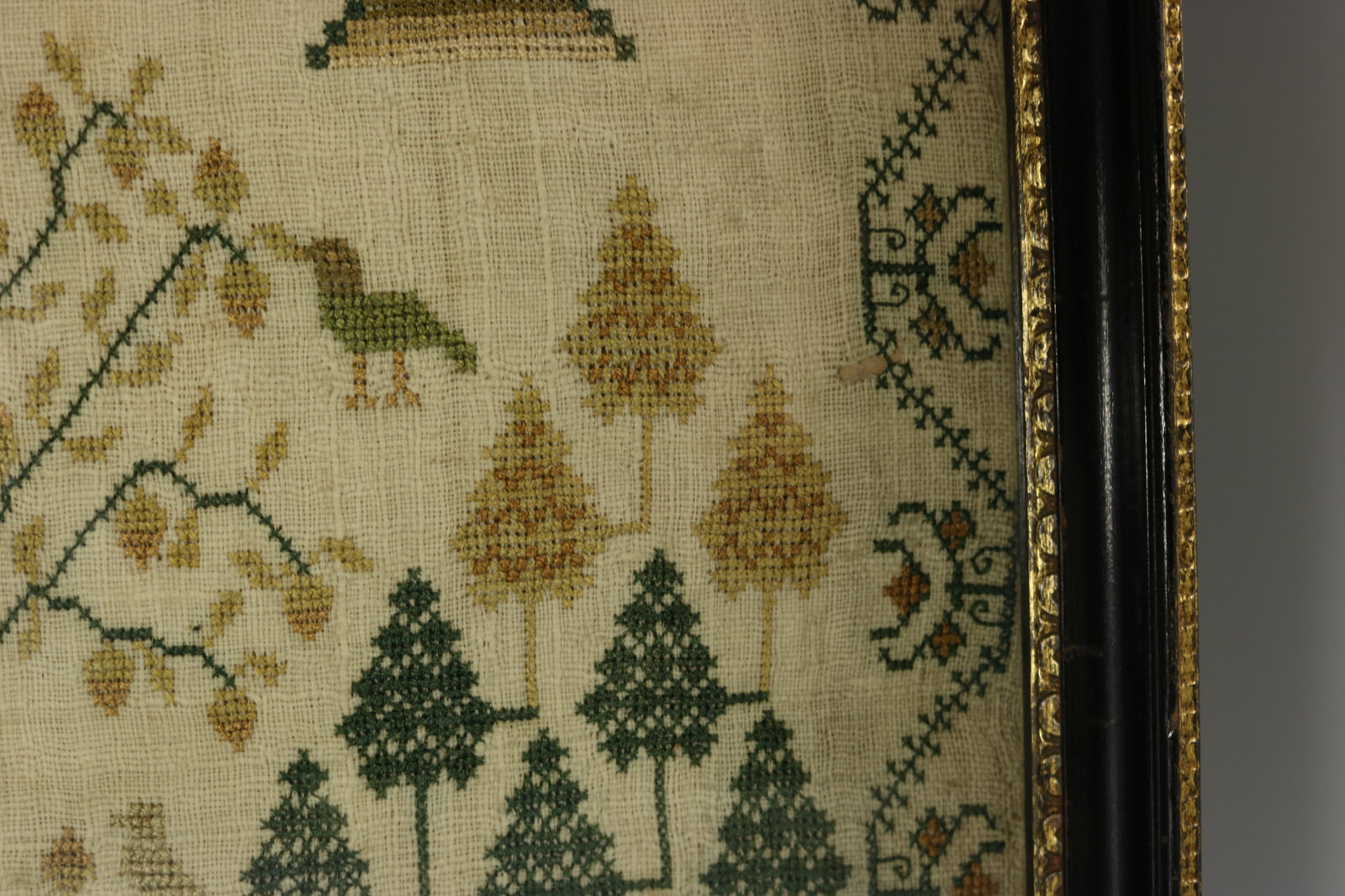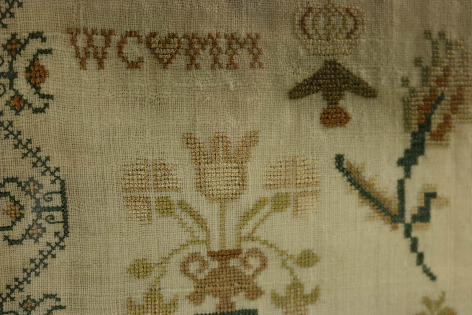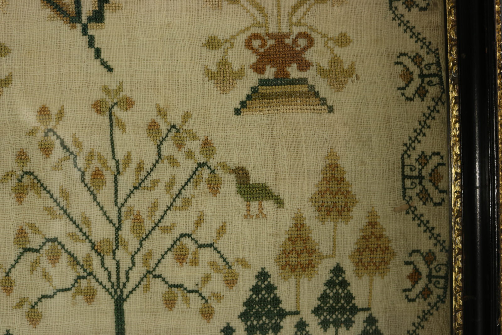 The sampler is worked in silk on linen ground, in cross stitch throughout. Meandering floral border.