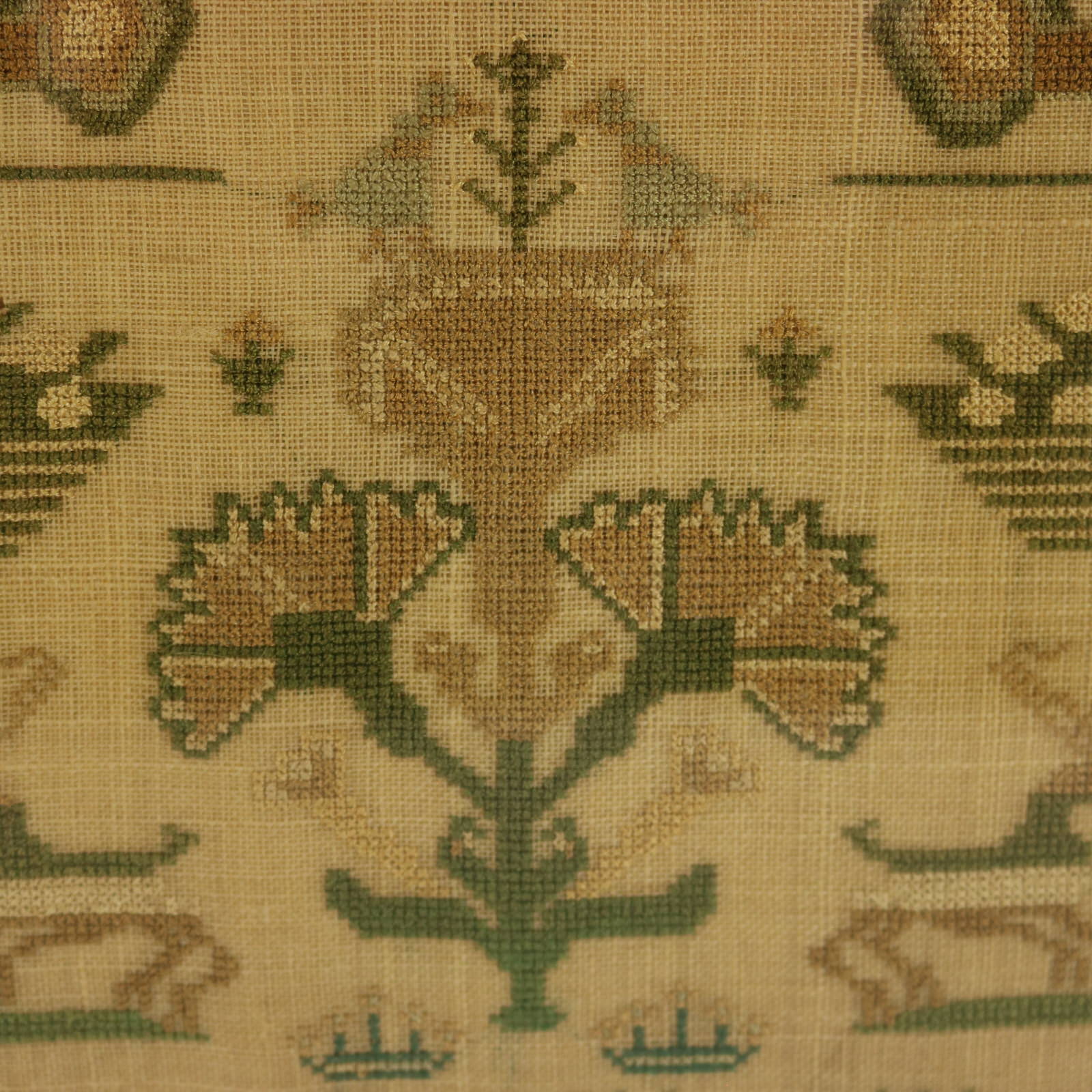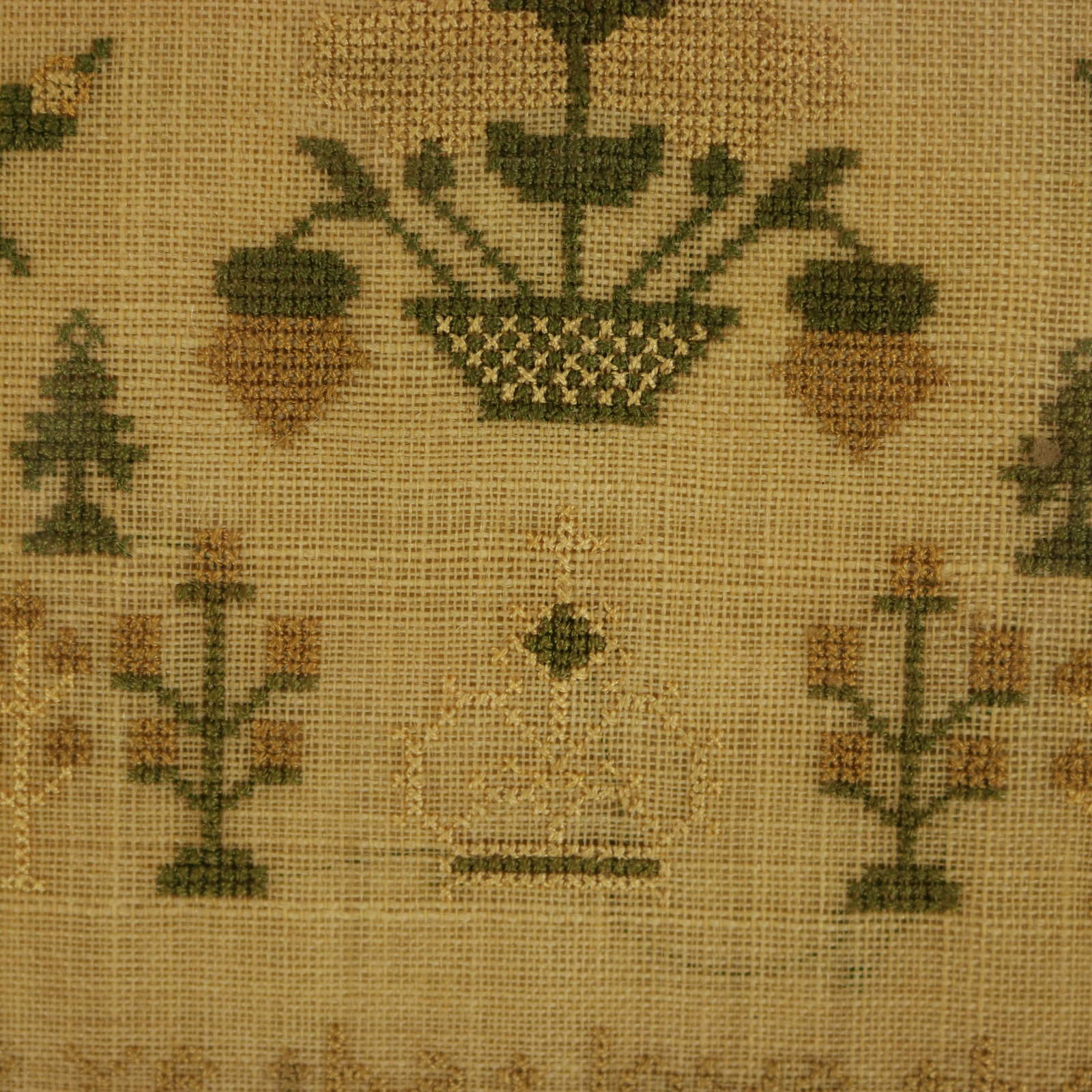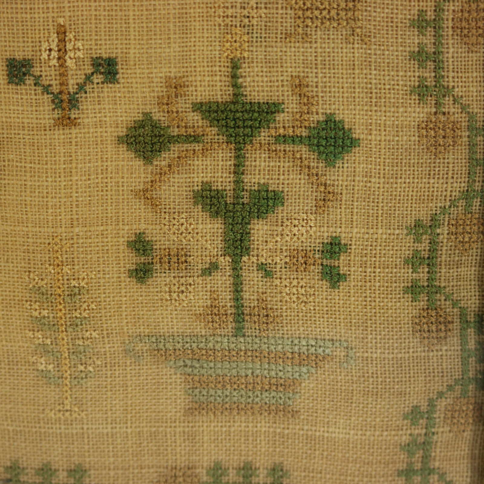 Mounting: The sampler is tacked to a wood stretcher frame. Frame backed with chipboard and sealed with tape.