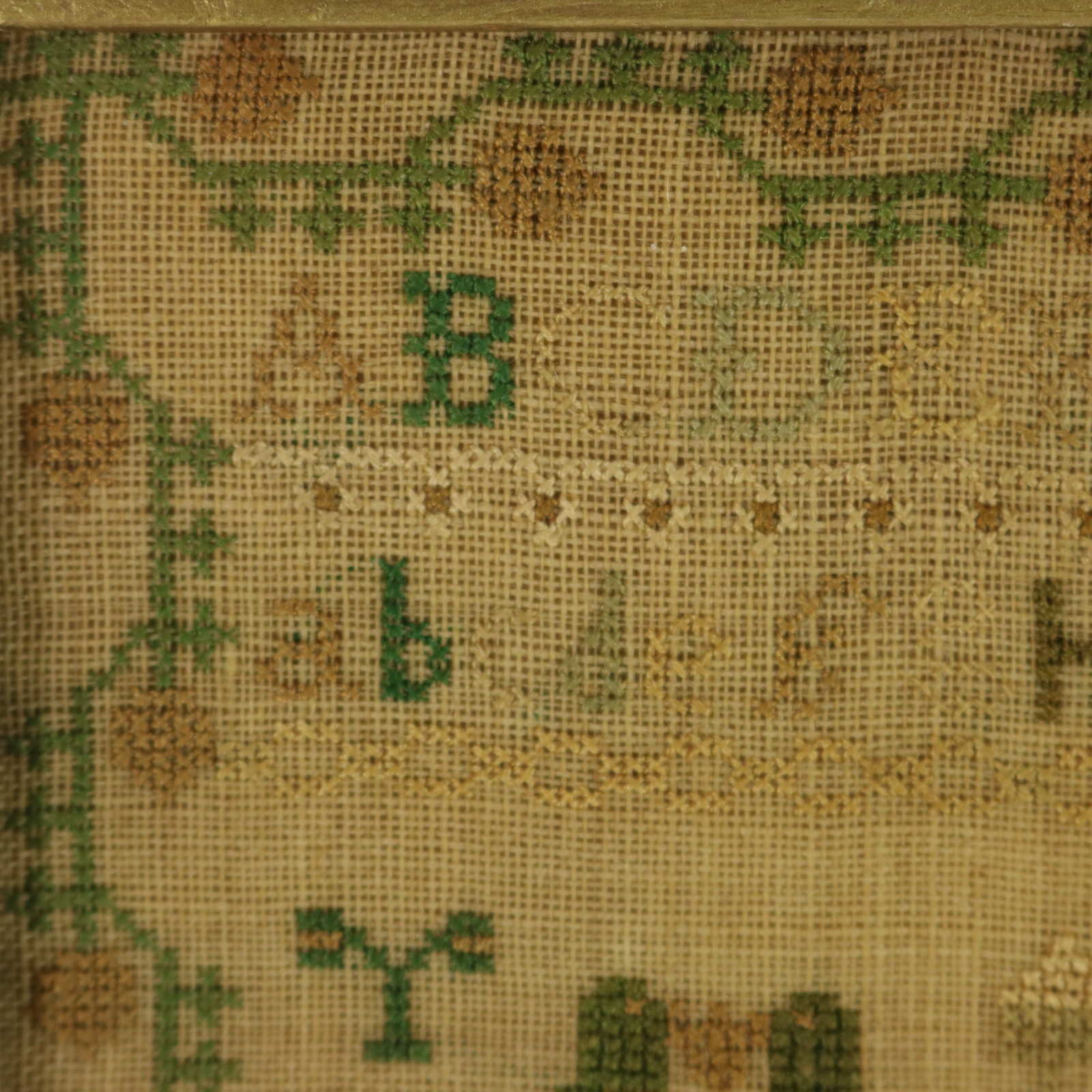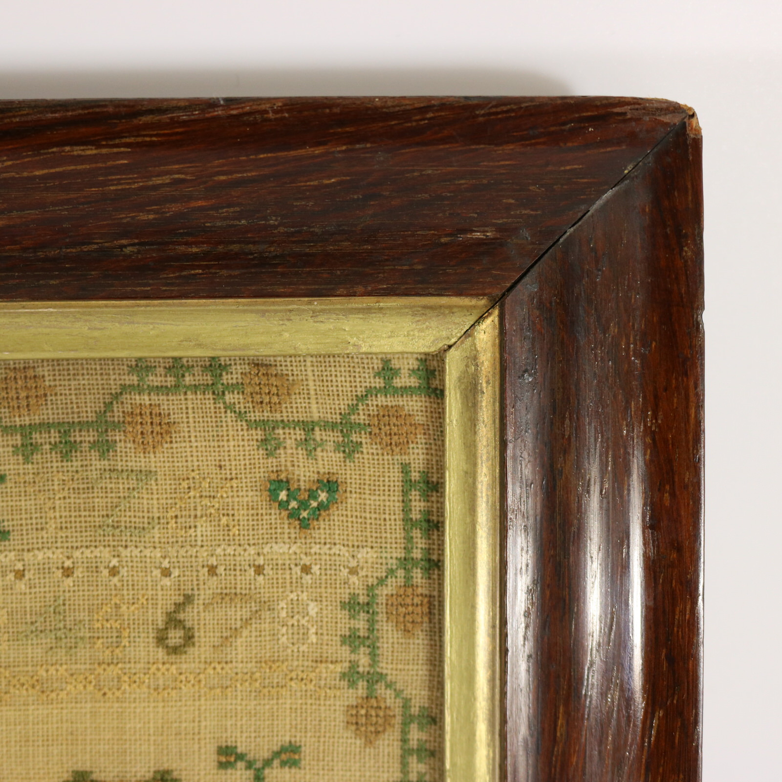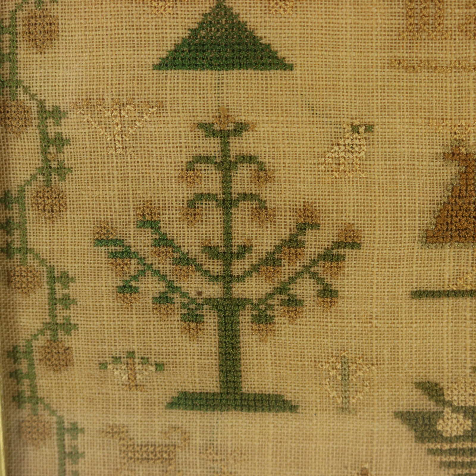 Mounting: The sampler is tacked to a wood stretcher frame. Frame backed with chipboard and sealed with tape.