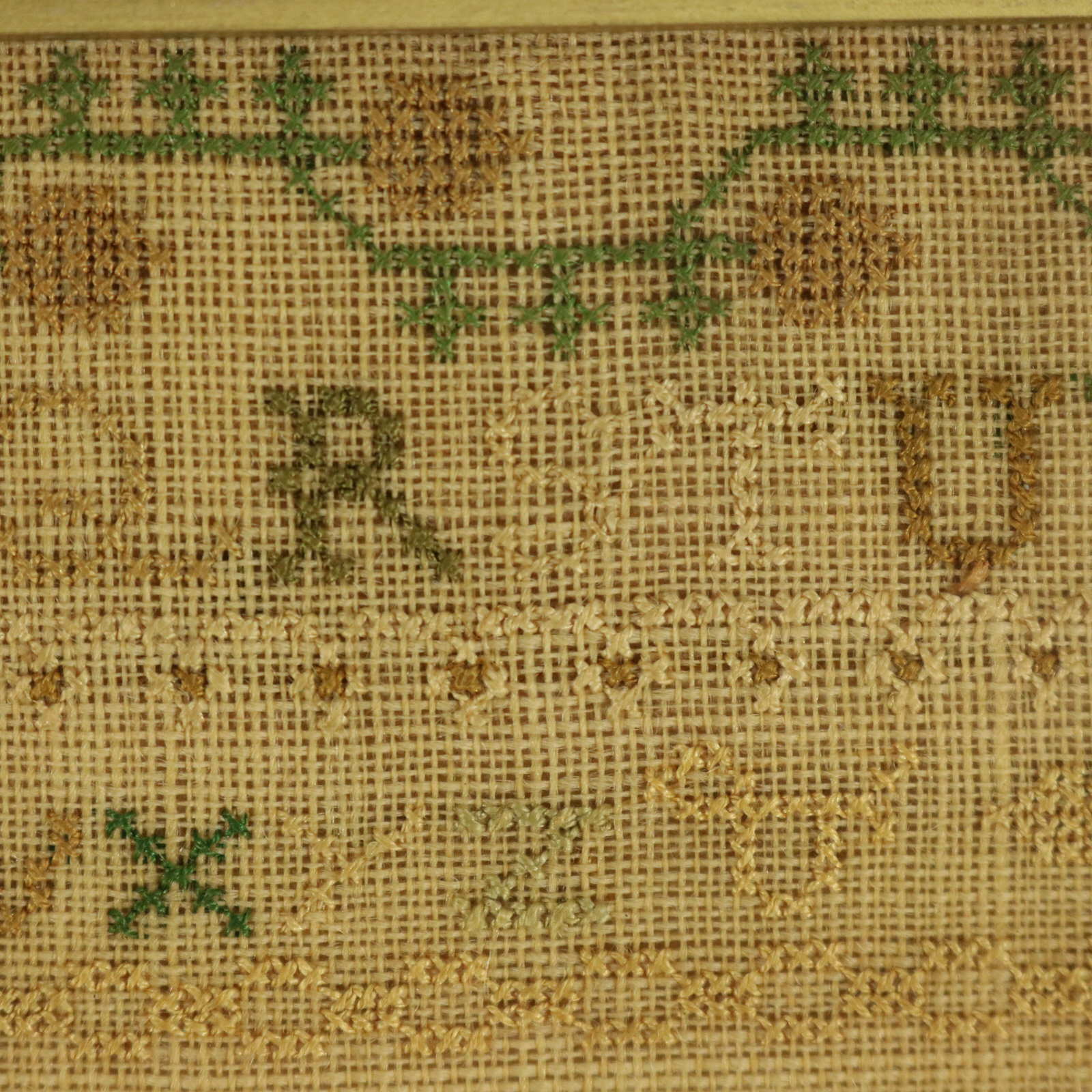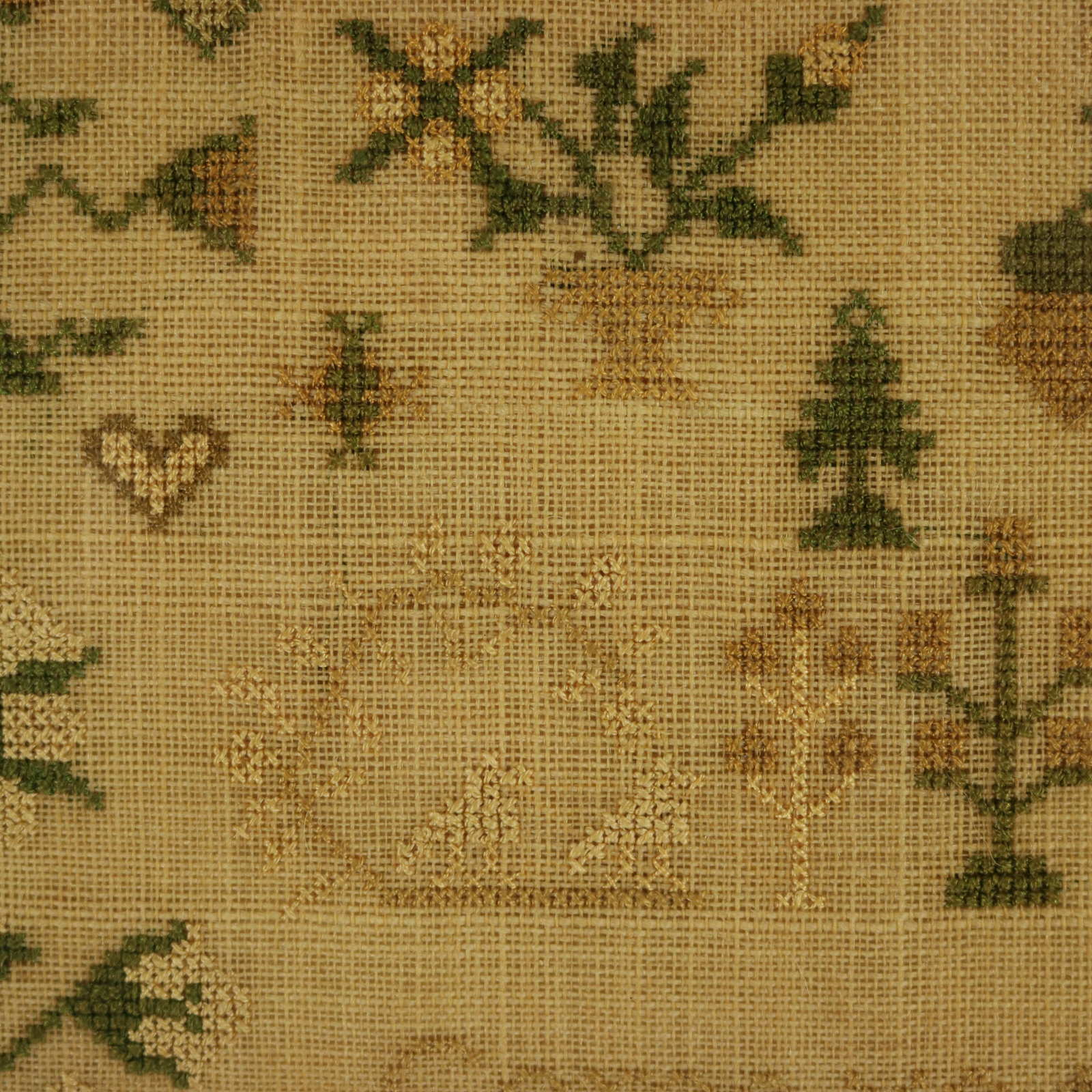 The sampler is worked in silk on a linen ground, mainly in cross stitch.
