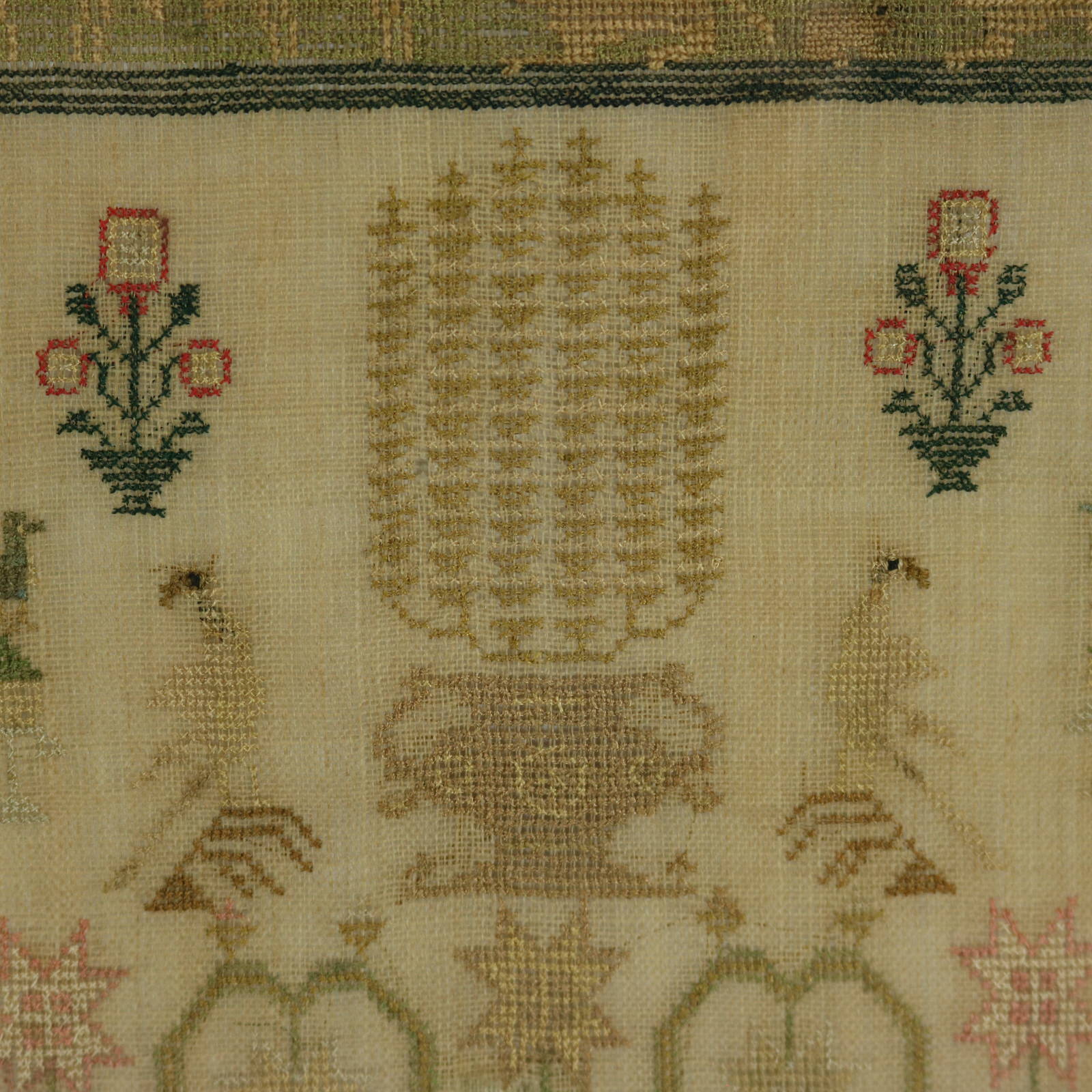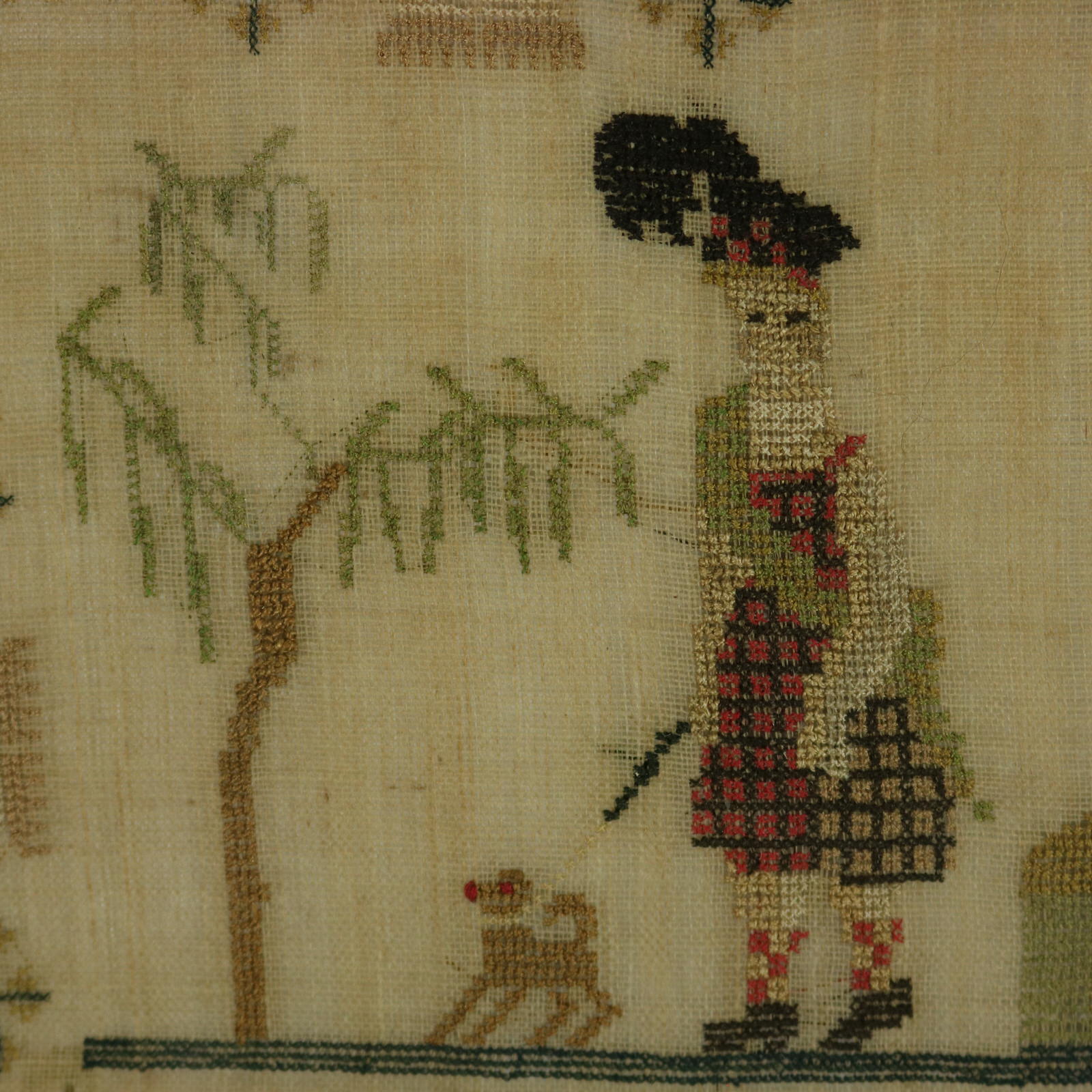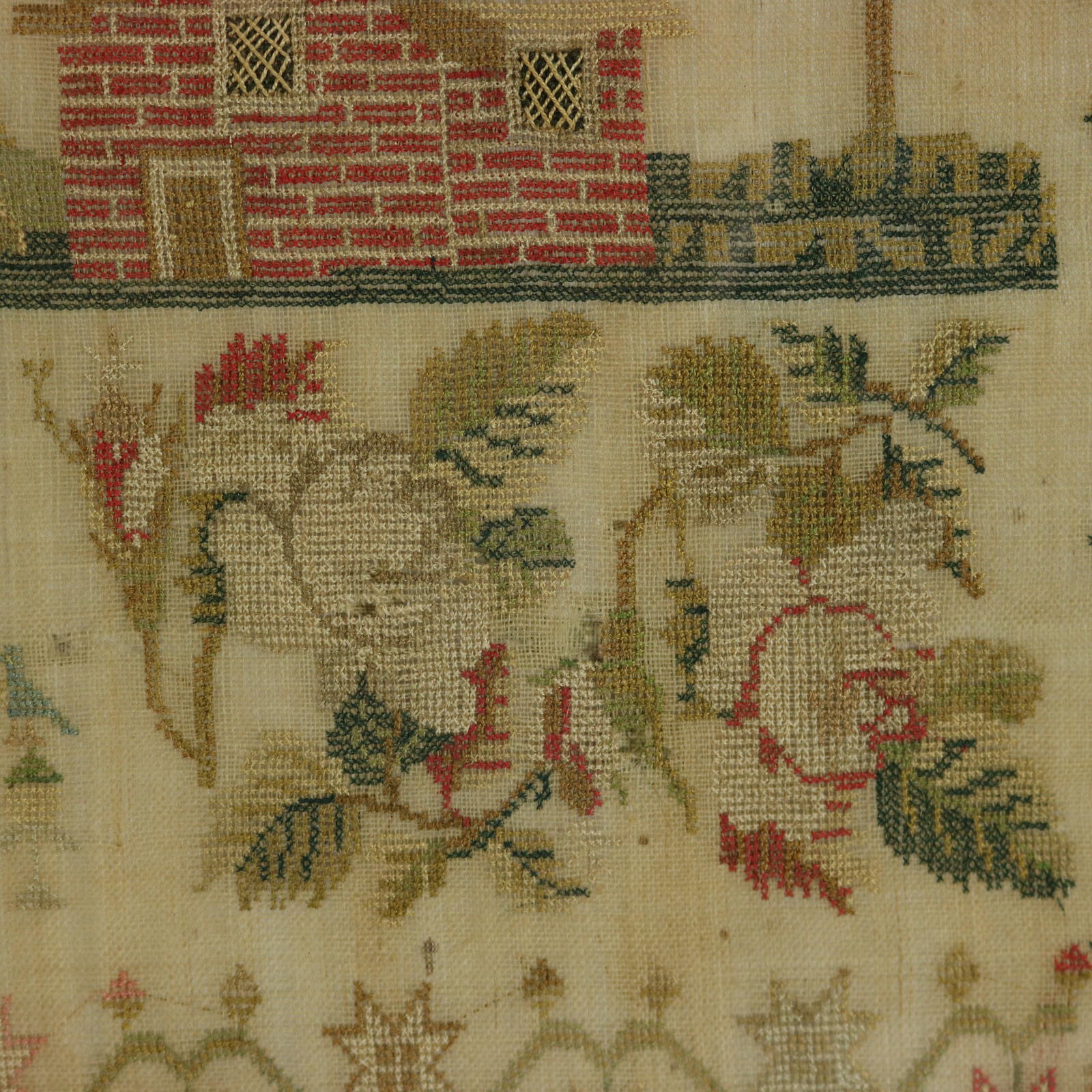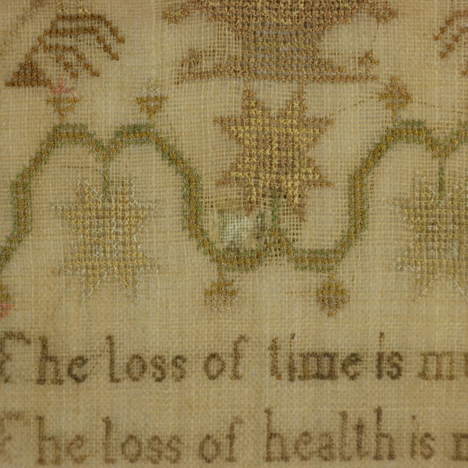 The sampler is worked in silk a on linen ground, in cross stitch.