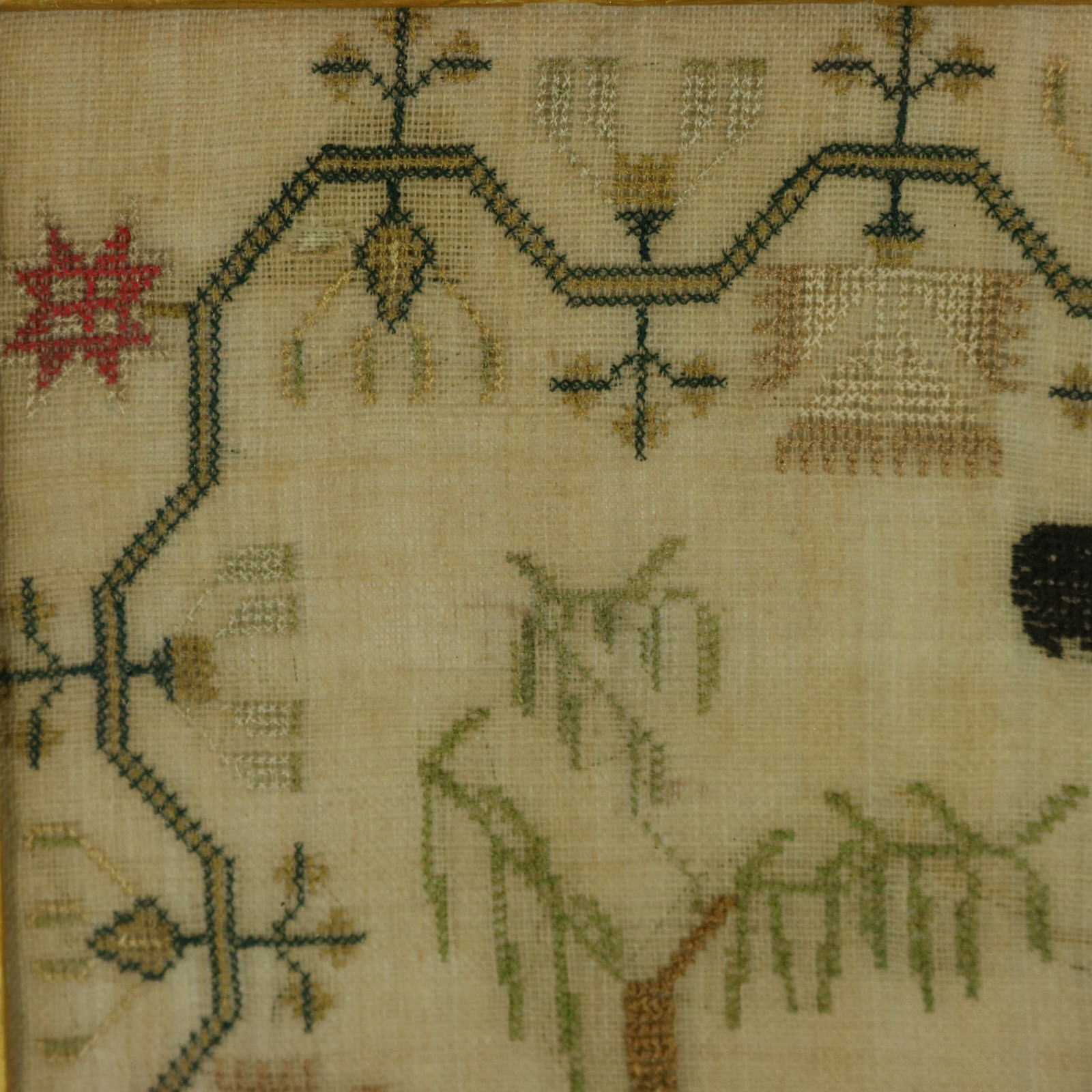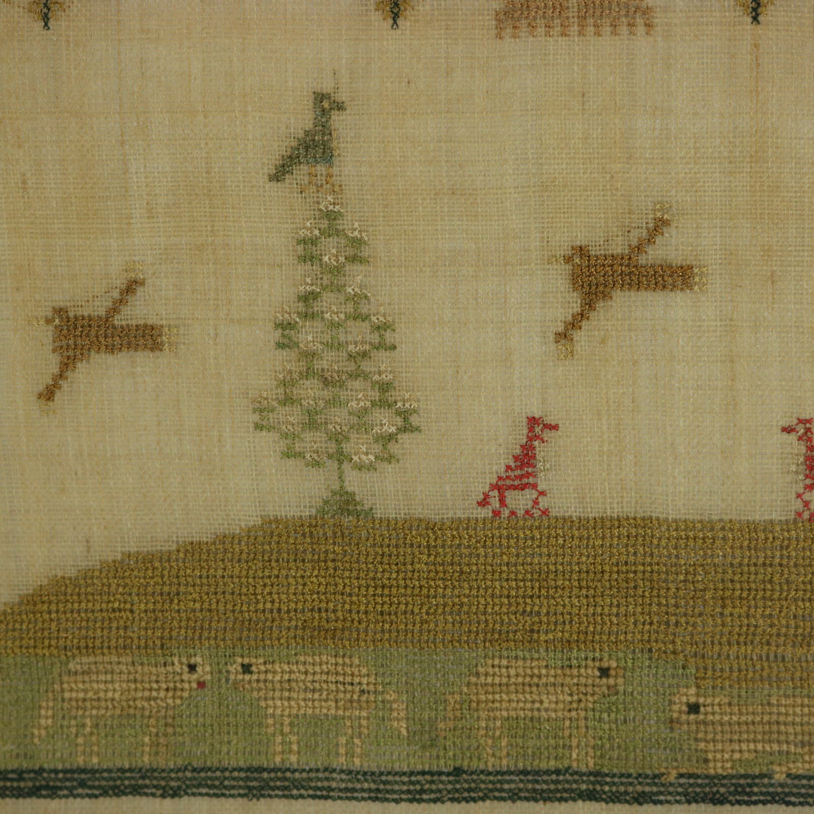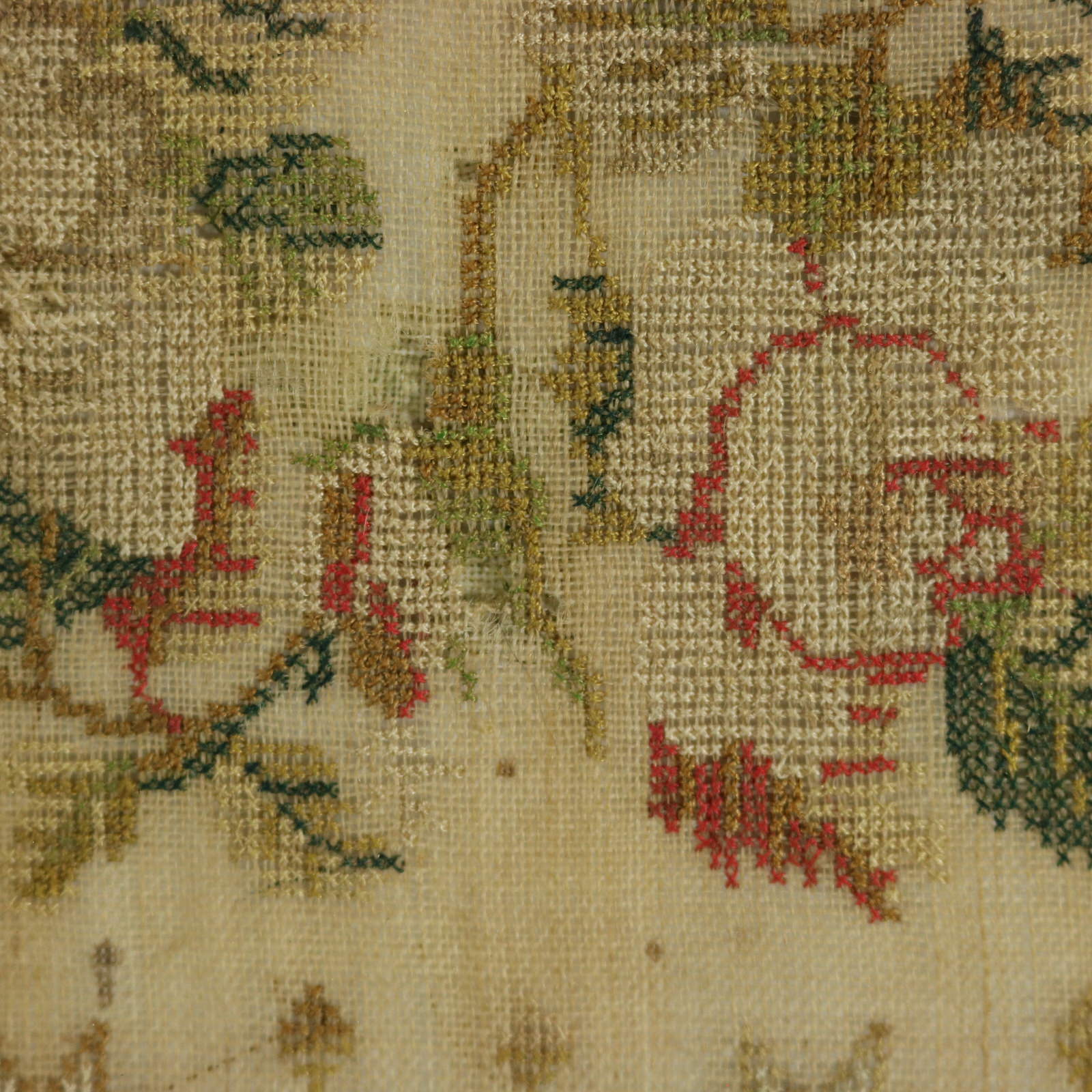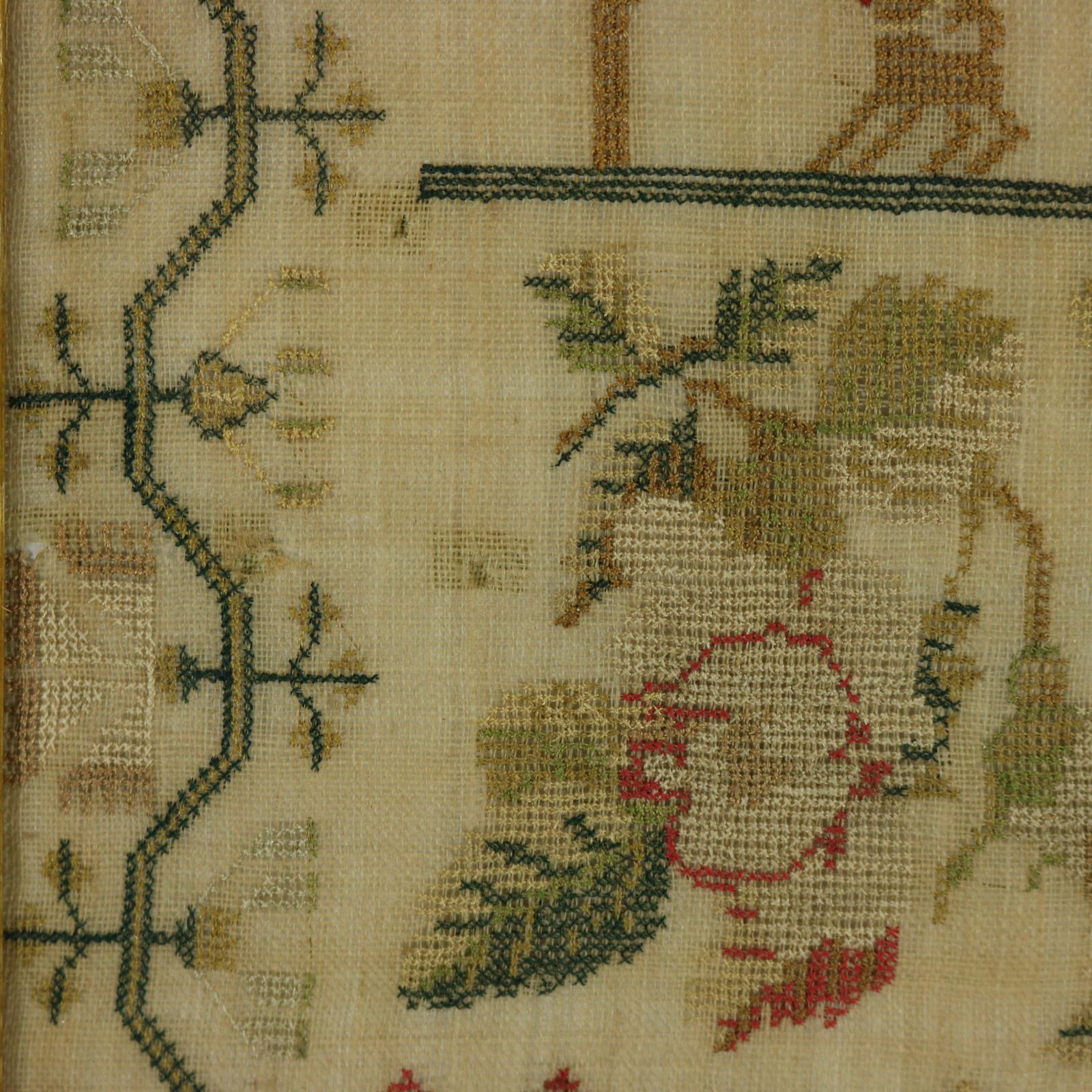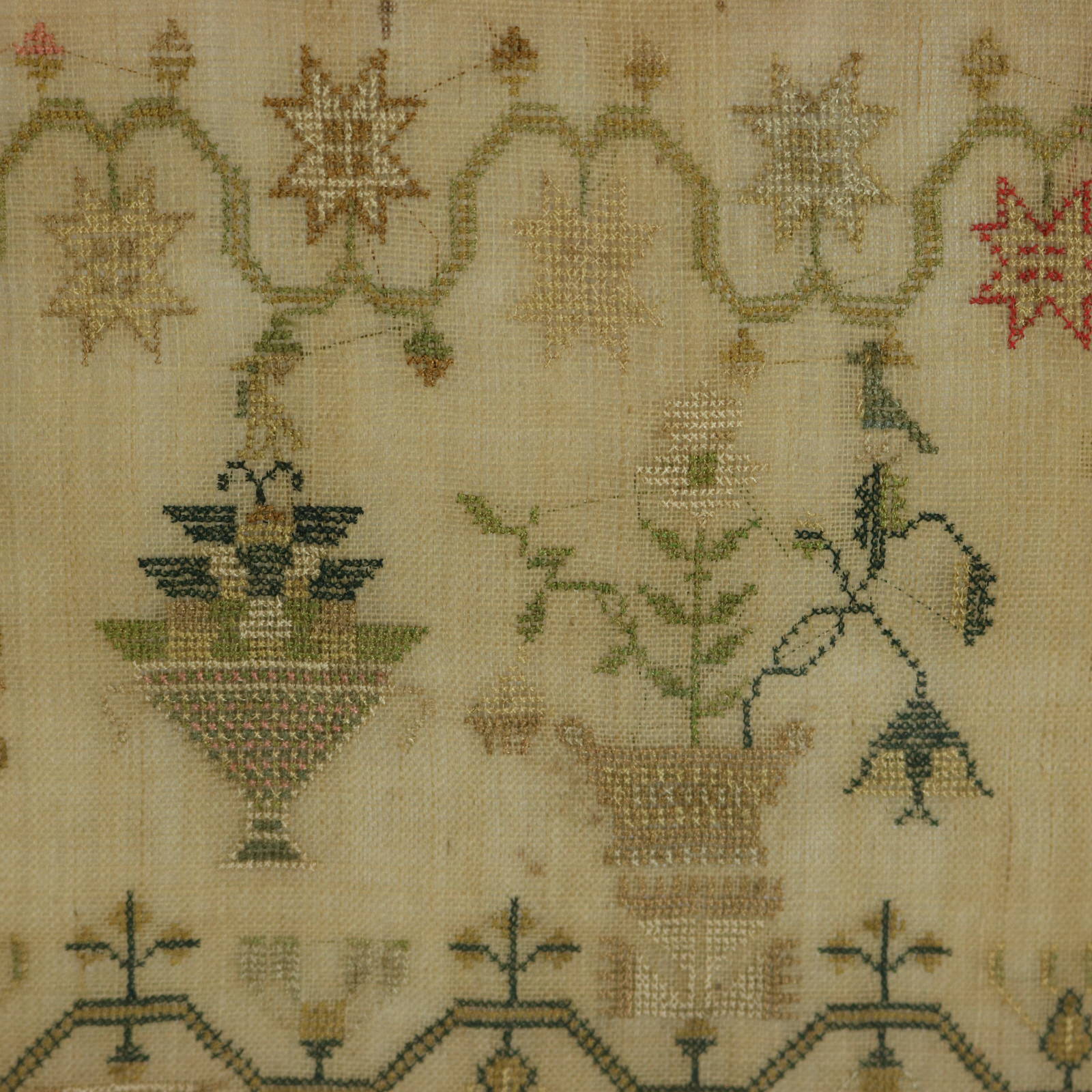 The sampler is worked in silk a on linen ground, in cross stitch.