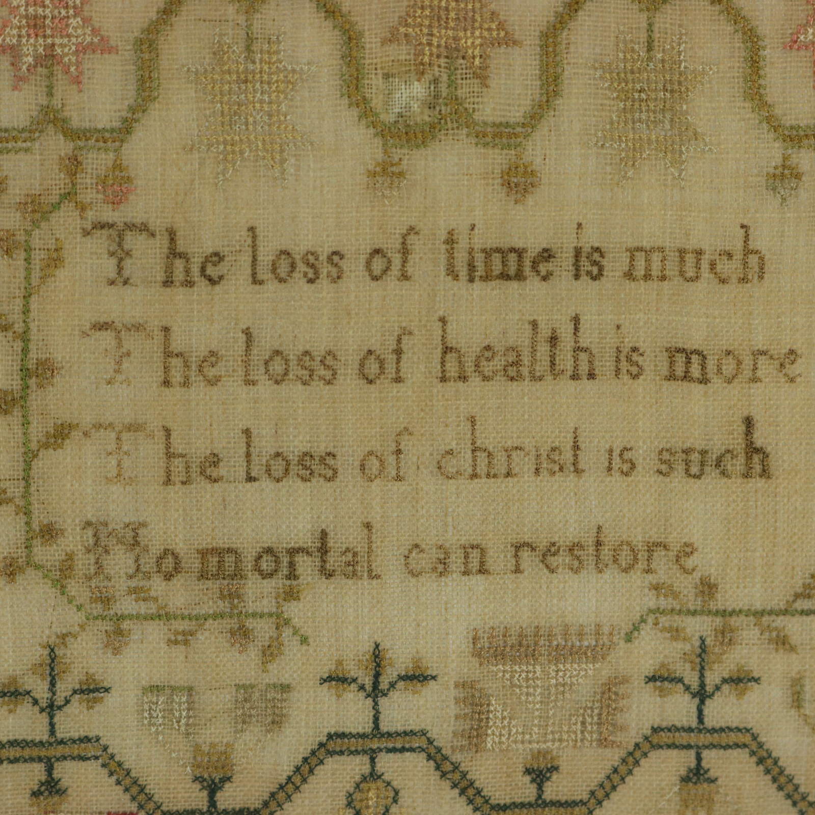 Verse reads, 'The loss of time is much, The loss of health is more, The loss of christ is such, No mortal can restore'.