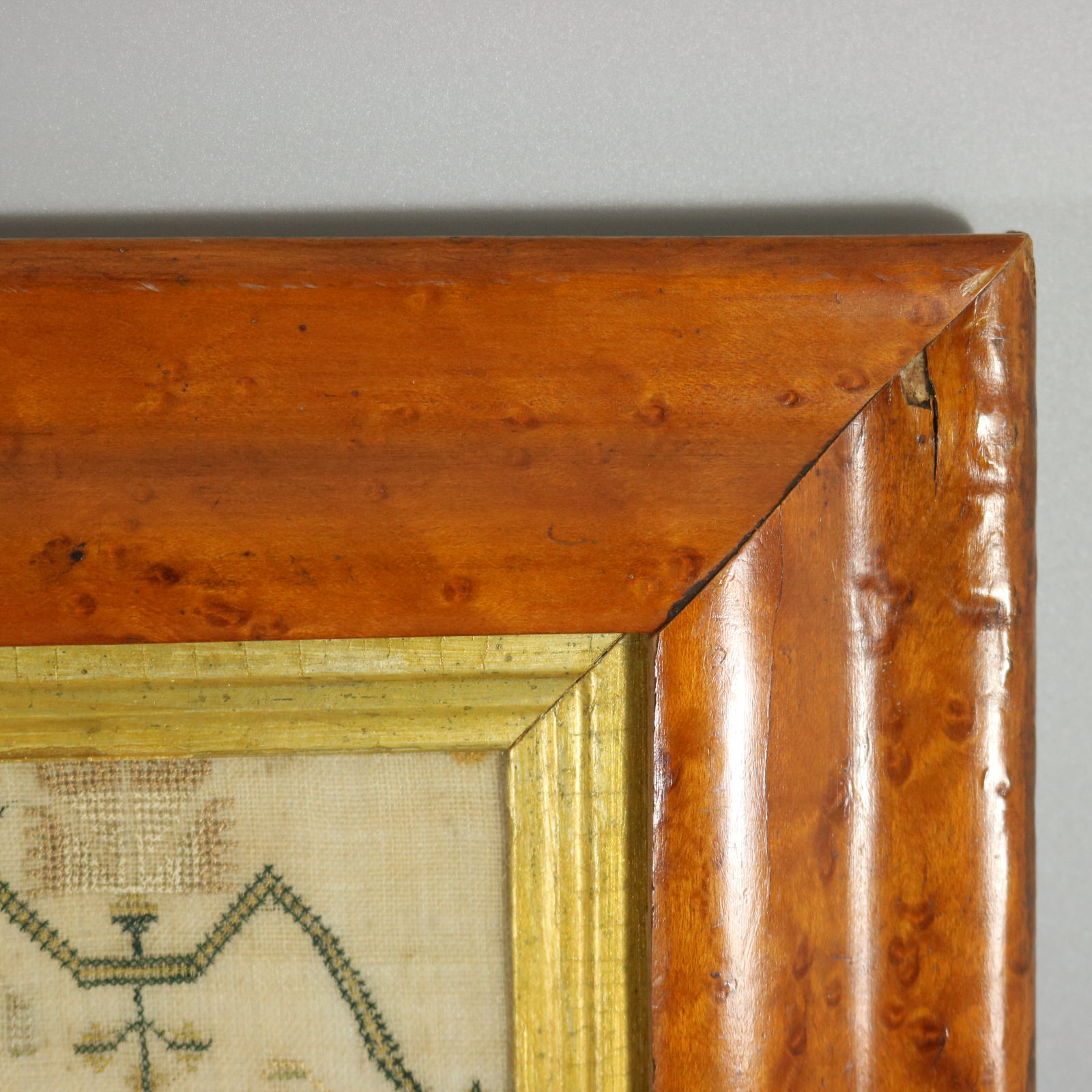 Framed in an old, burr maple frame with rippled, dimpled, old glass.