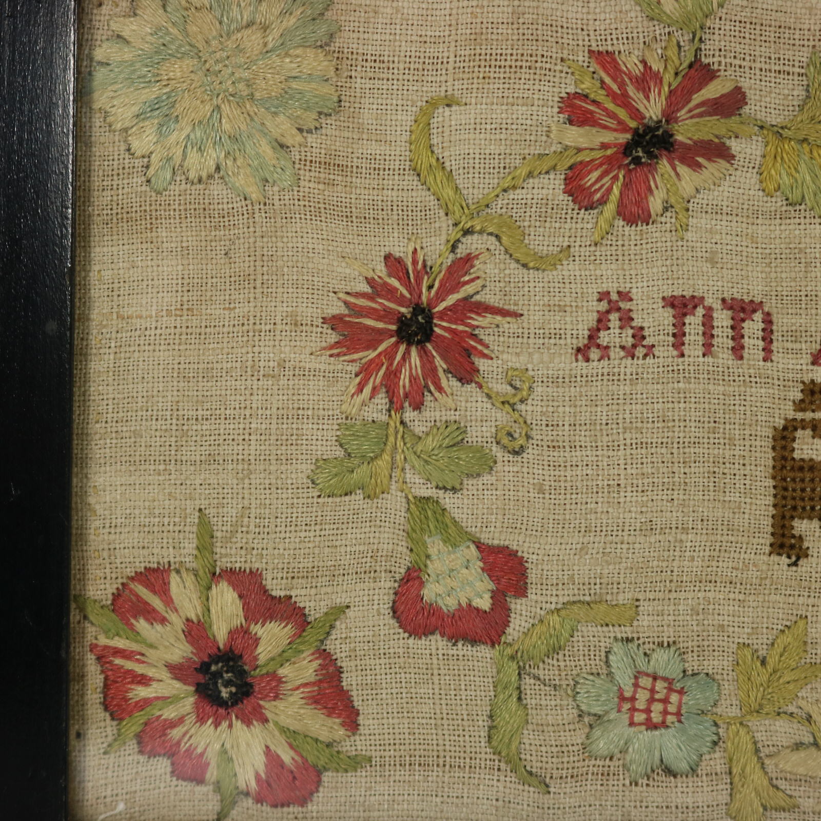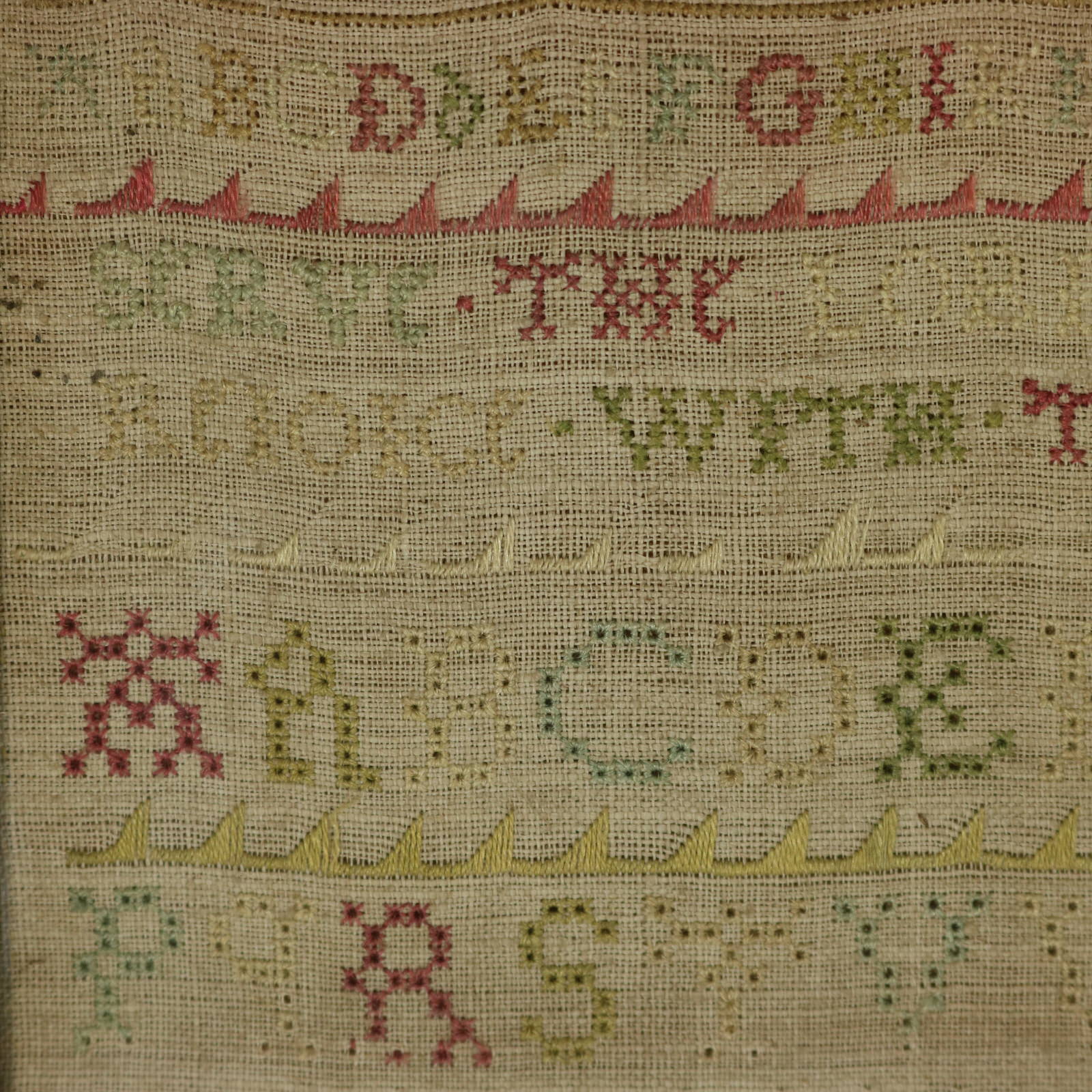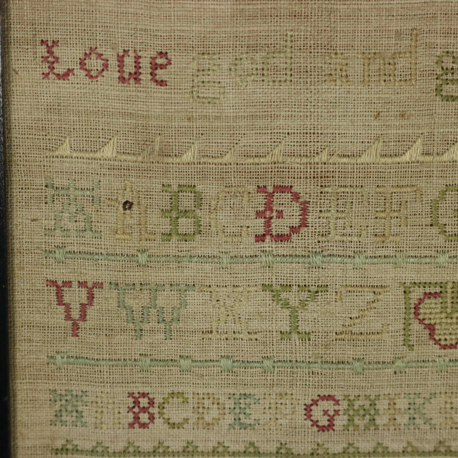 Very light patchy staining in places. Some stitch loss to the divider lines and letters.