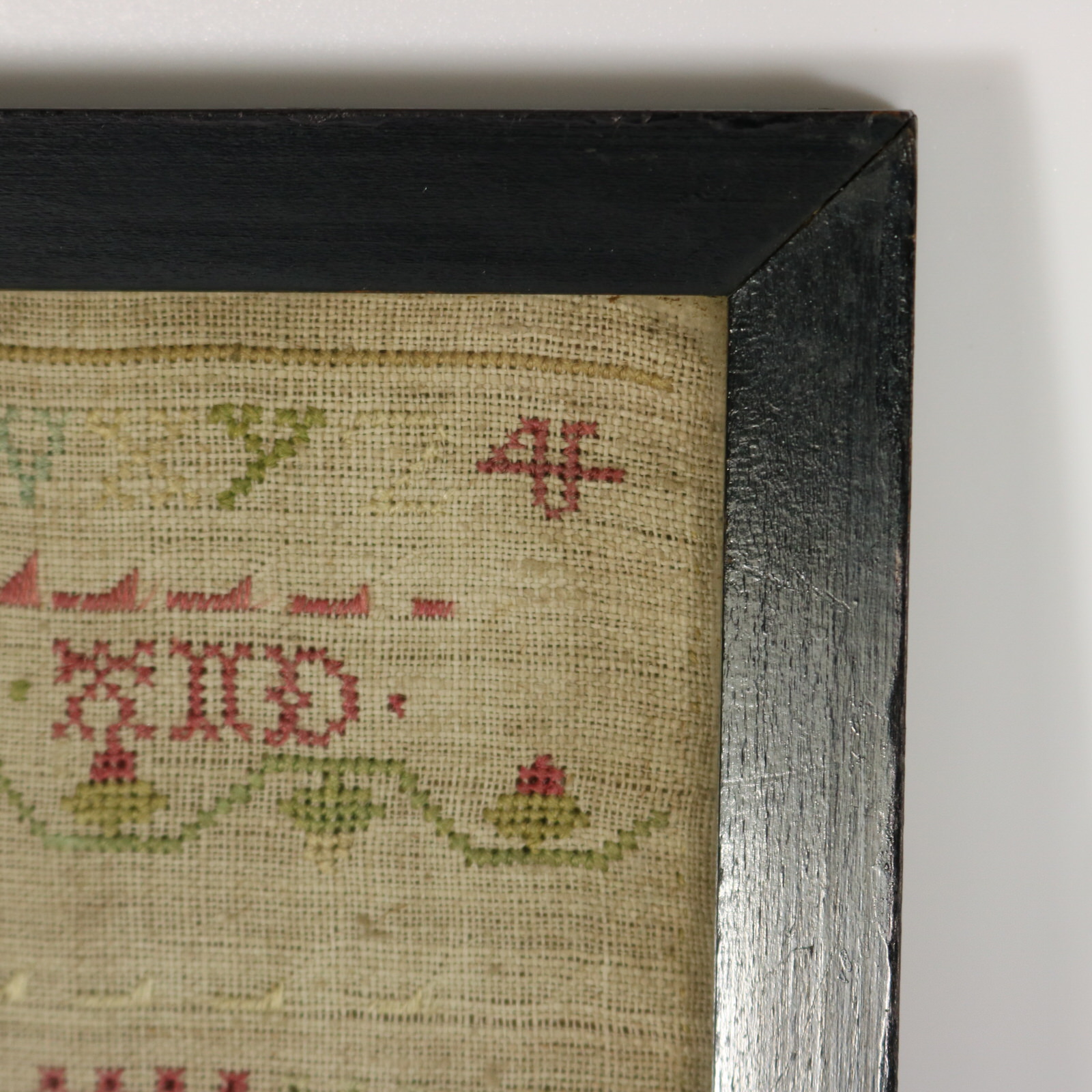 Mounting: The sampler is tacked to board. Frame backed with wood and sealed with tape.