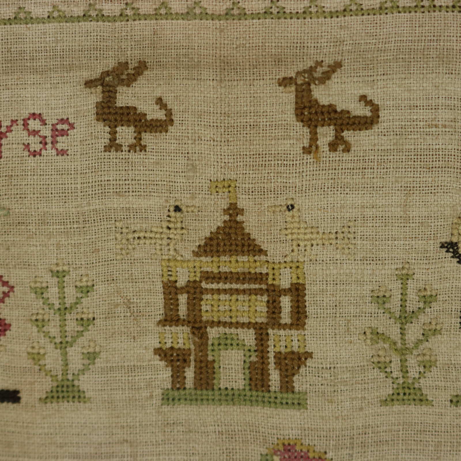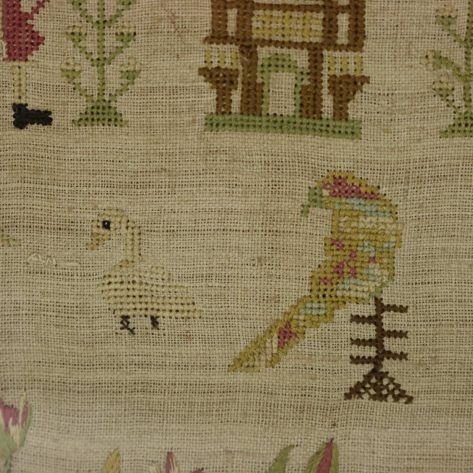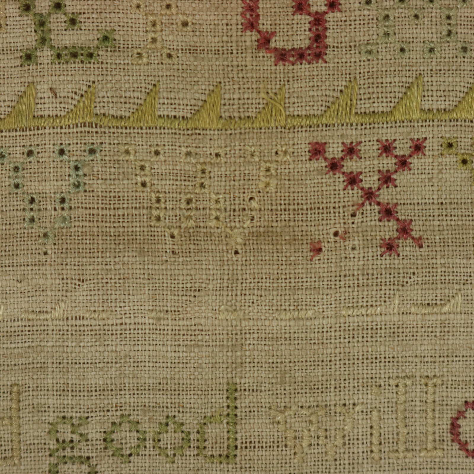 The sampler is worked in silk on a linen ground, in a variety of stitches.