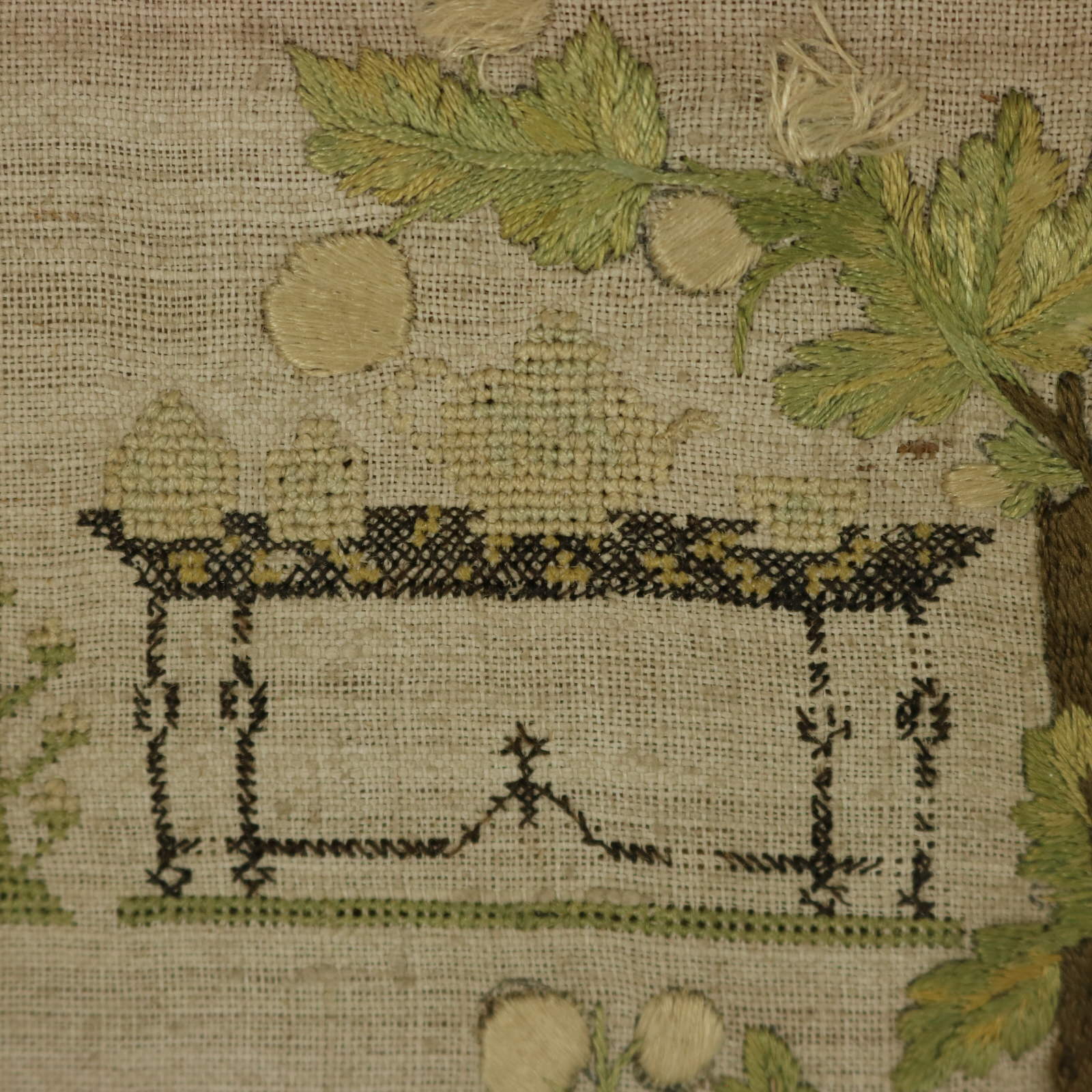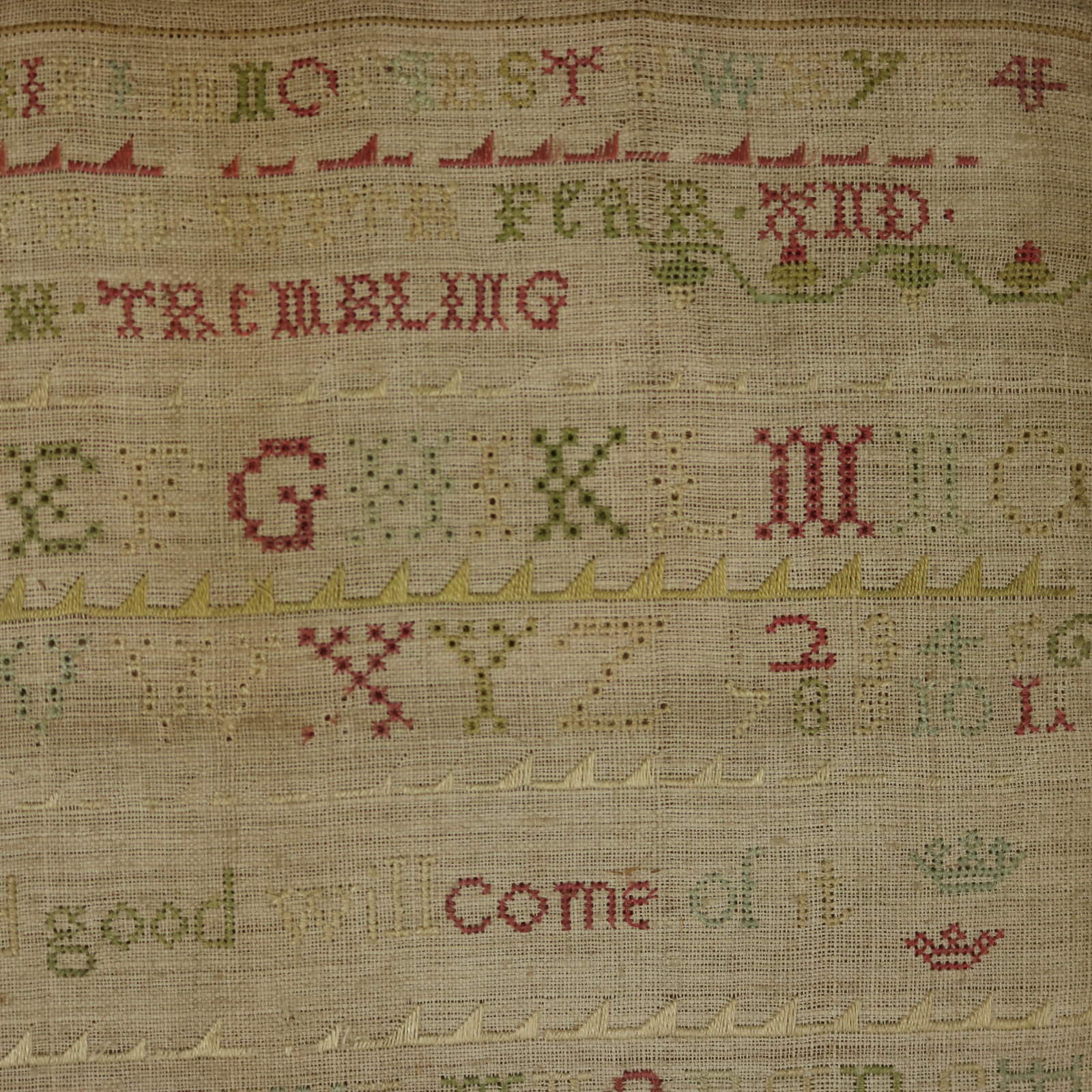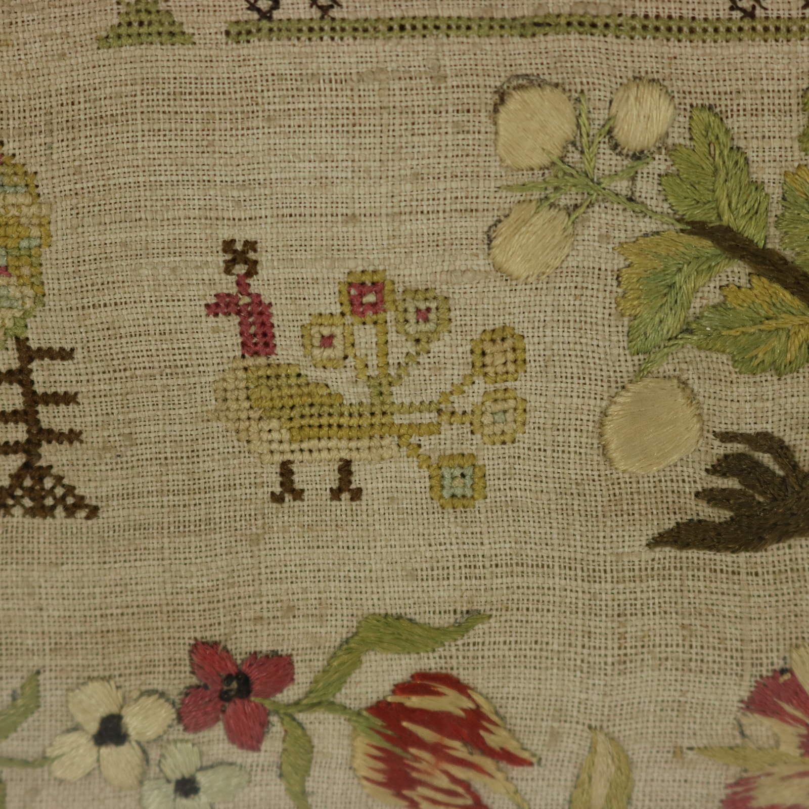 The sampler is worked in silk on a linen ground, in a variety of stitches.