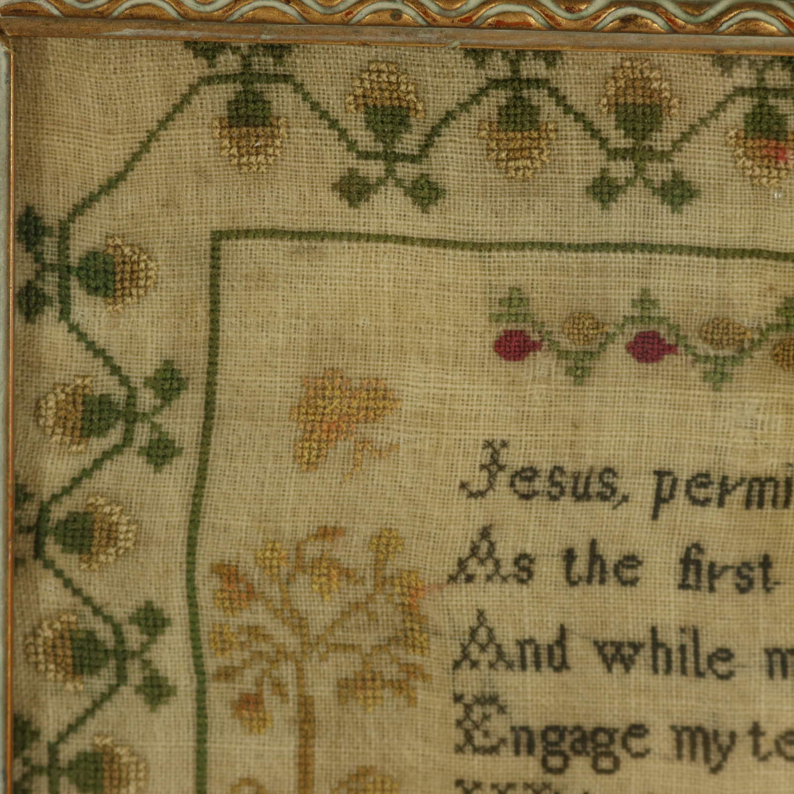 Verse reads, 'Jesus, permit thy gracious name to stand, As the first effort of my infant hand, And while my fingers o'er the canvass move, Engage my tender heart to seek thy love. With thy dear children let me share a part, And write my name, dear Jesus on thy heart.'.
