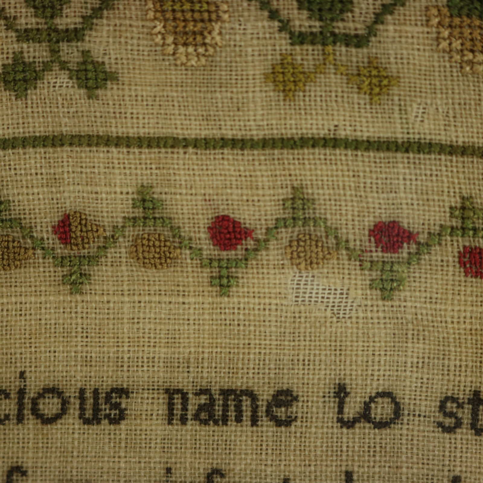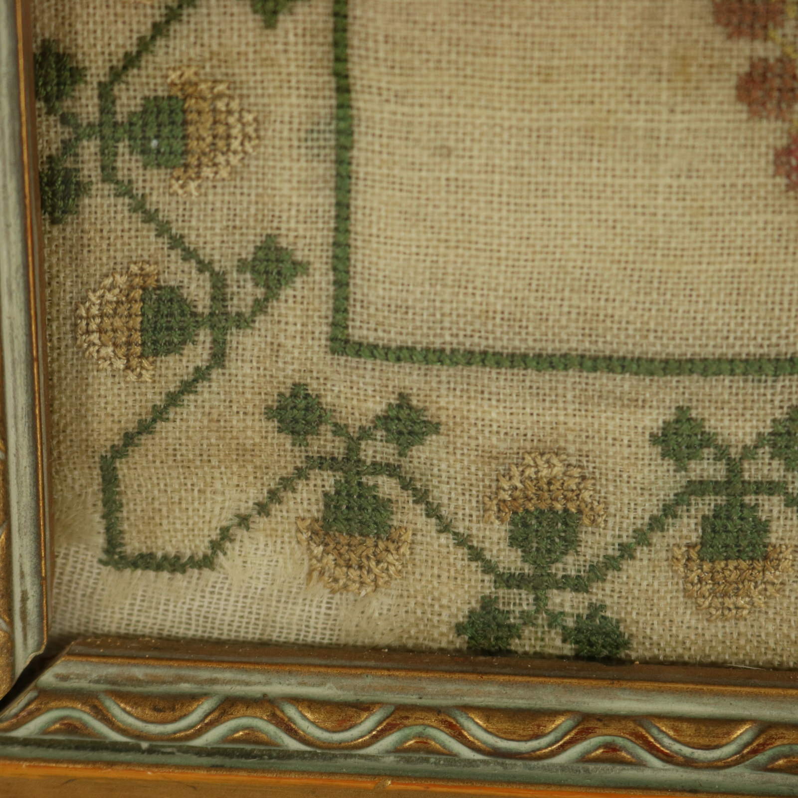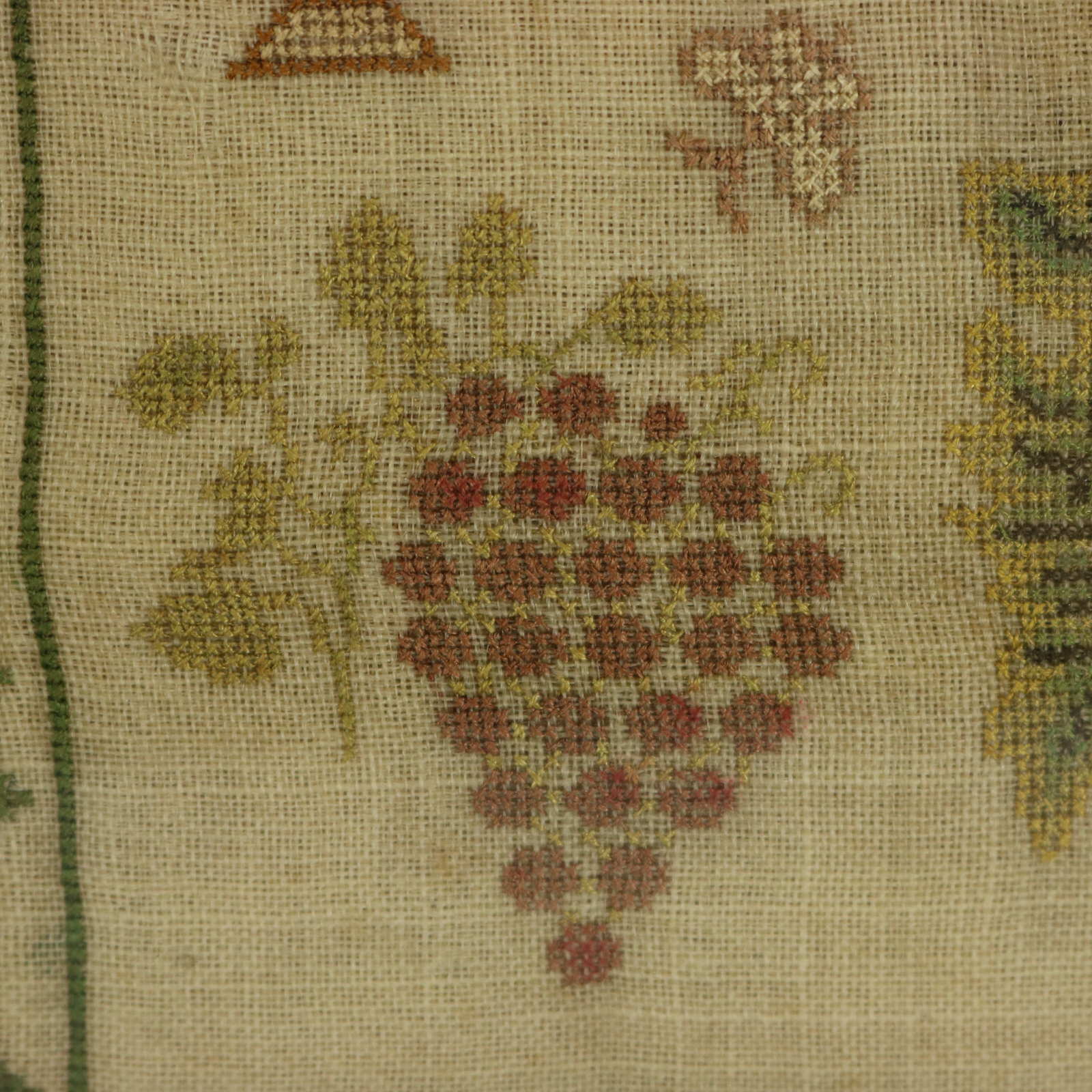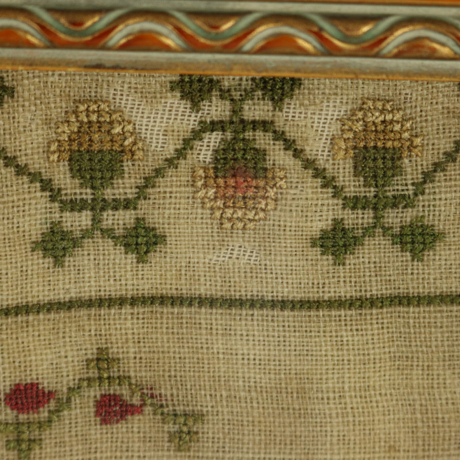 Mounting: The sampler is loose mounted onto linen and pressed to the glass.
