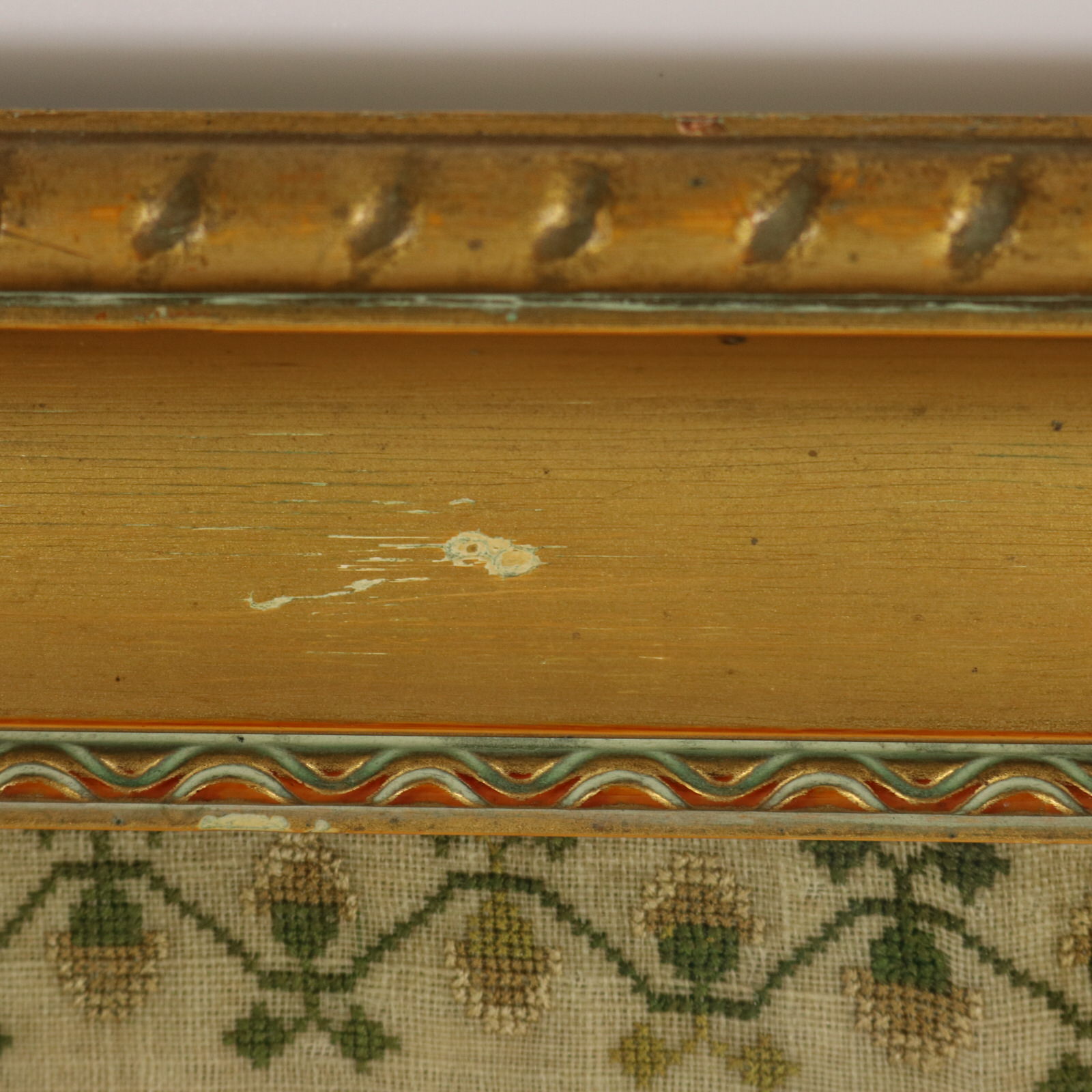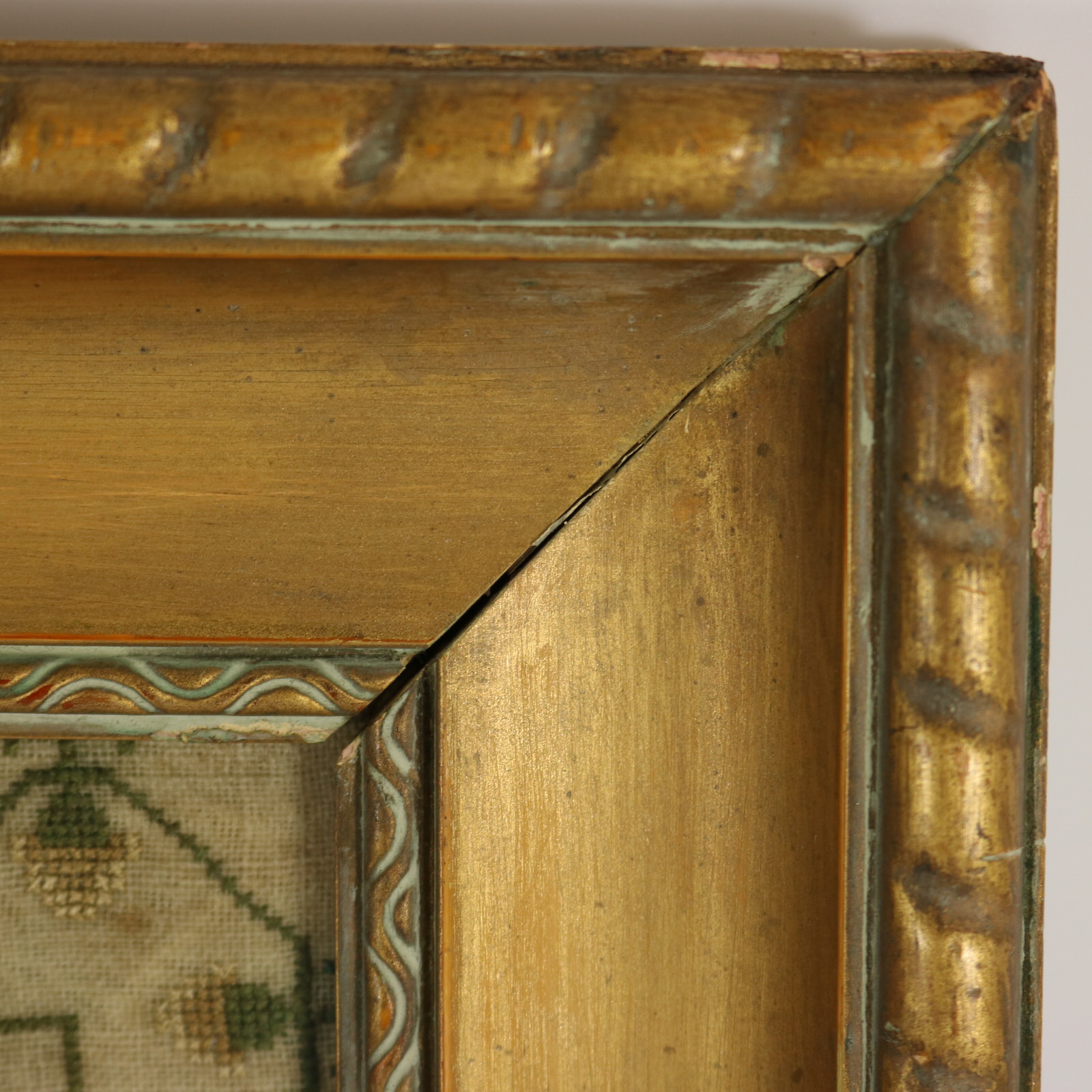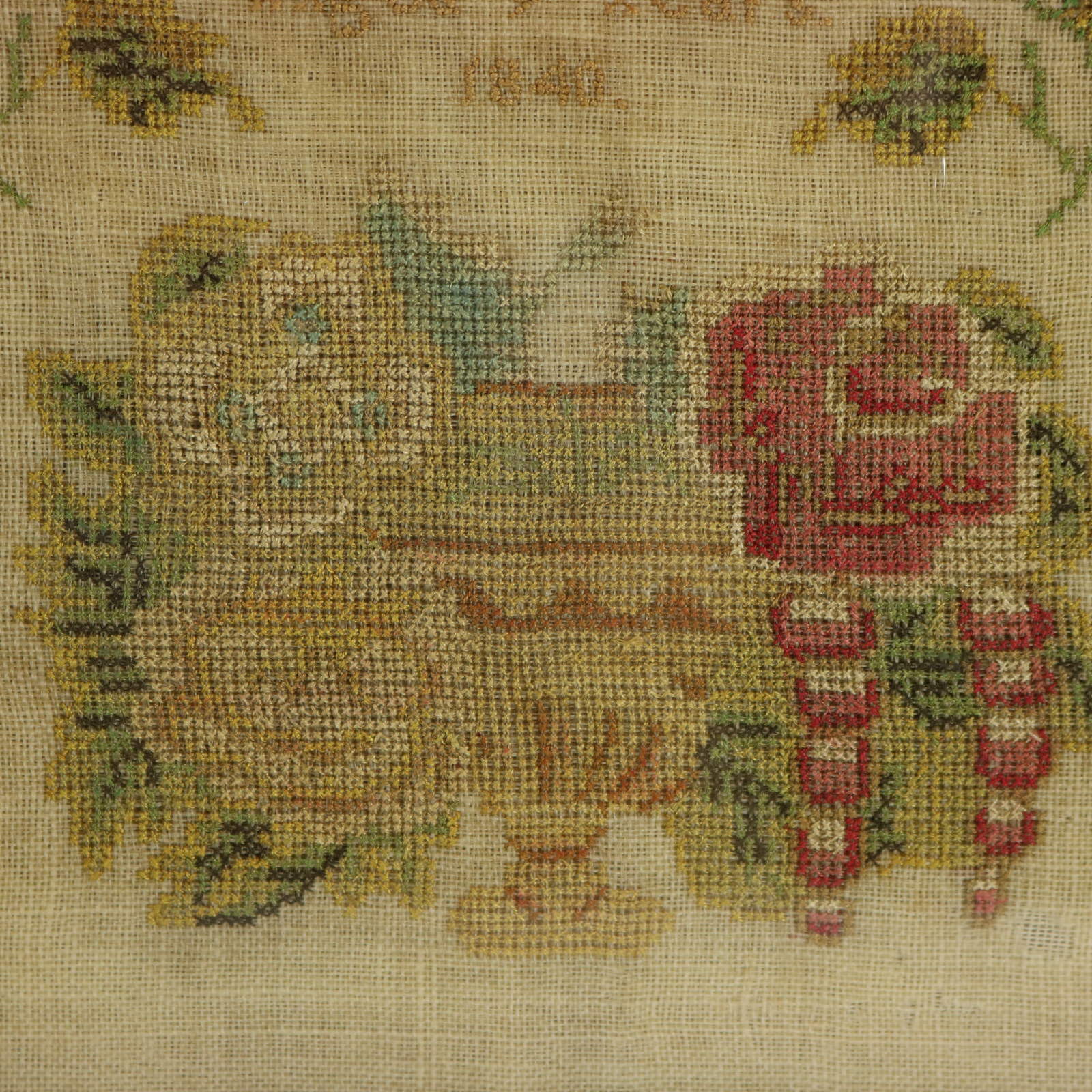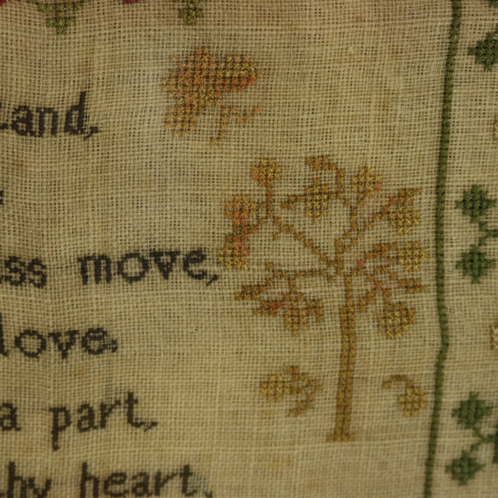 Mounting: The sampler is loose mounted onto linen and pressed to the glass.