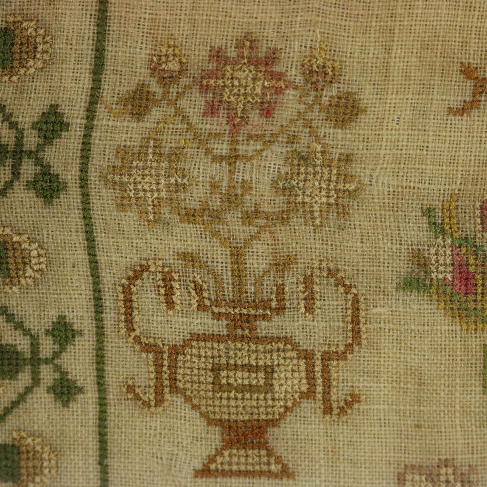 The sampler is worked in silk threads on a linen ground, mainly in cross stitch.