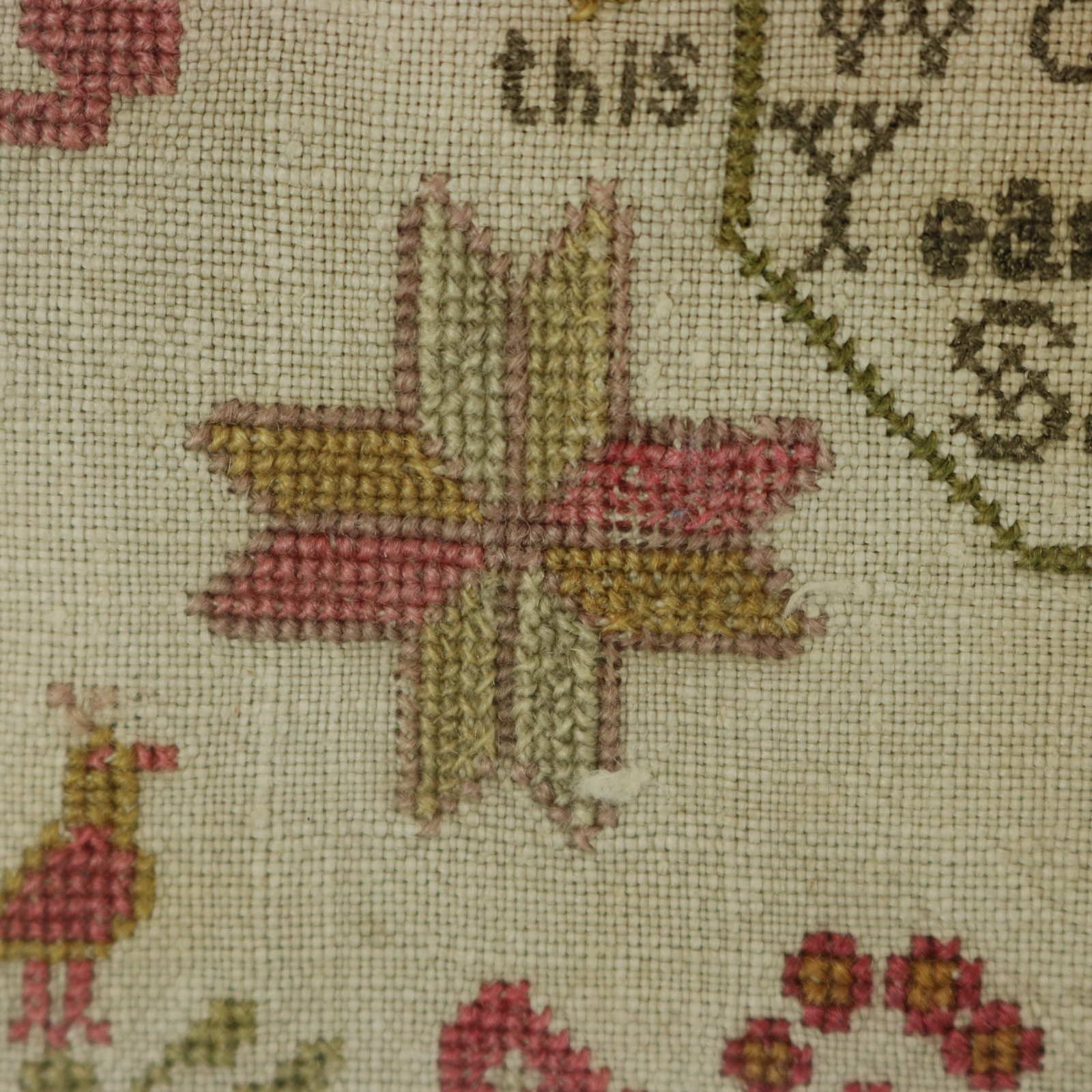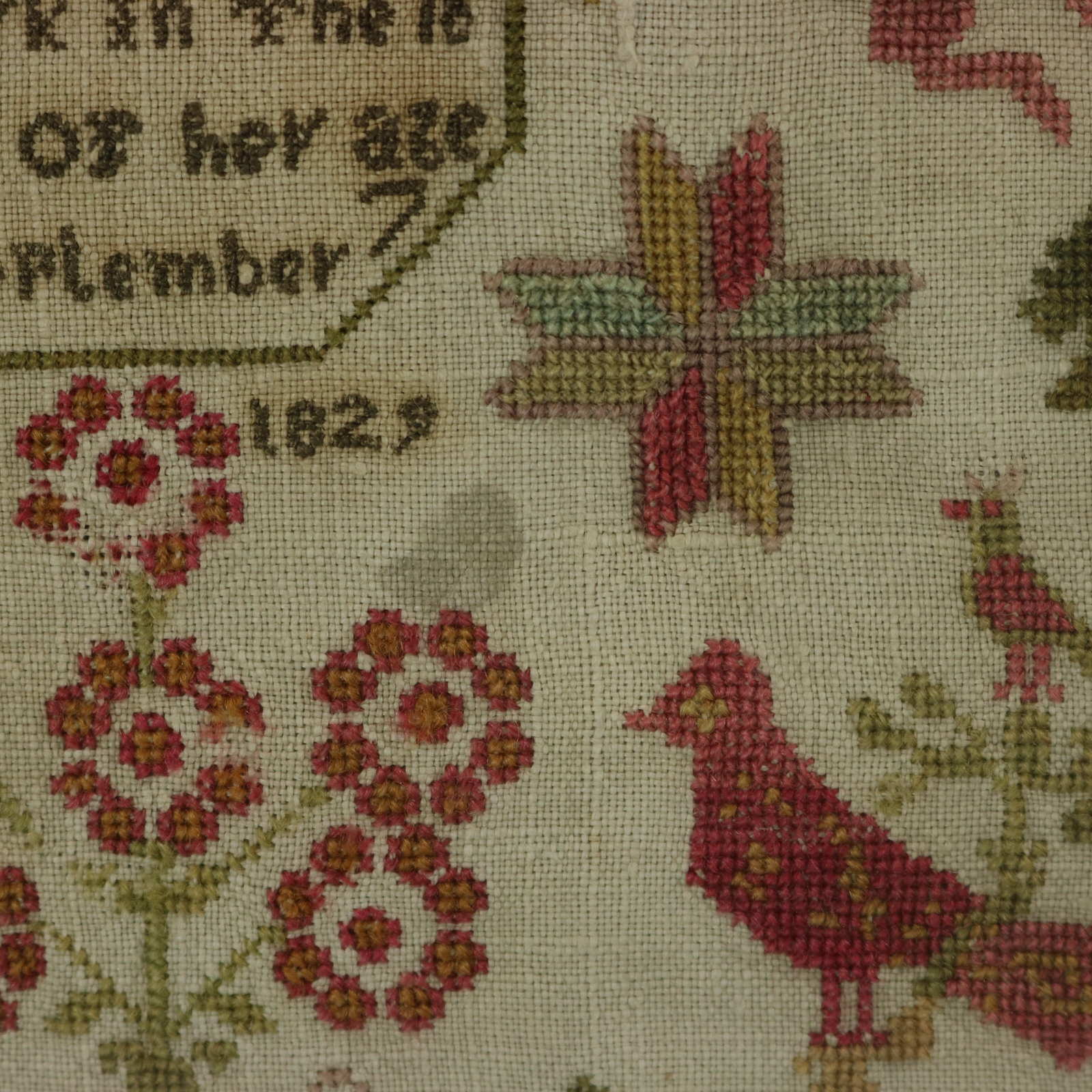 The samplers are worked in wool threads on a linen ground, mainly in cross stitch.