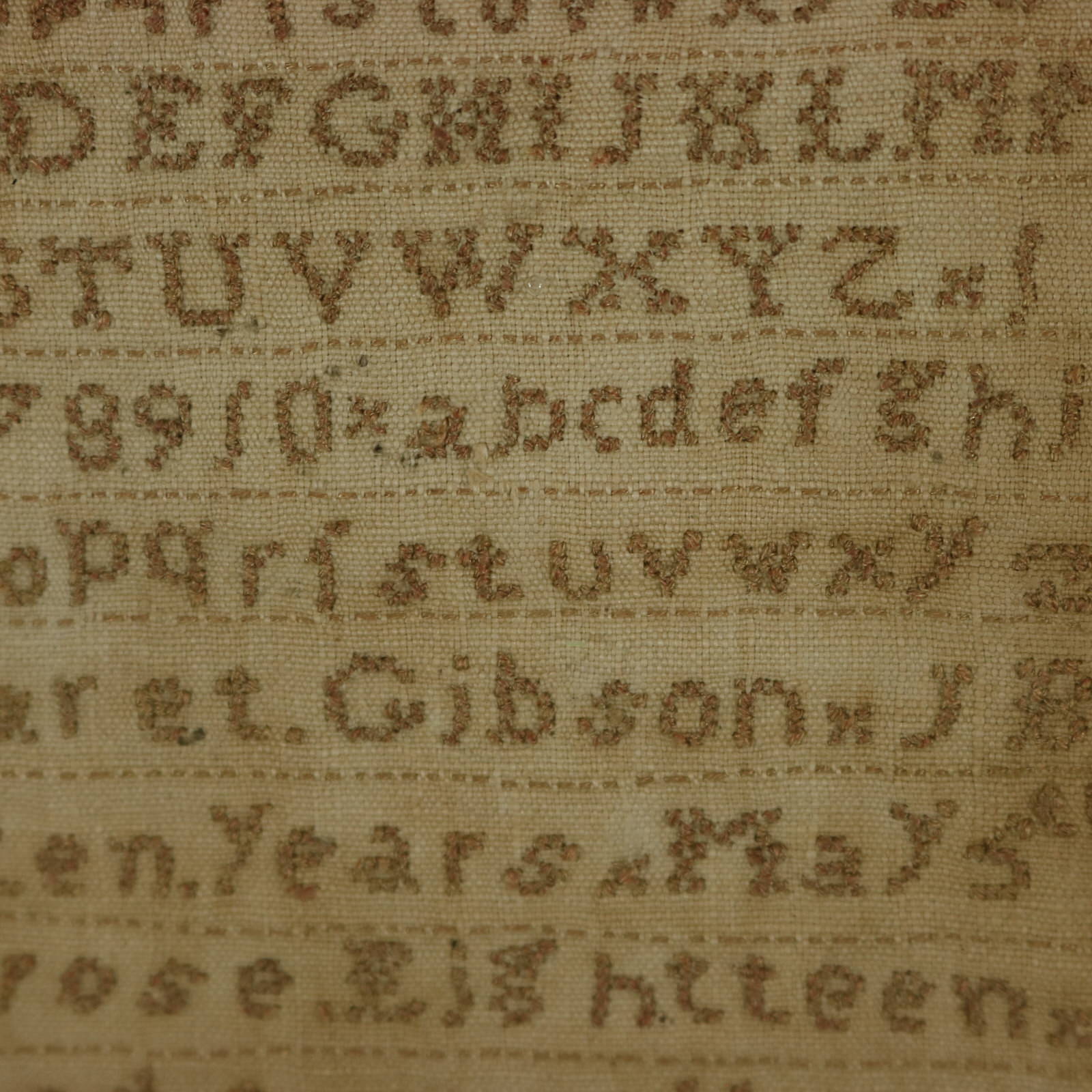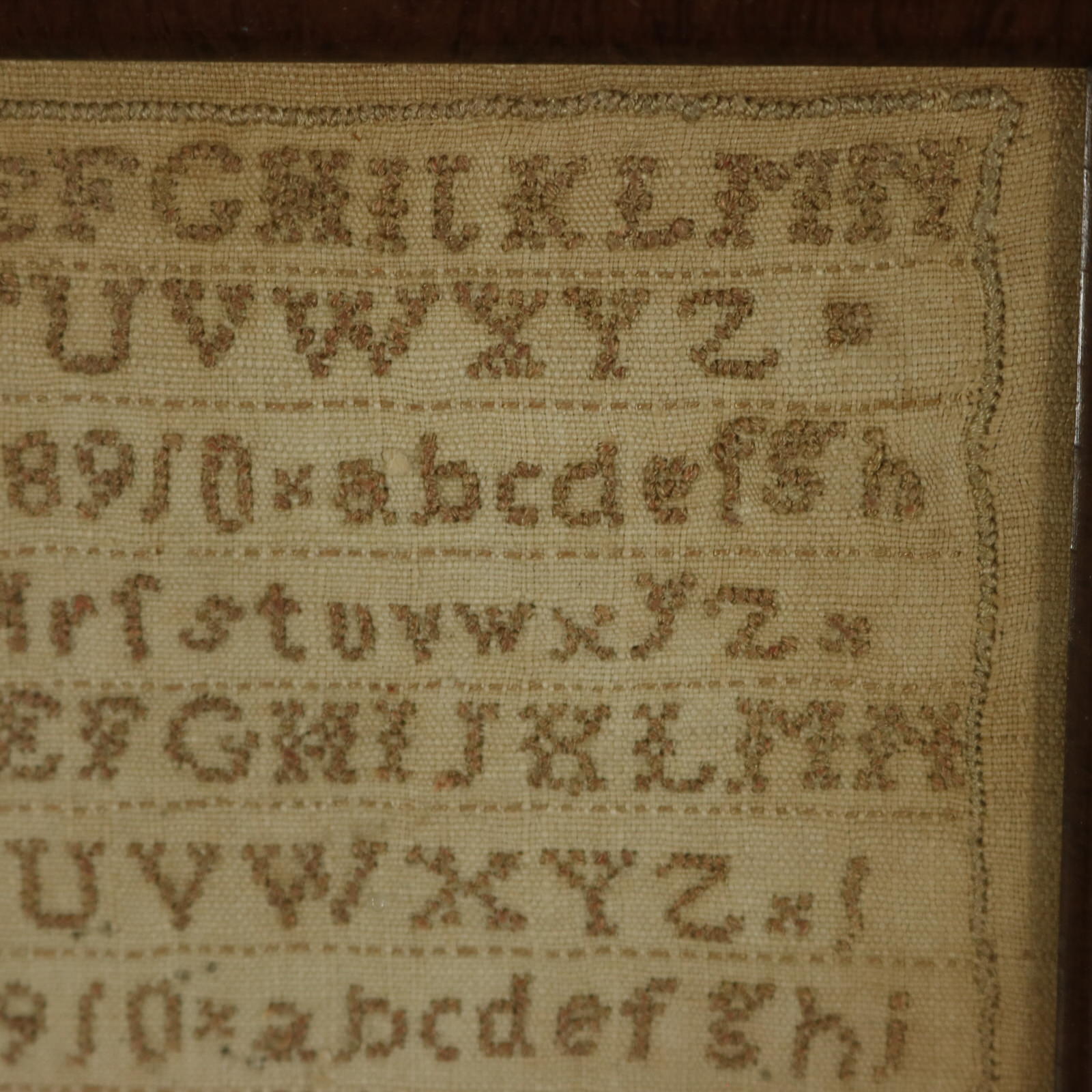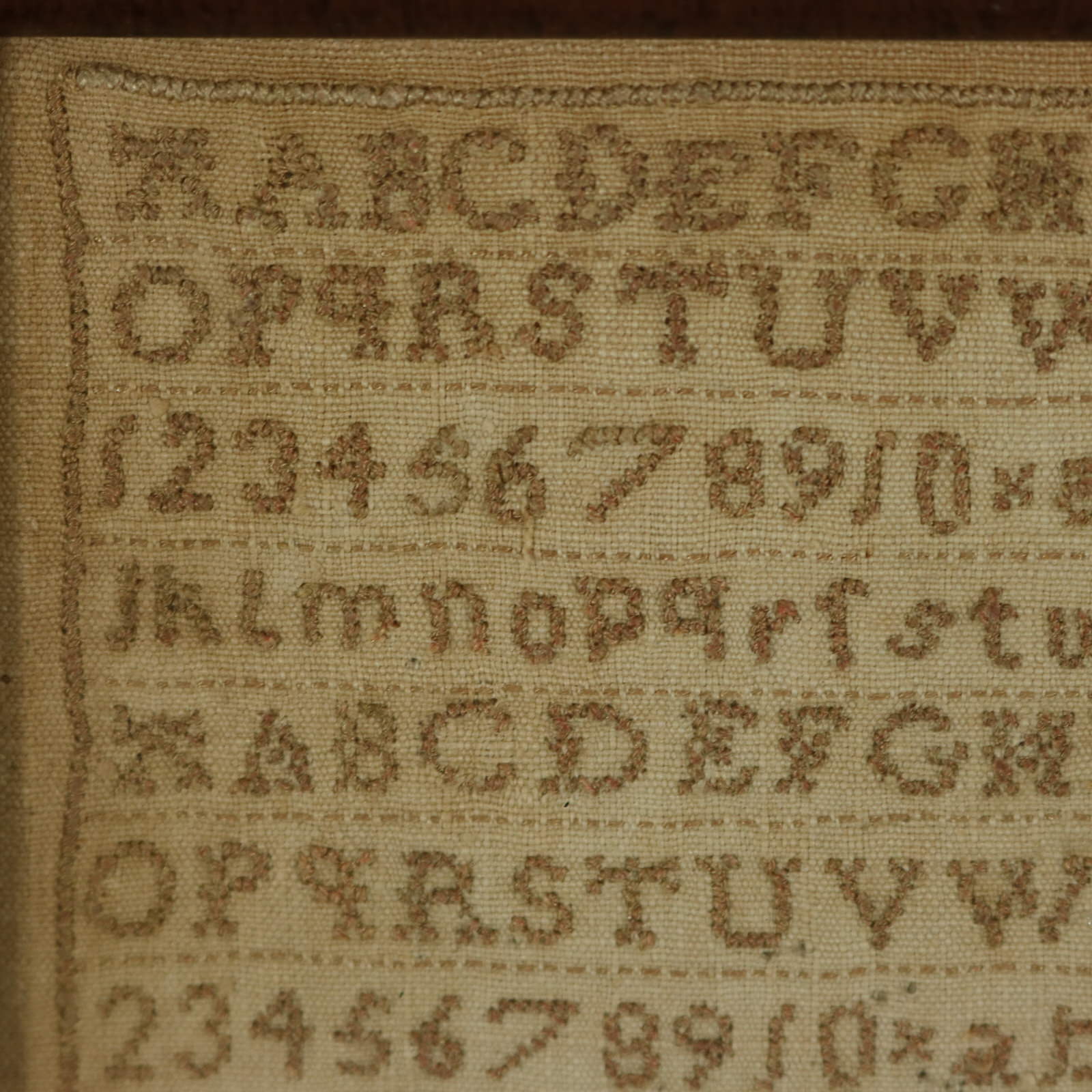 The sampler is worked in a brown cotton-like thread on a linen ground, mainly in cross stitch.