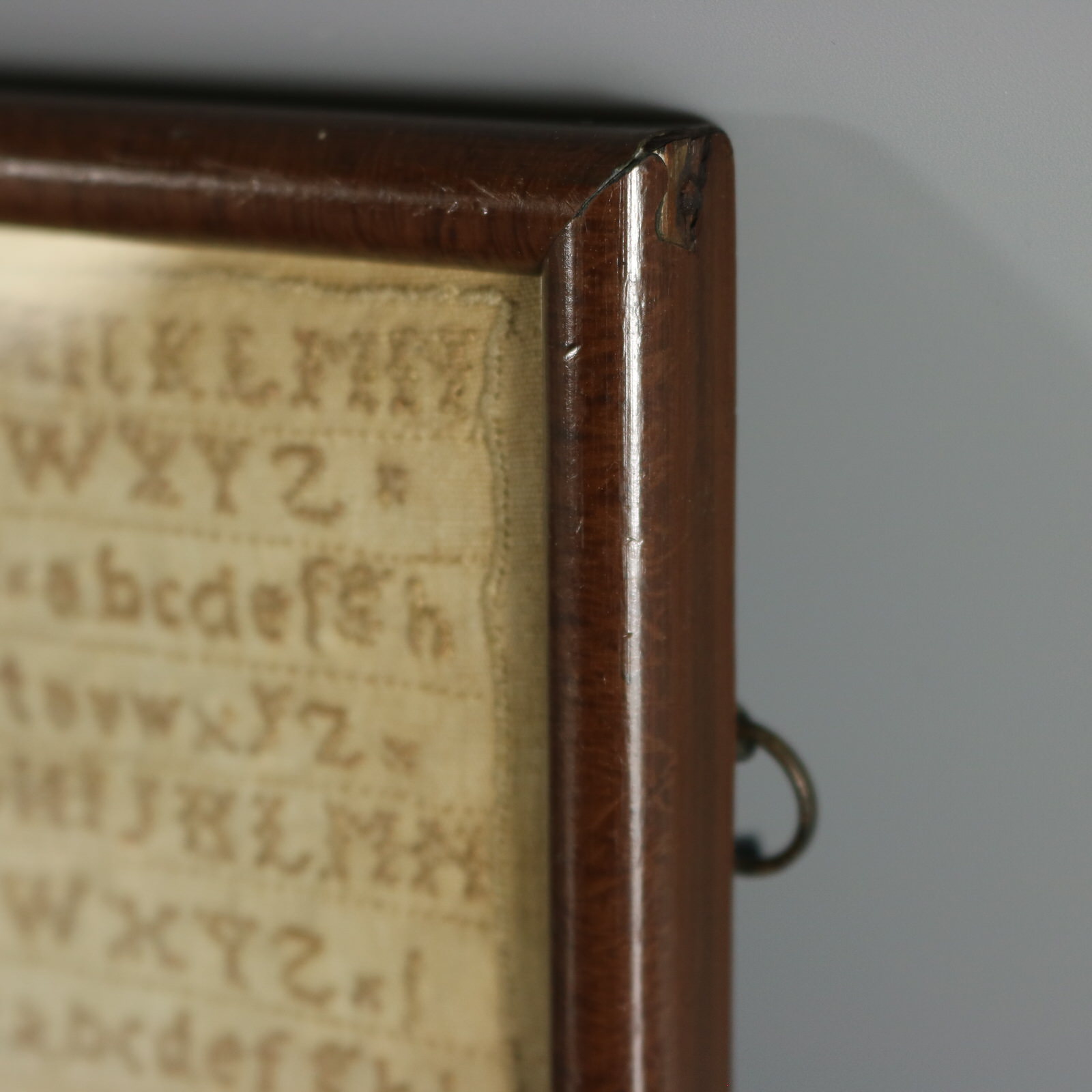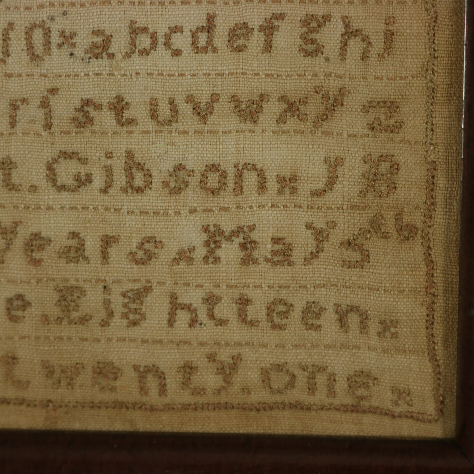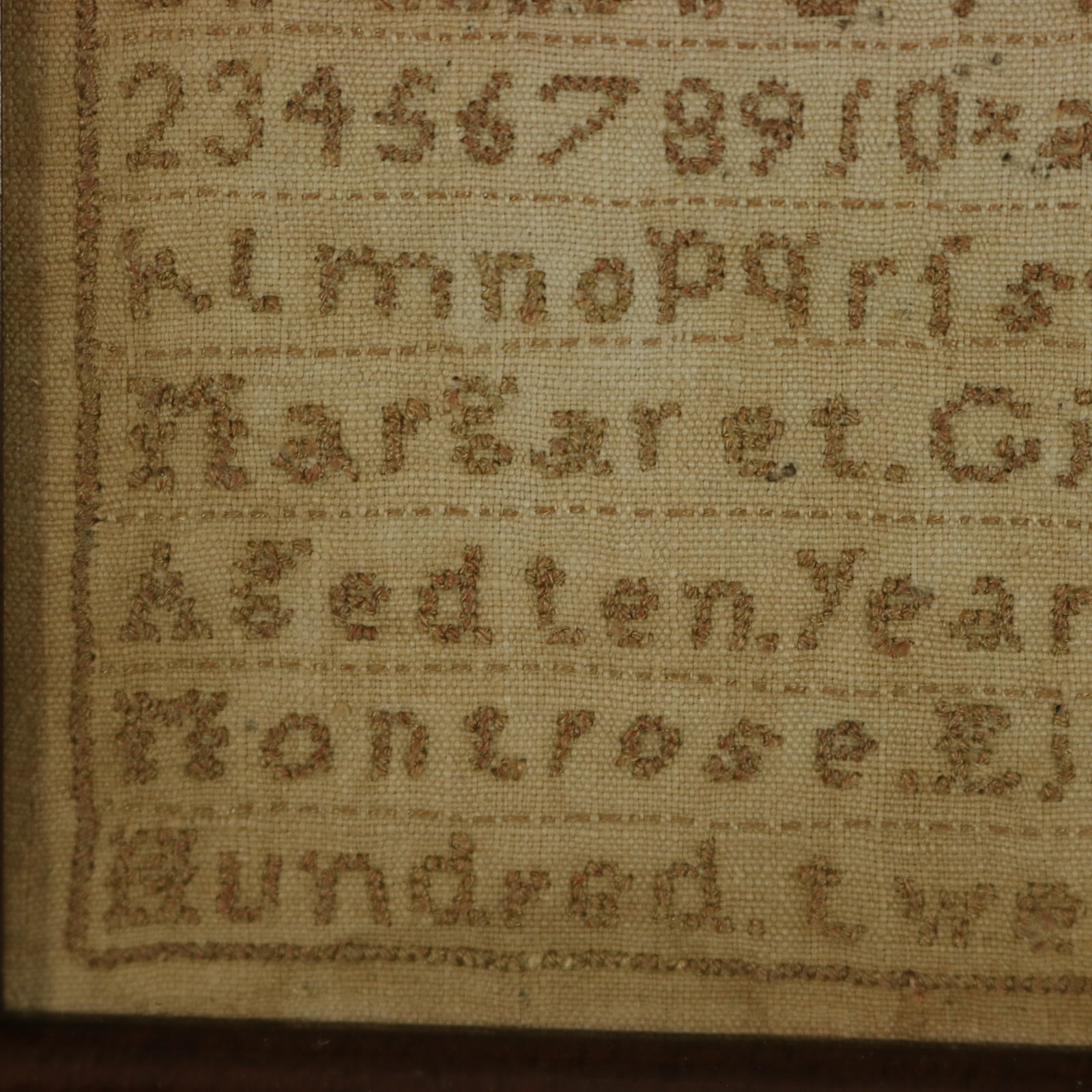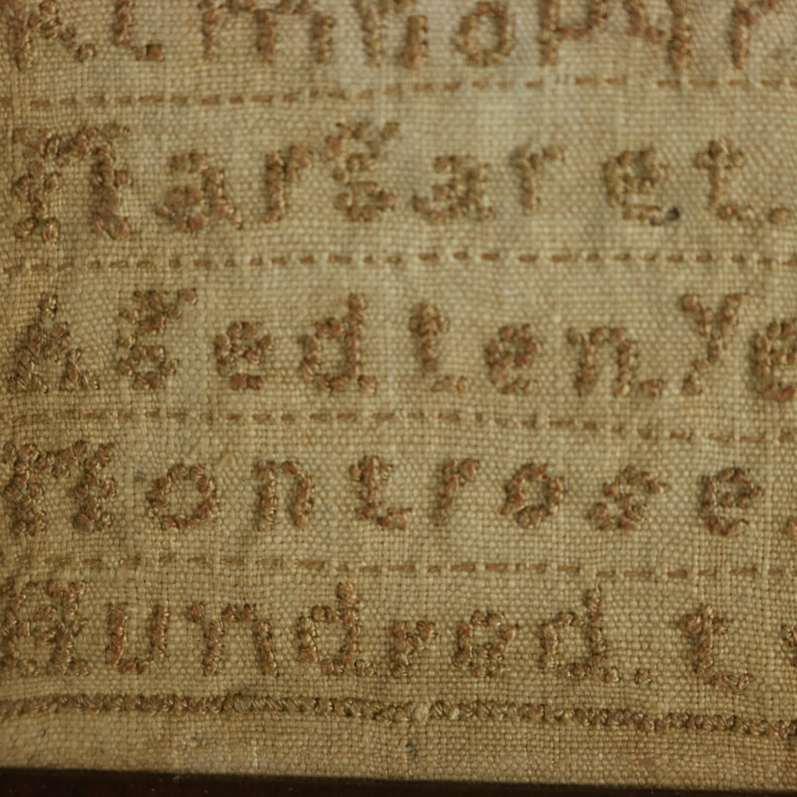 The sampler is worked in a brown cotton-like thread on a linen ground, mainly in cross stitch.