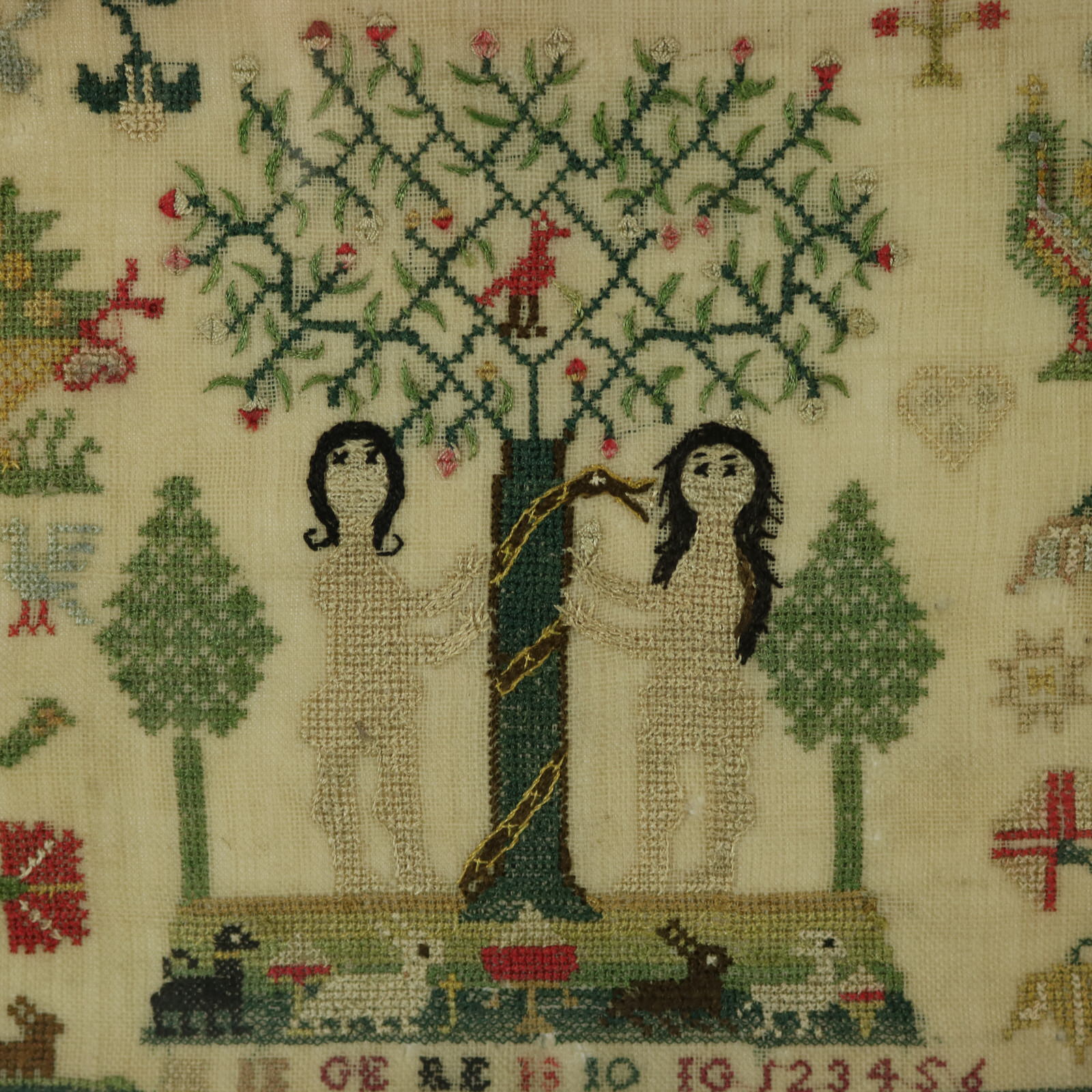 A wonderful set of motifs, including Adam & Eve standing either side of the tree of life with a snake coiled around its trunk,