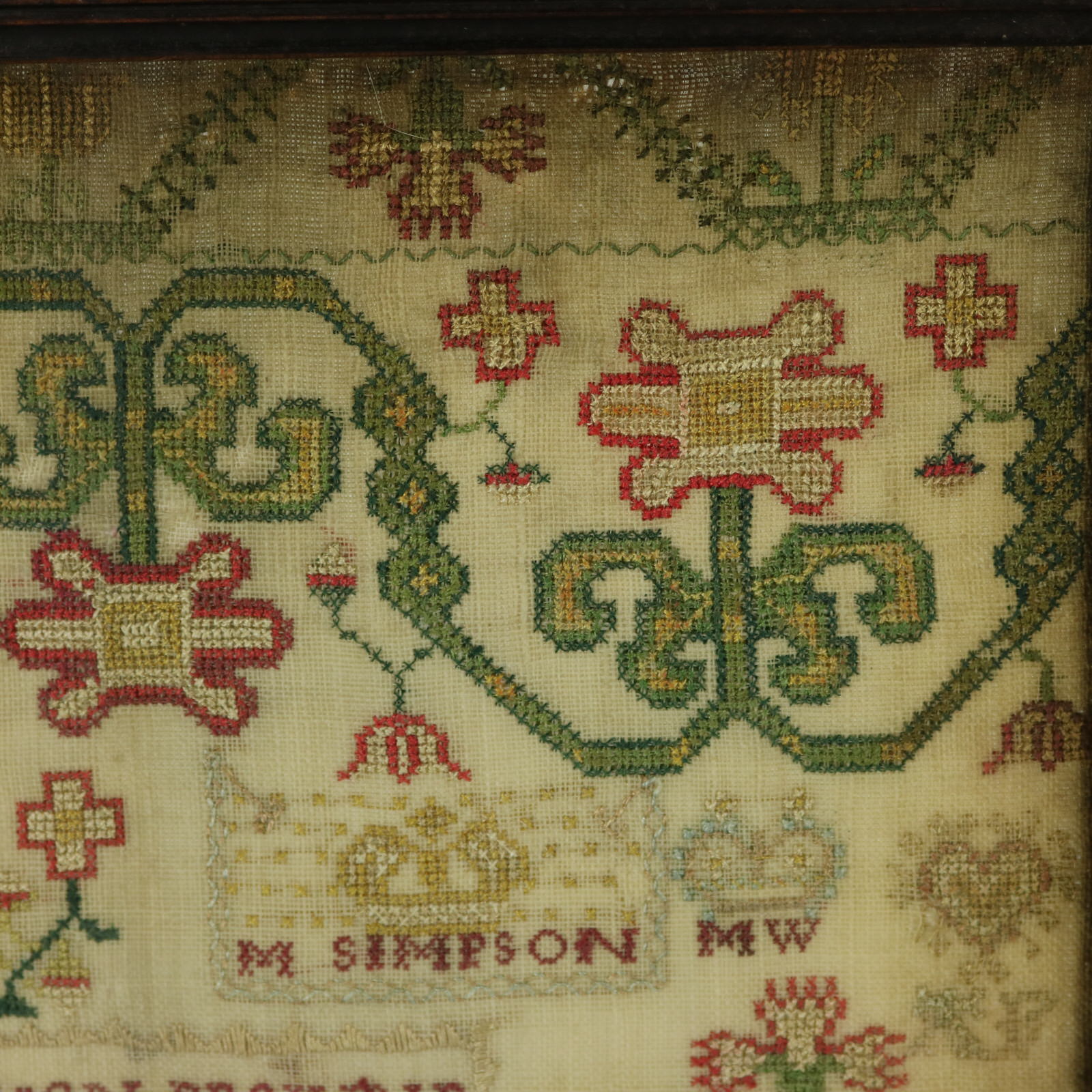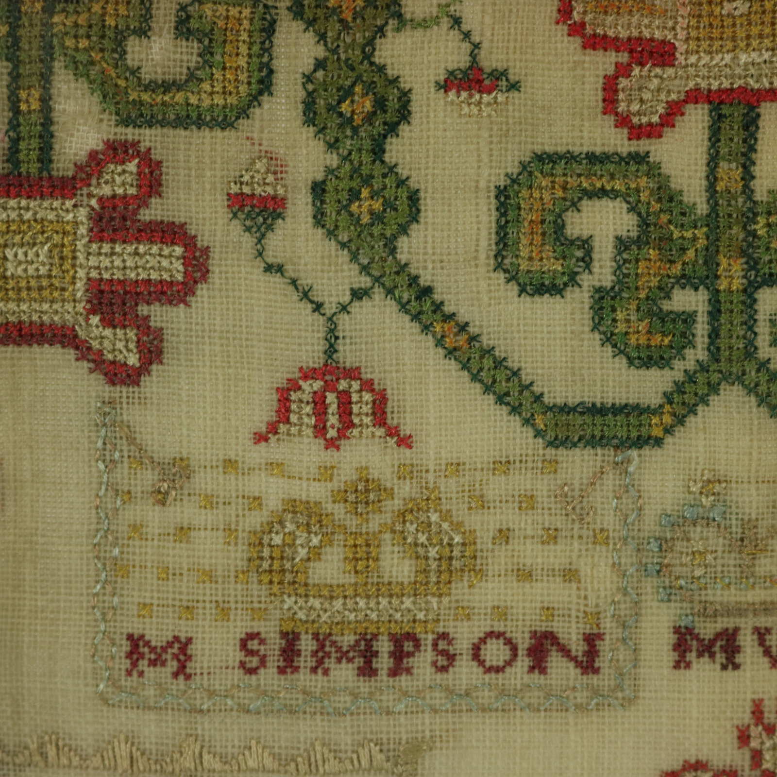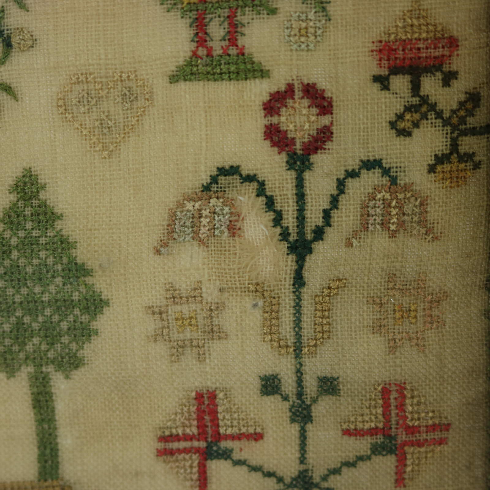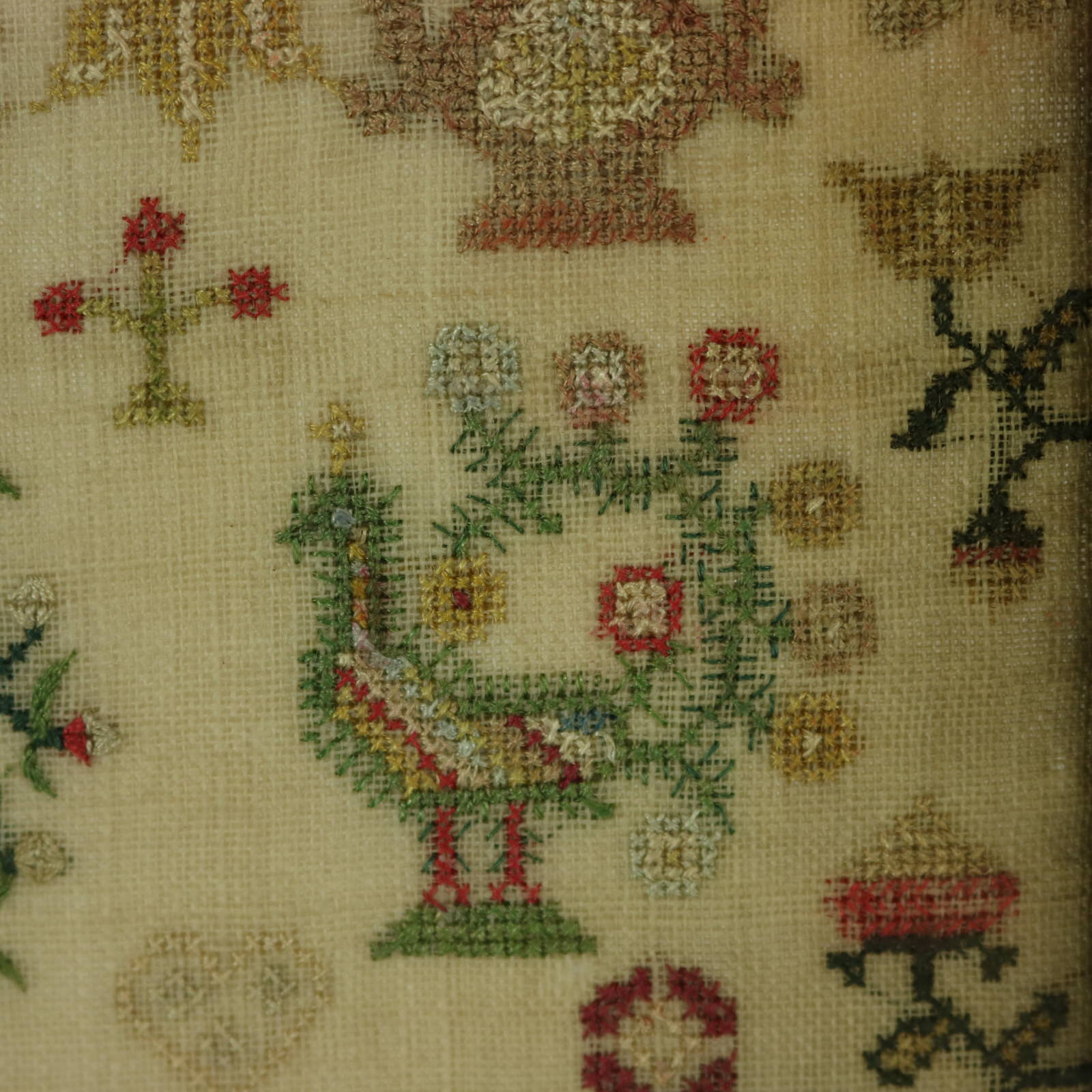 The sampler is worked in silk threads on a linen ground, mainly in cross stitch.