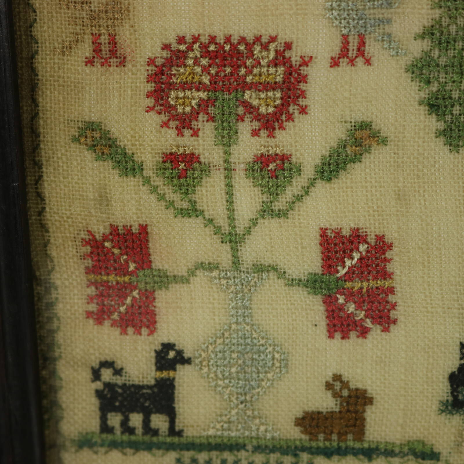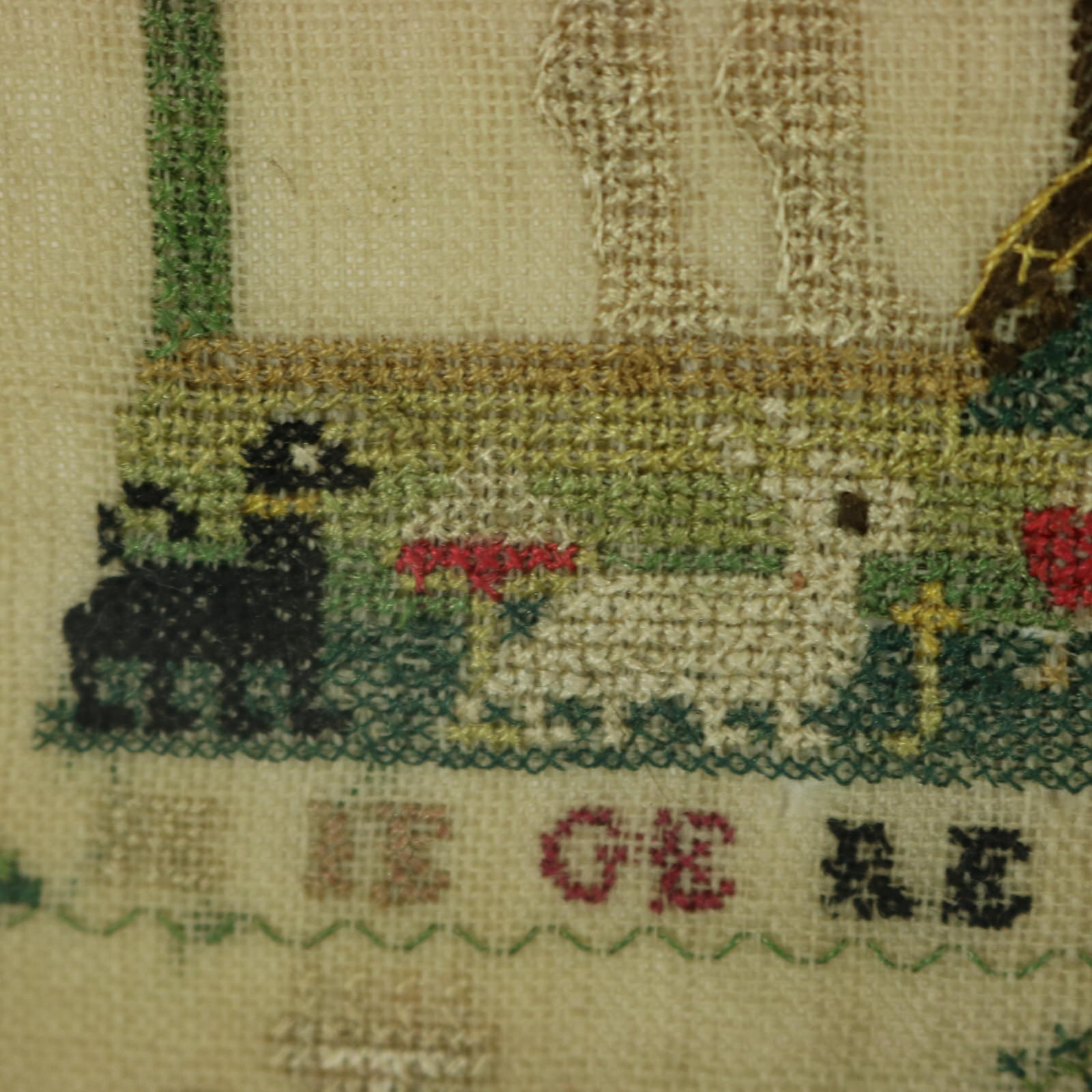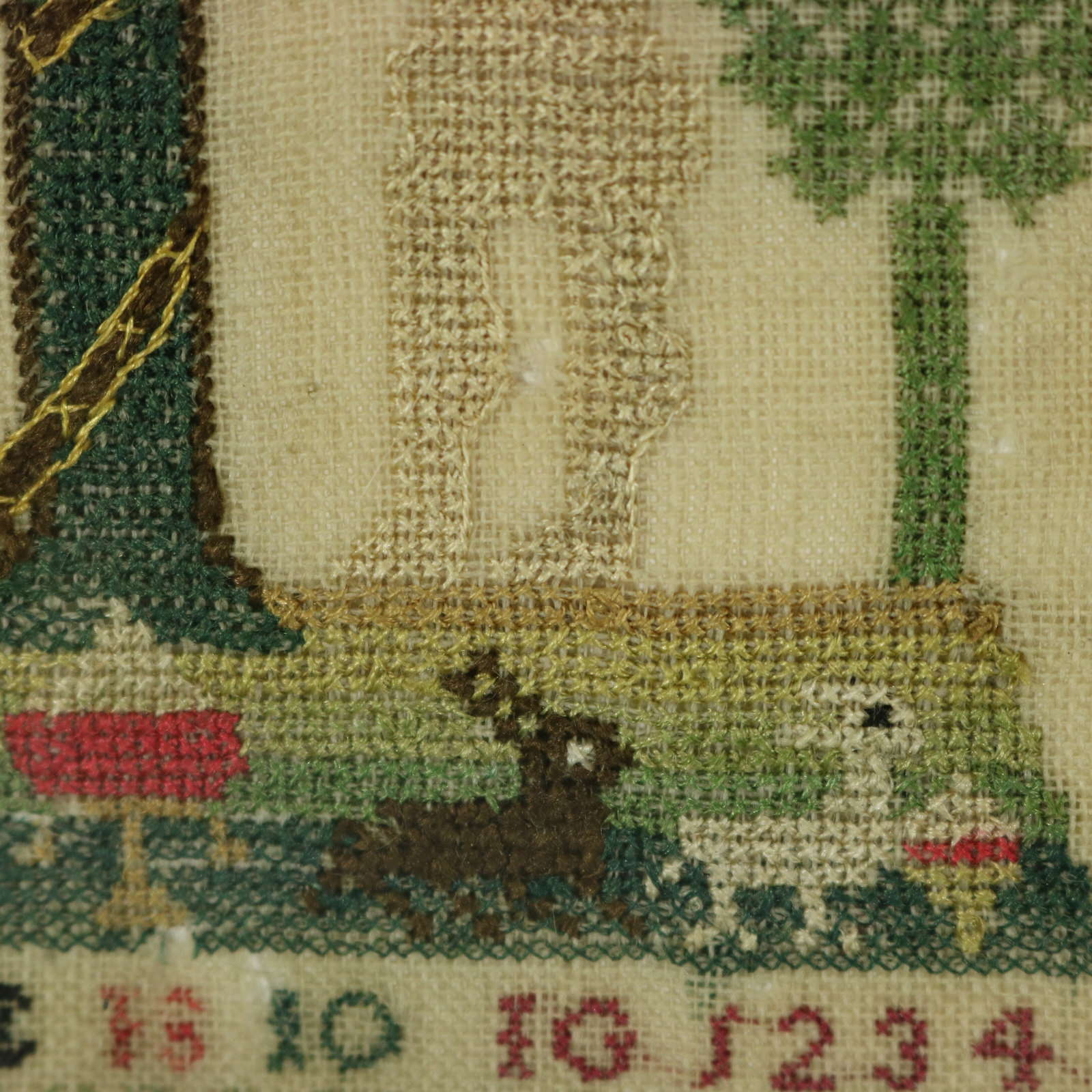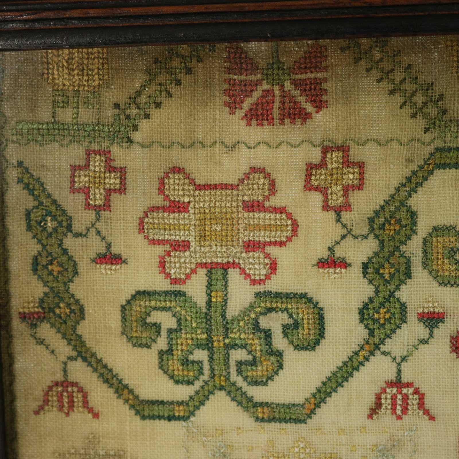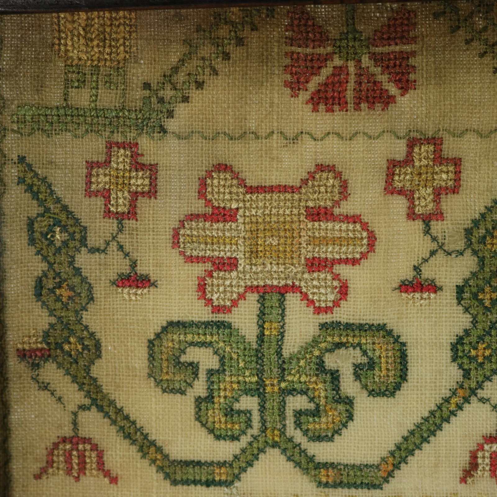 The sampler is worked in silk threads on a linen ground, mainly in cross stitch.