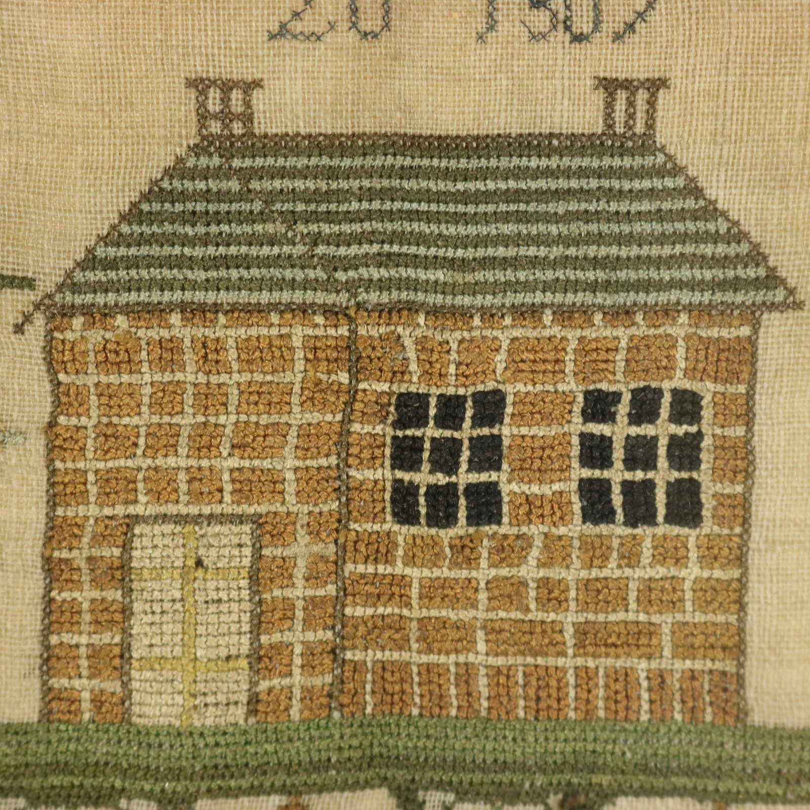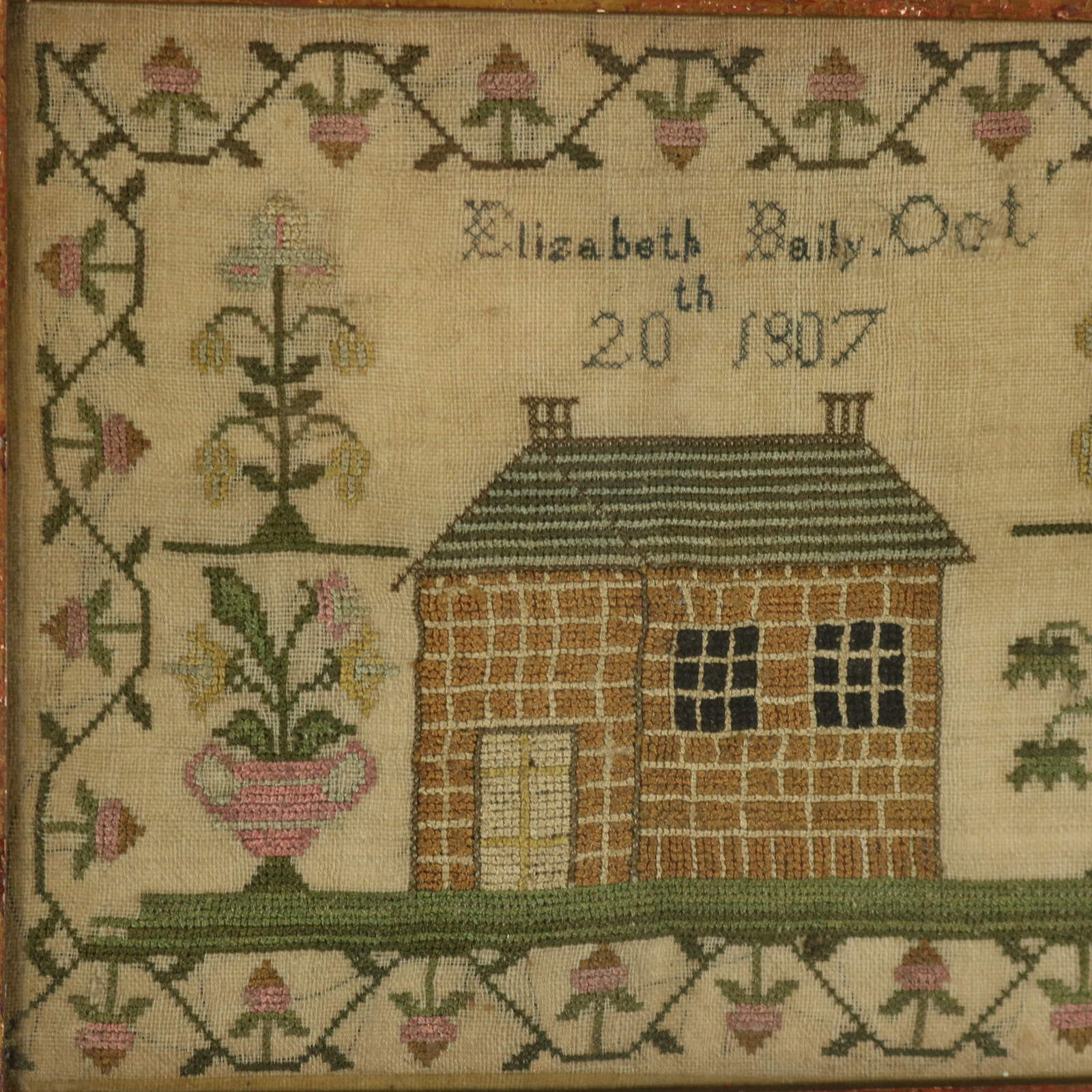 George III, dated 1807. 5.9ins high, 8.1ins wide, 0.5ins deep. Small Georgian House Sampler, 1807, by Elizabeth Baily.