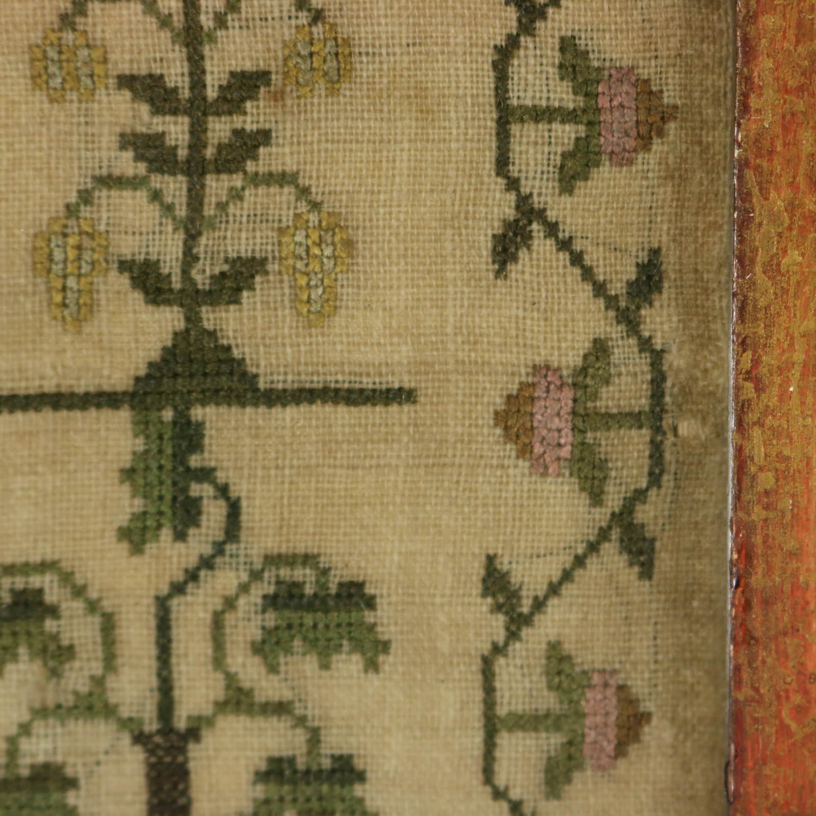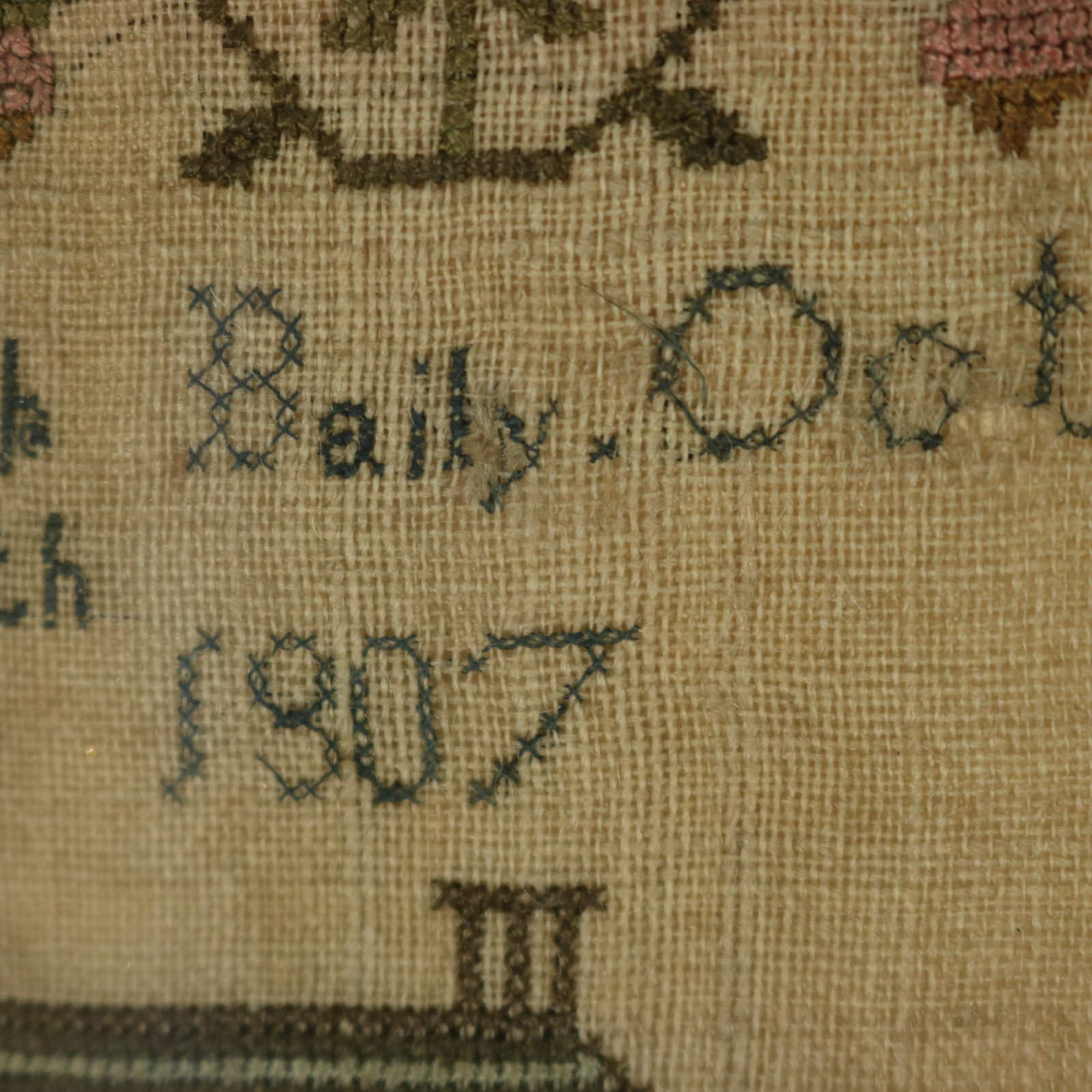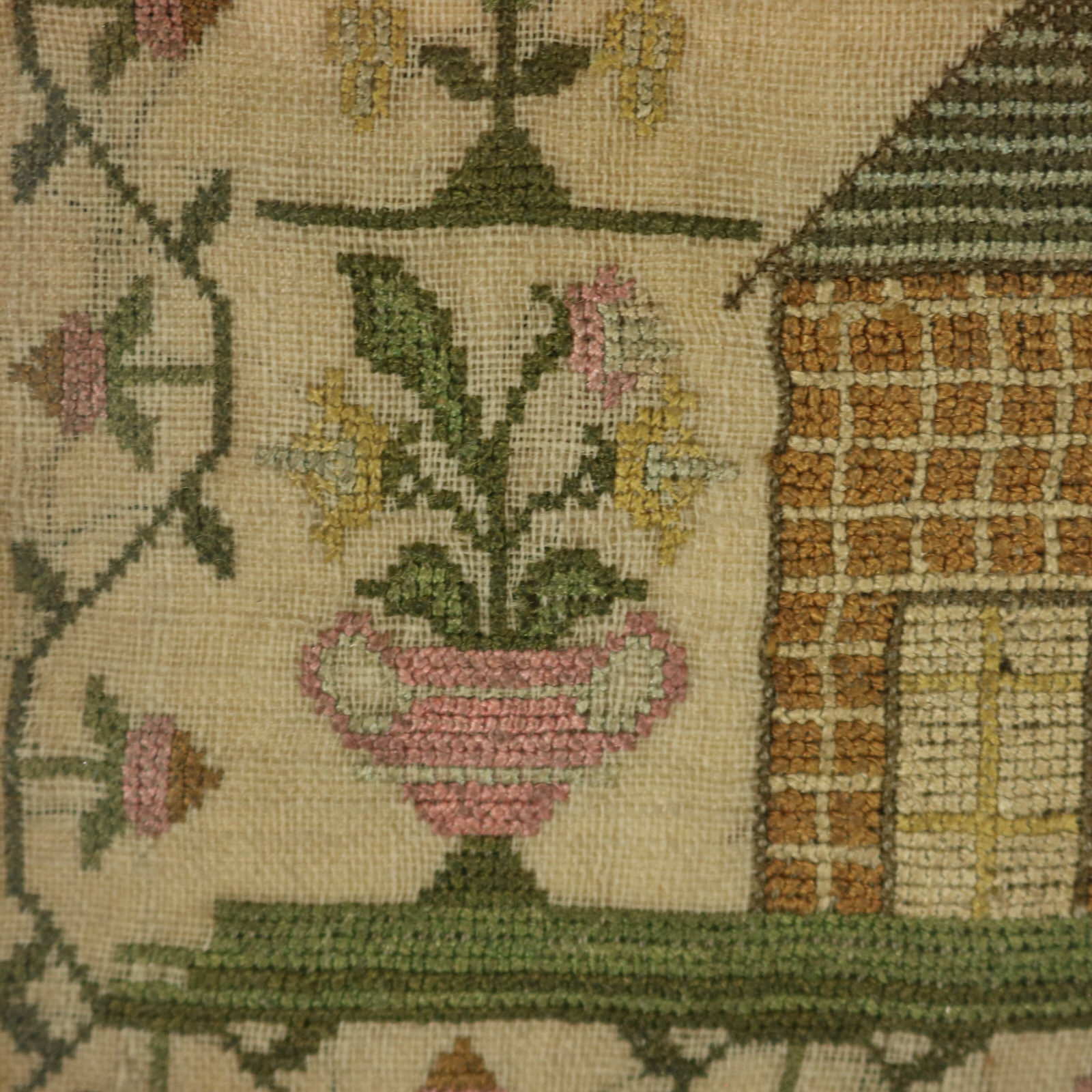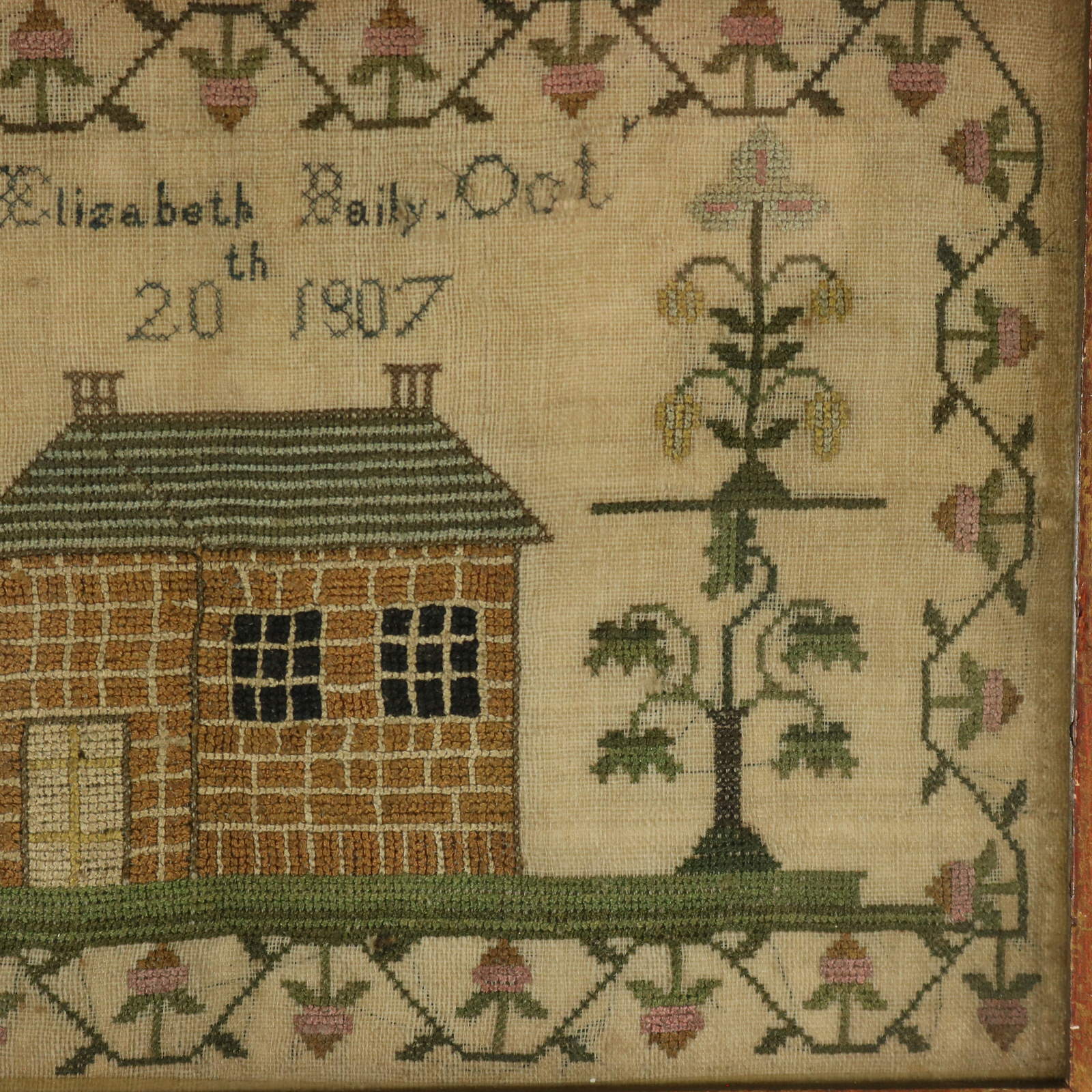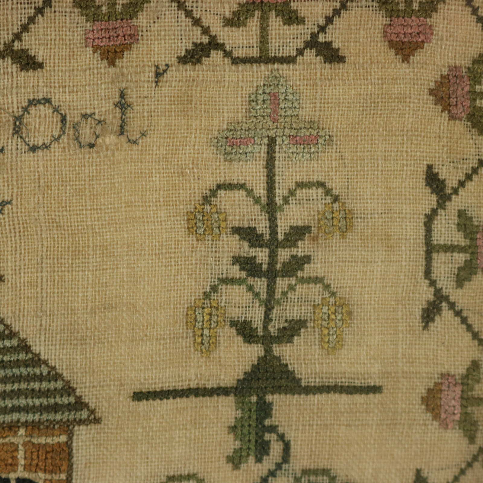 The sampler is worked in silk threads on a linen ground, in cross stitch throughout.