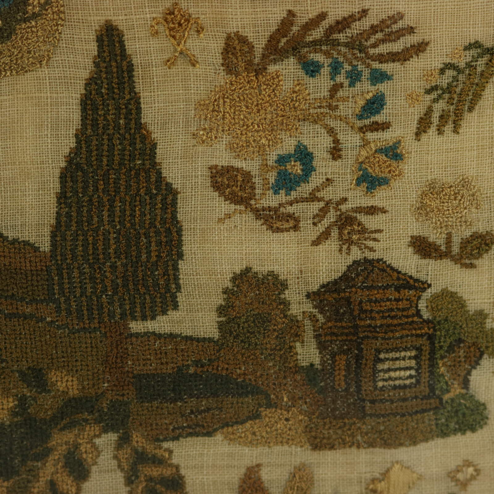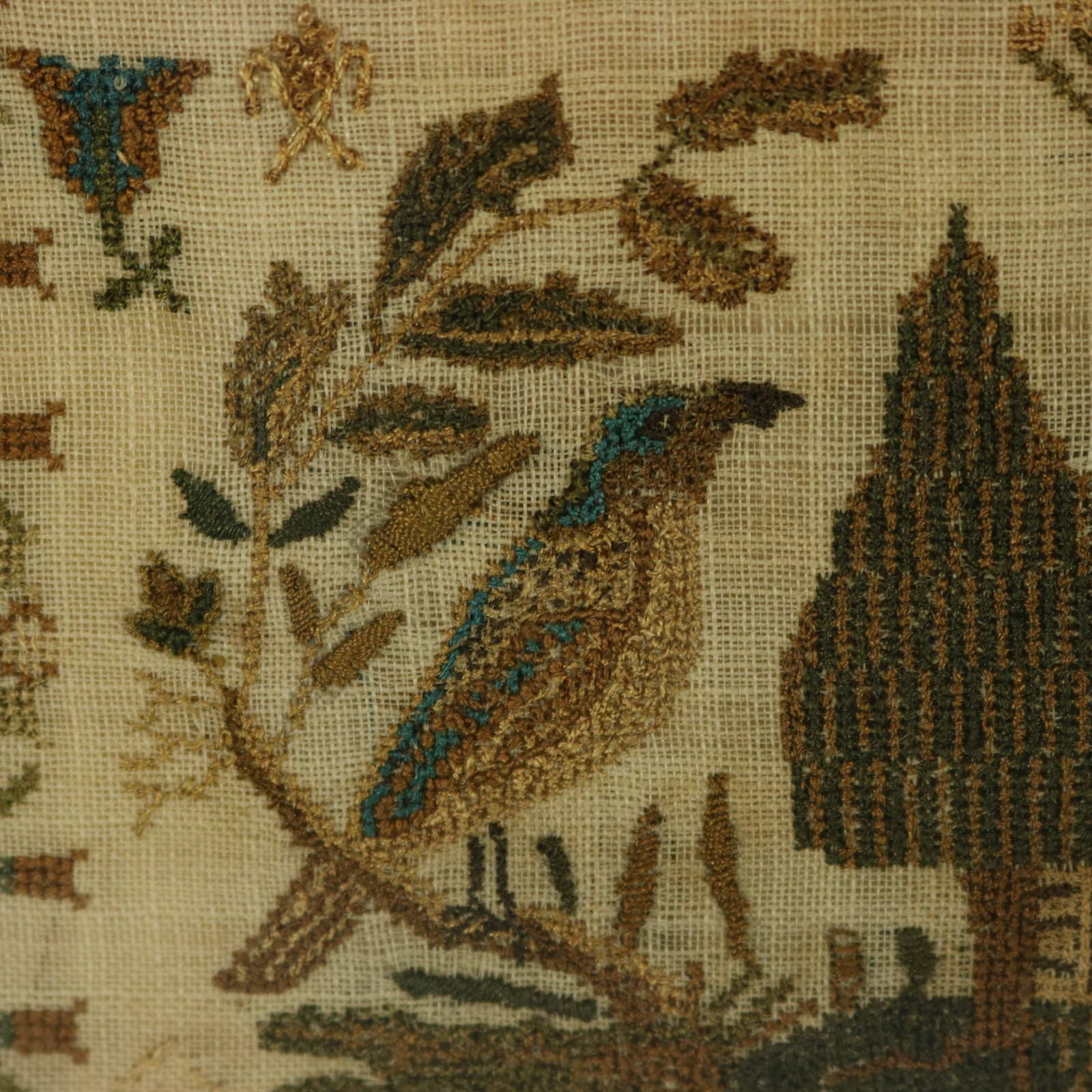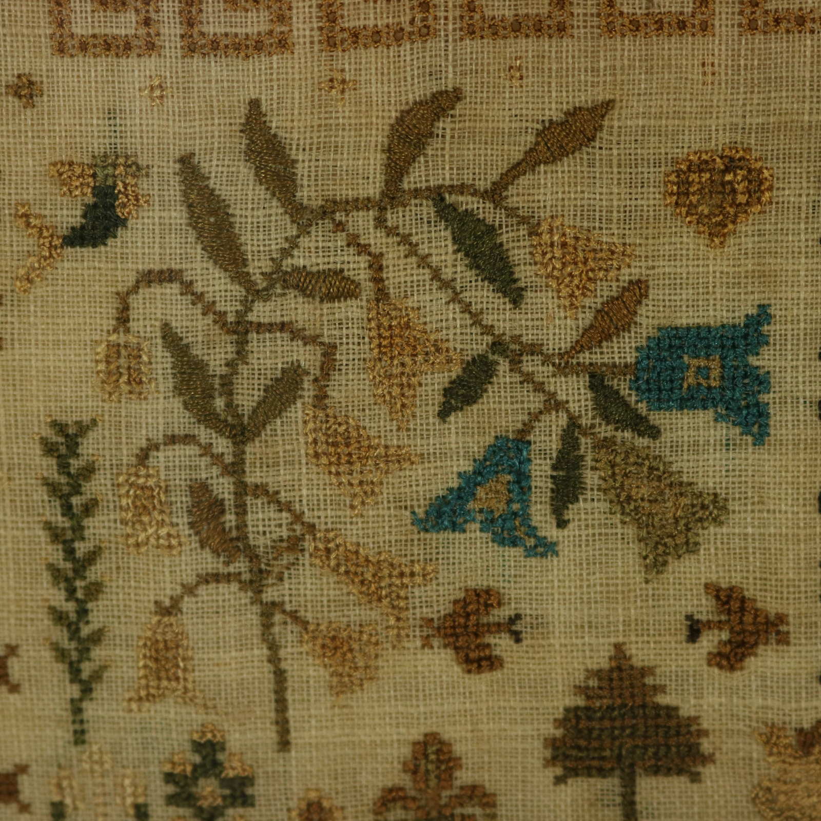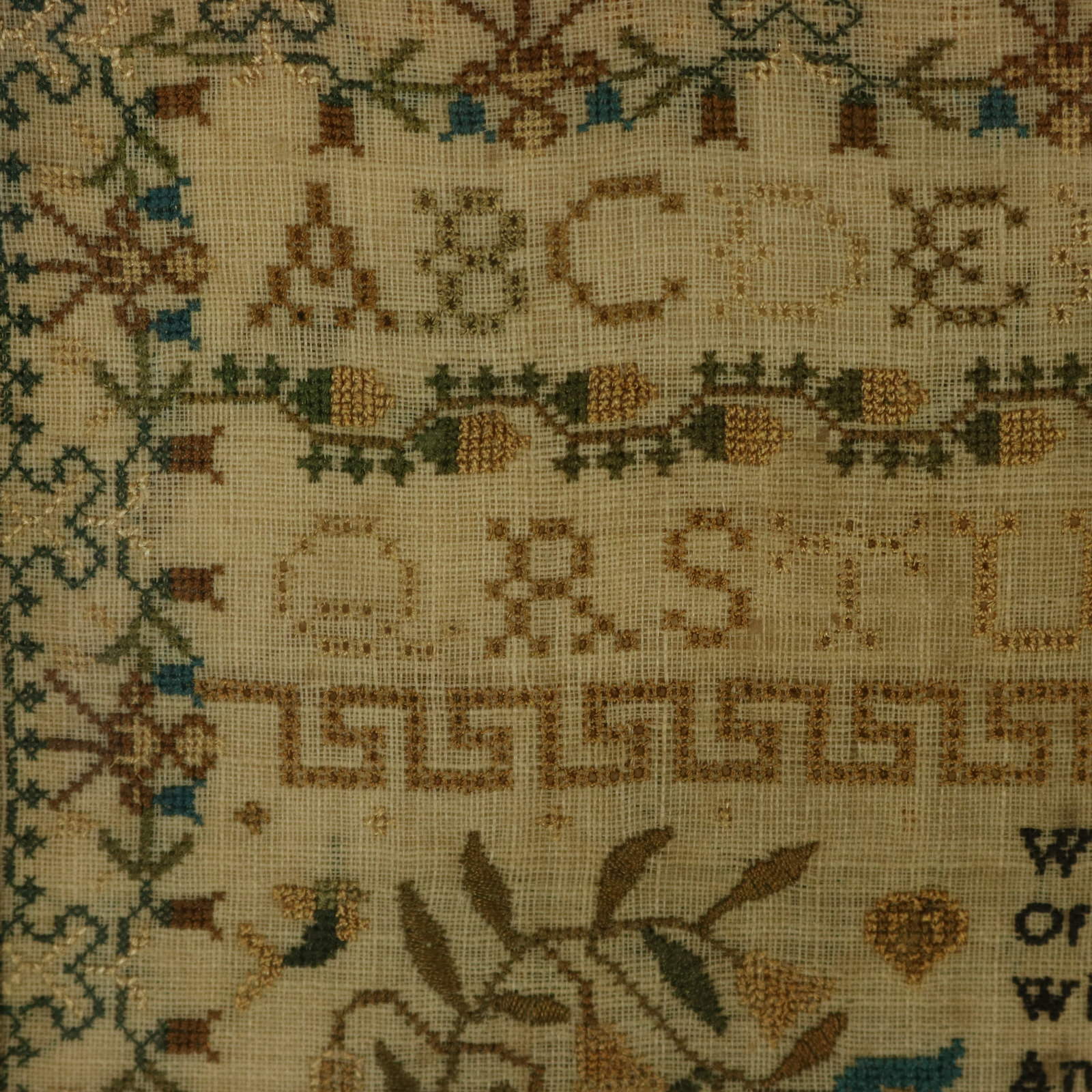 The sampler is worked in silk threads on a linen ground, mainly in cross stitch.