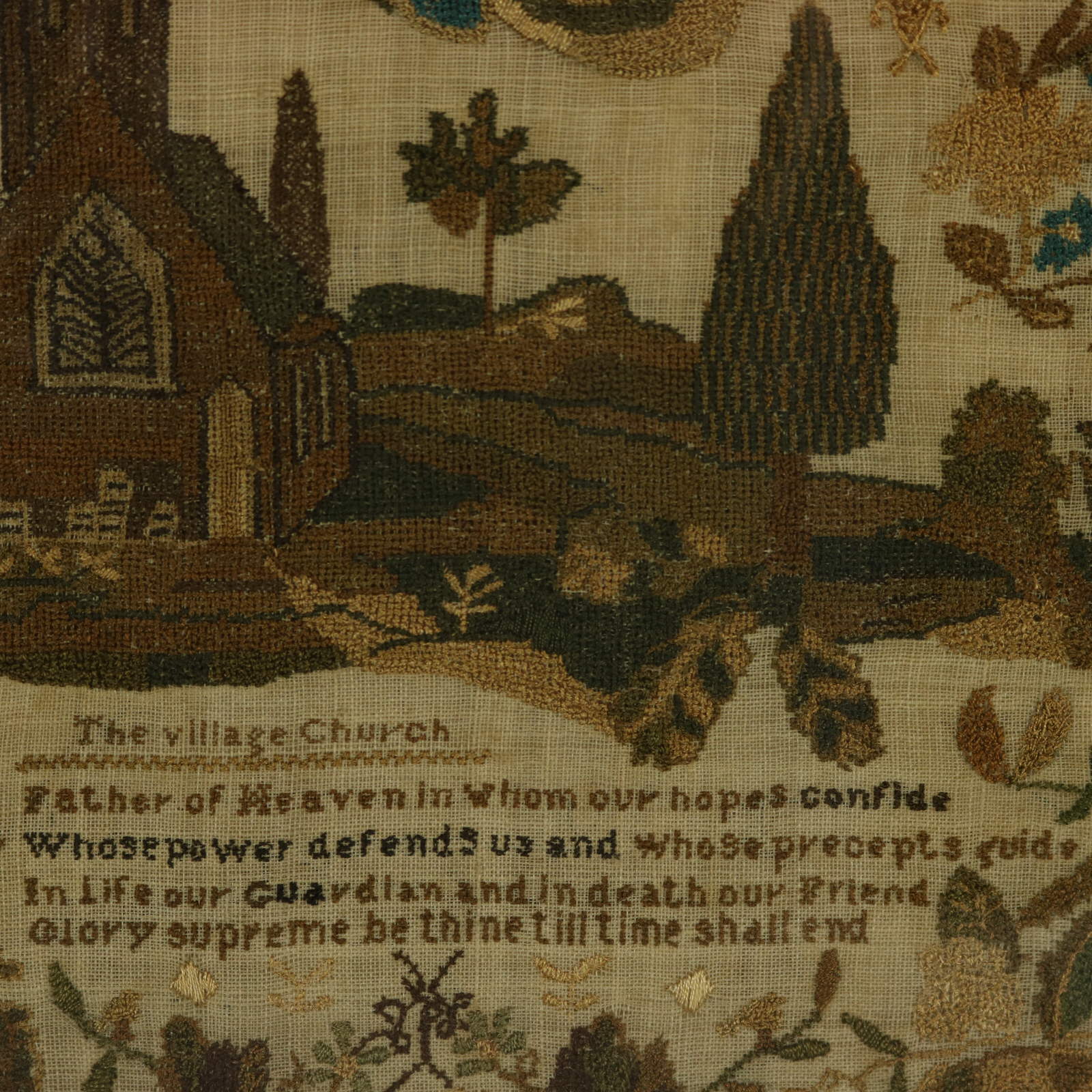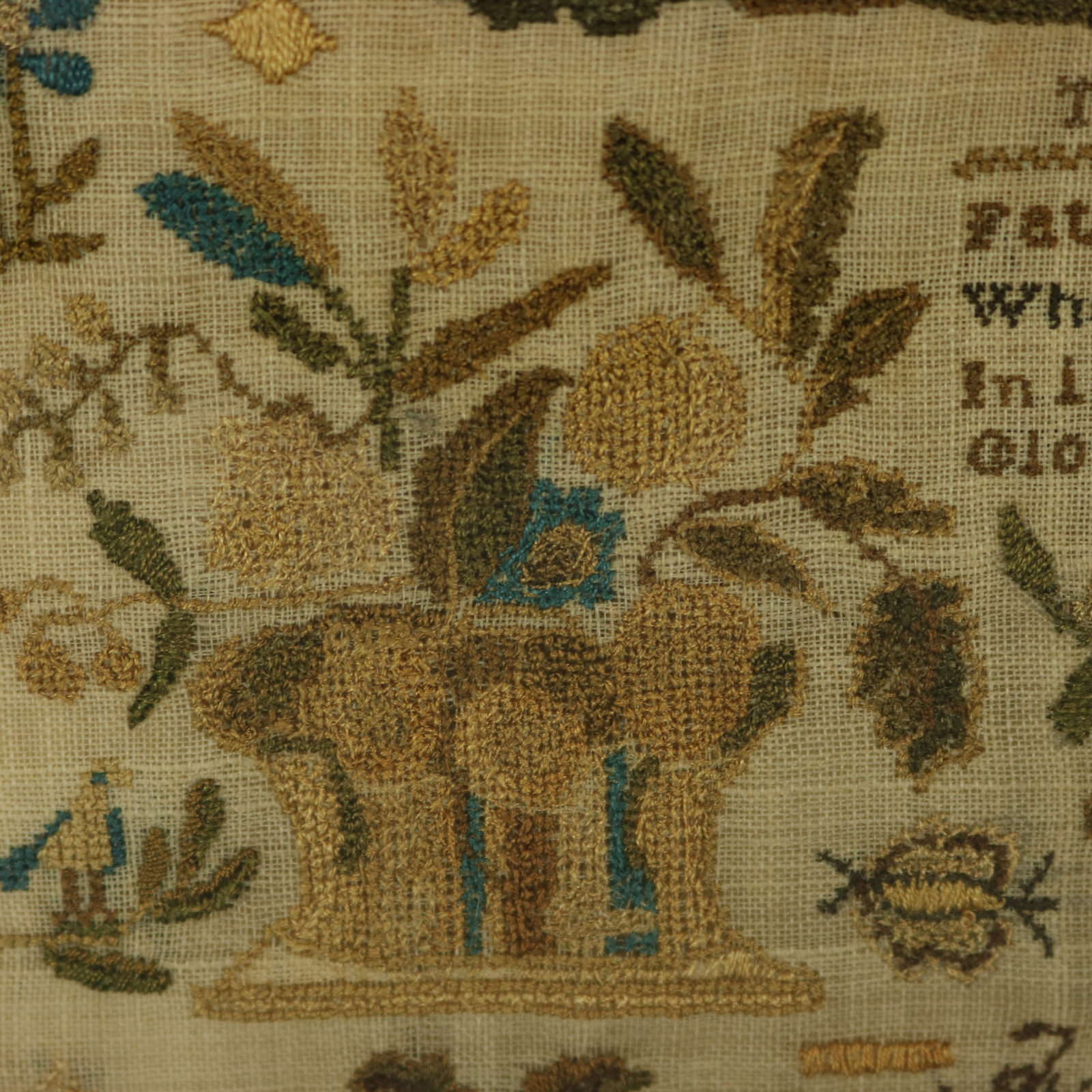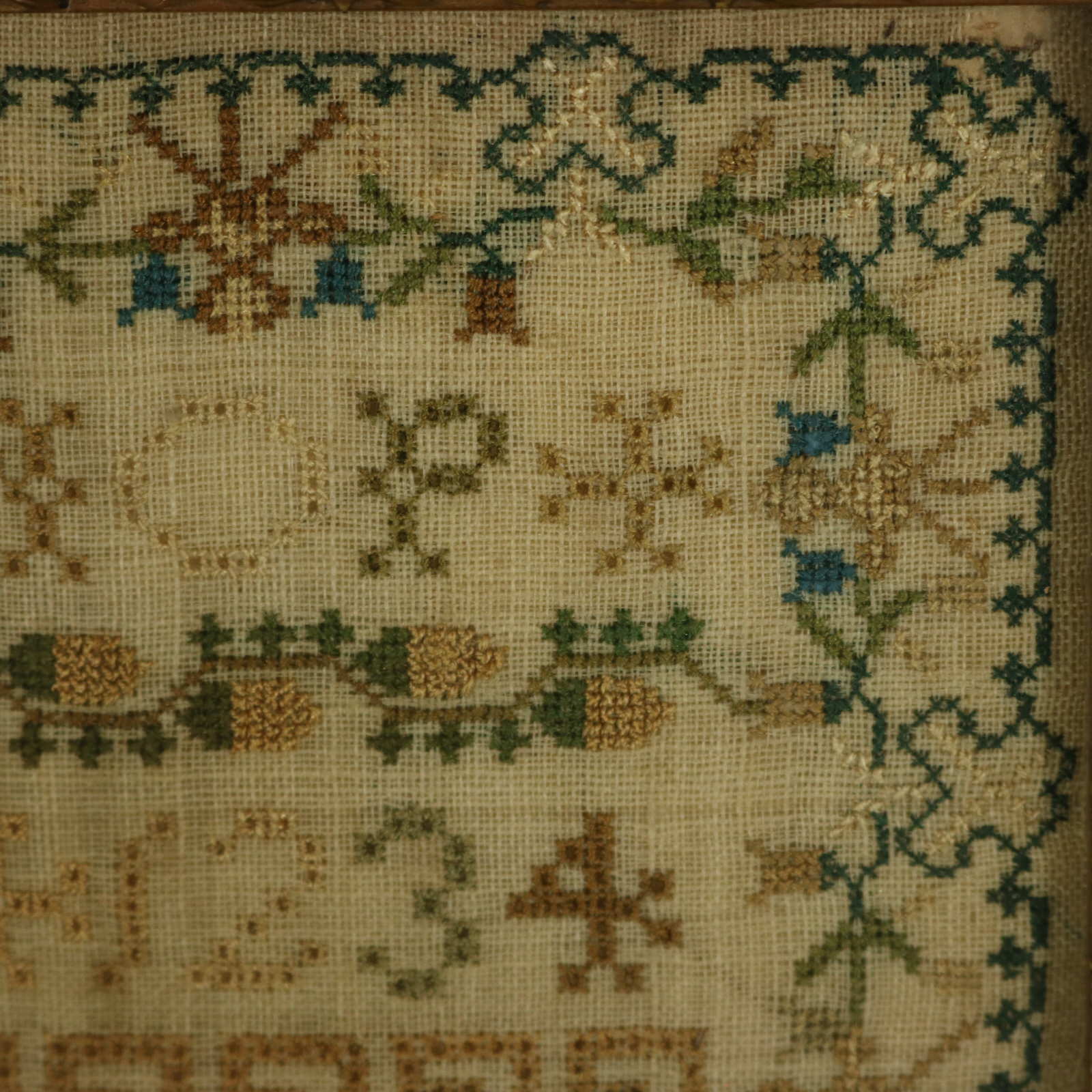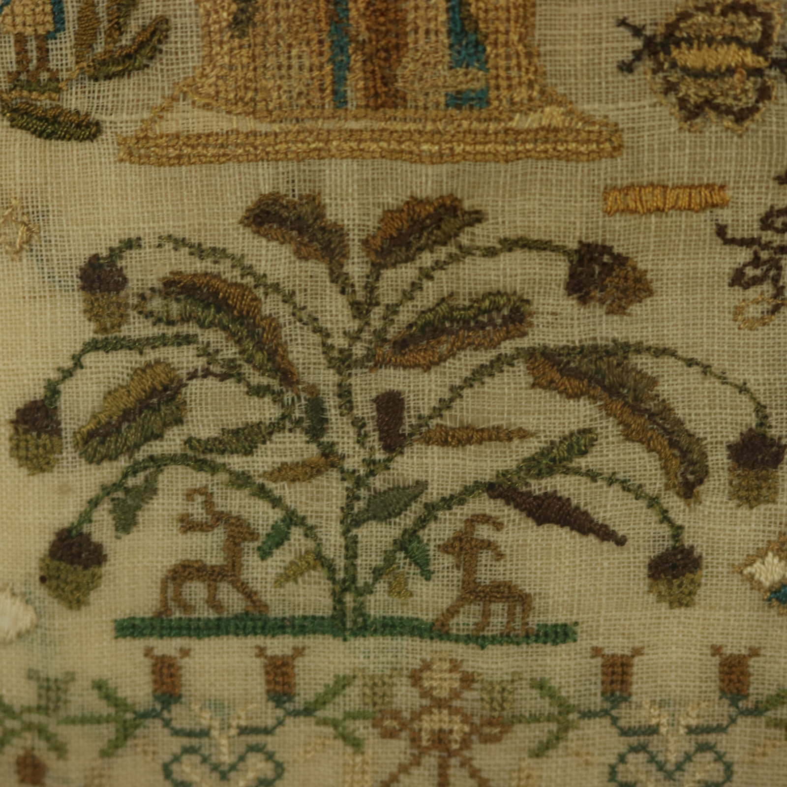 The sampler is worked in silk threads on a linen ground, mainly in cross stitch.
