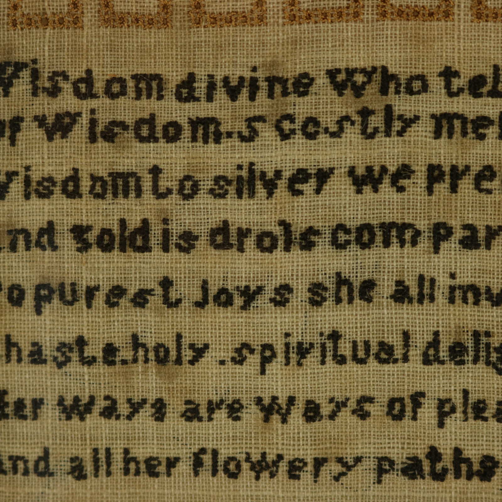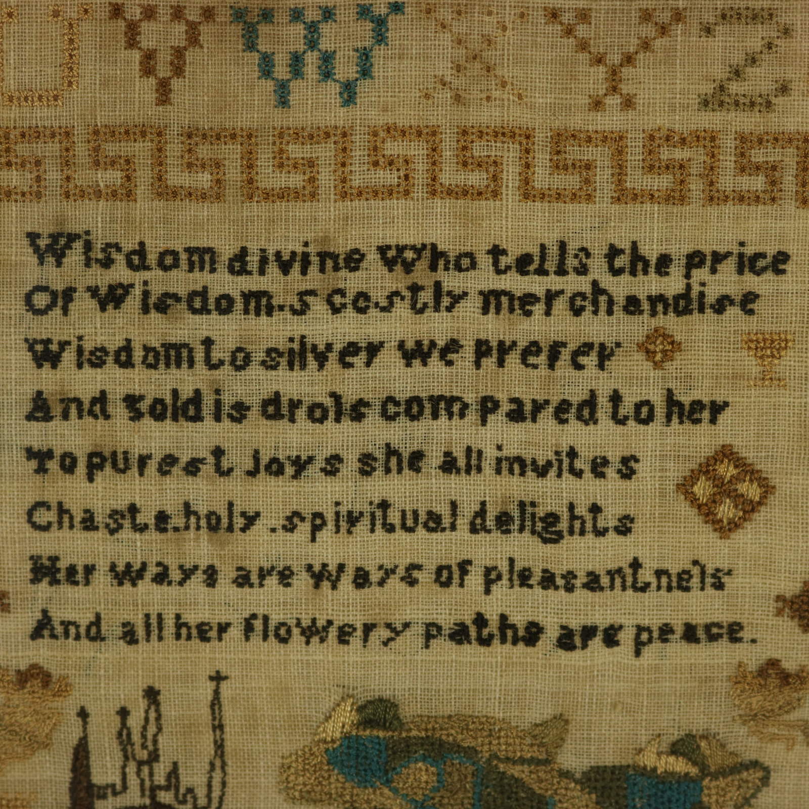 Verse reads, 'Wisdom divine Who tells the price, Of Wisdoms costly merchandise, Wisdom to silver we prefer, And gold is dross compared to her, To purest Joys she all invites, Chaste holy spiritual delights, Her ways are ways of pleasantness, And all her flowery paths are peace.'.