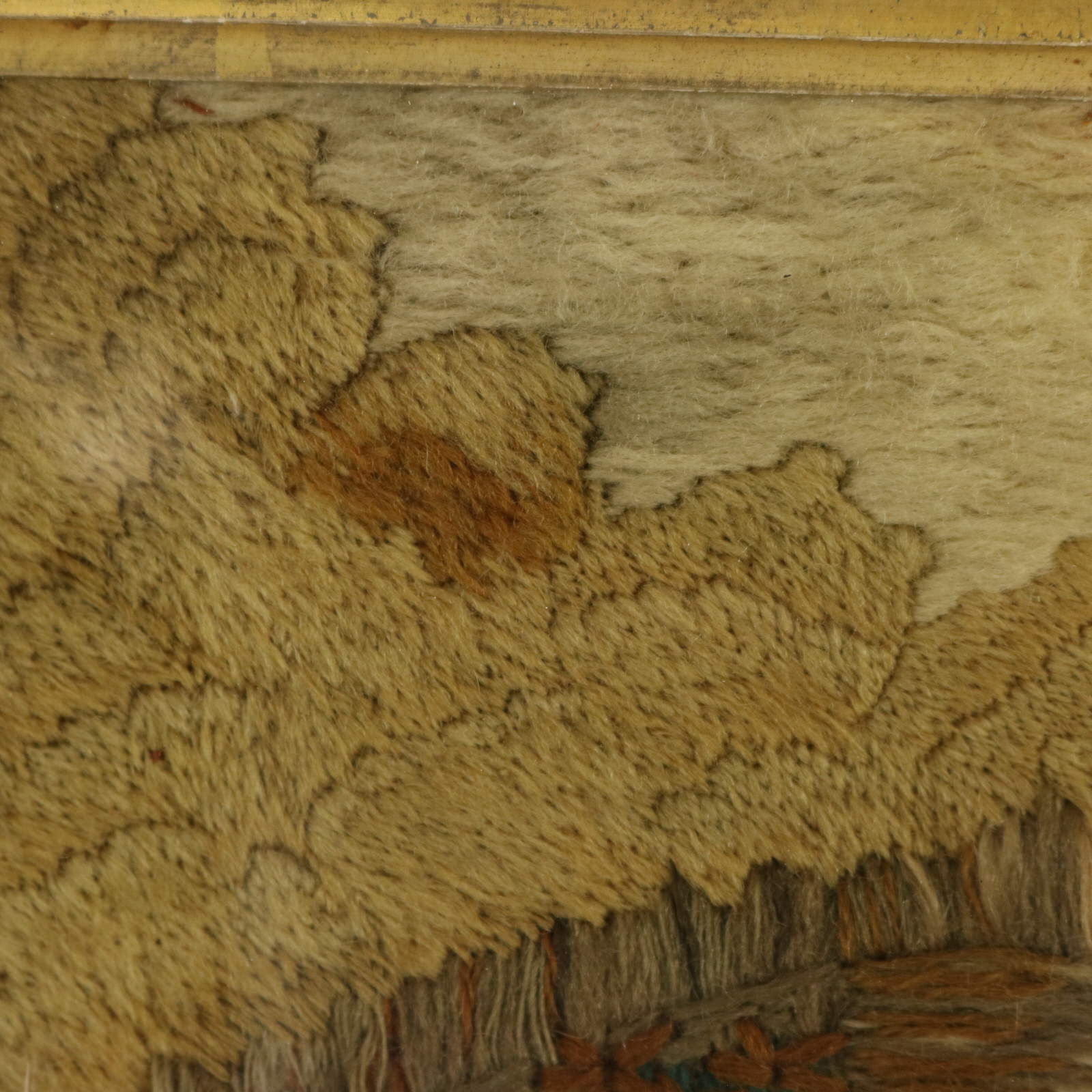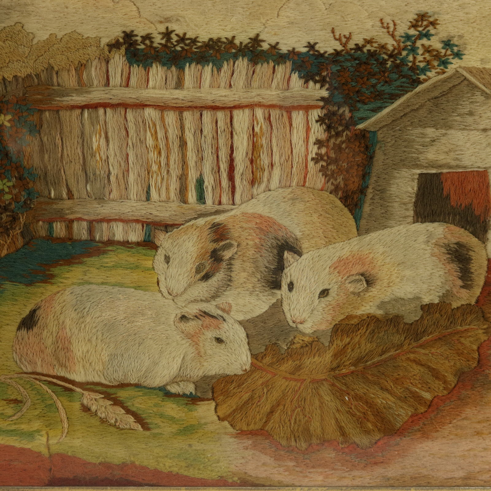 Victorian, circa 1860. 13.8ins high, 19.1ins wide, 0.9ins deep. Georgian Woolwork Embroidered Picture of Guinea Pigs in a garden scene.