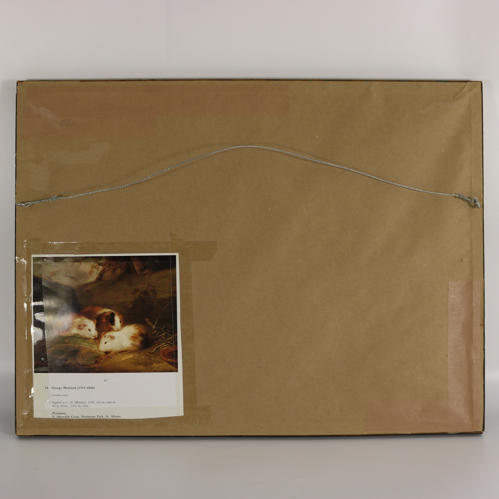 The inspiration for this picture is from a painting by George Morland (1763-1804), entitled 'Guinea Pigs'. A catalogue page cutout is stuck to the back of the embroidery, illustrating this painting.
