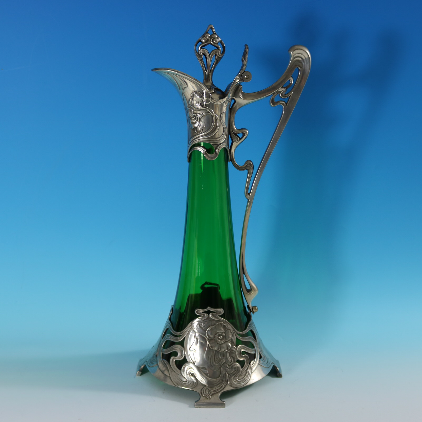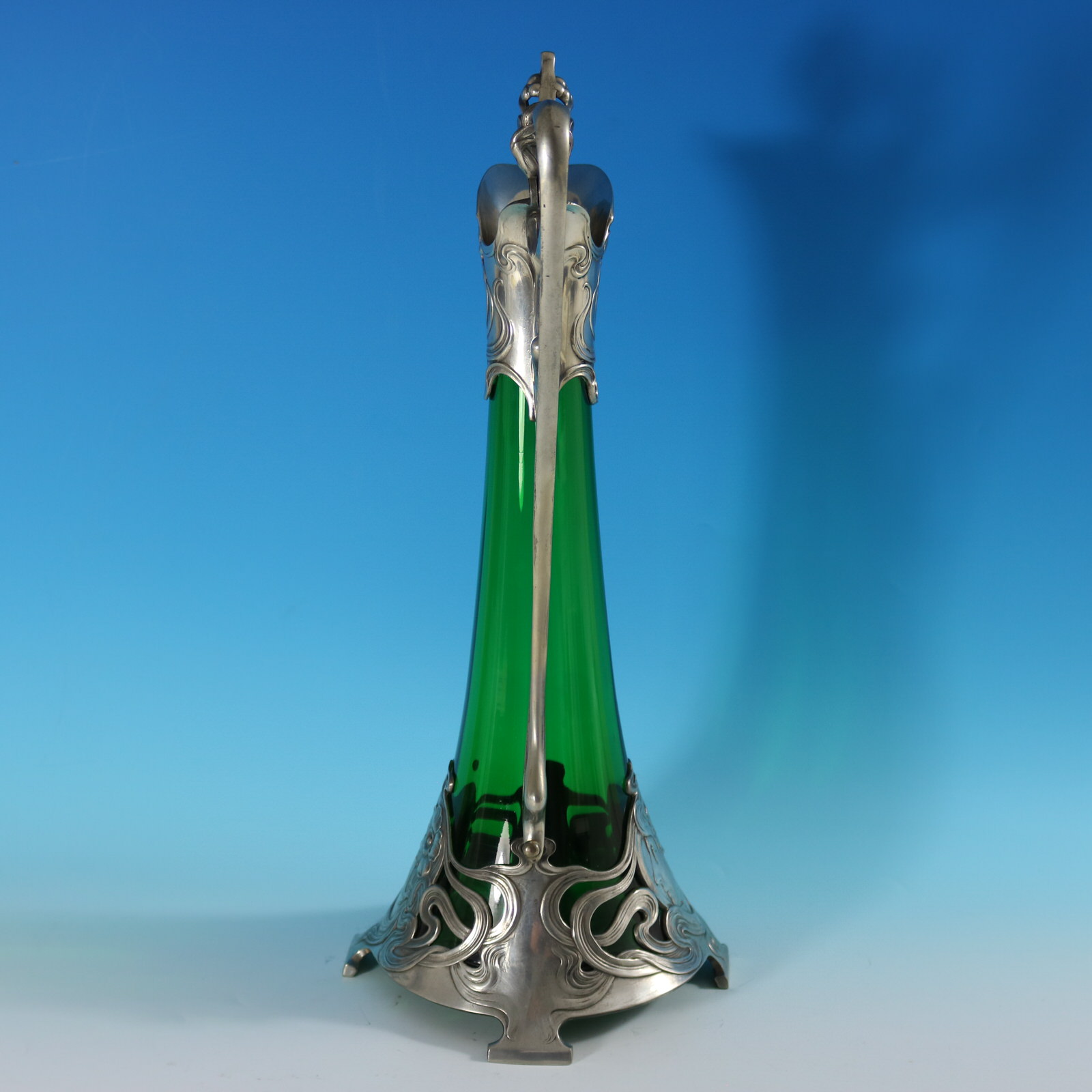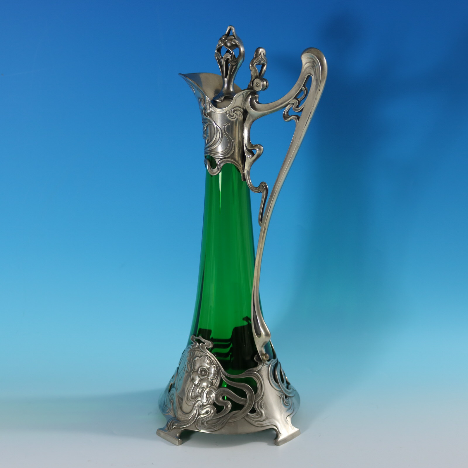 Circa 1910. 16.5ins high, 9.1ins wide, 7.1ins deep. WMF green glass claret jug of typical art nouveau stylised form.