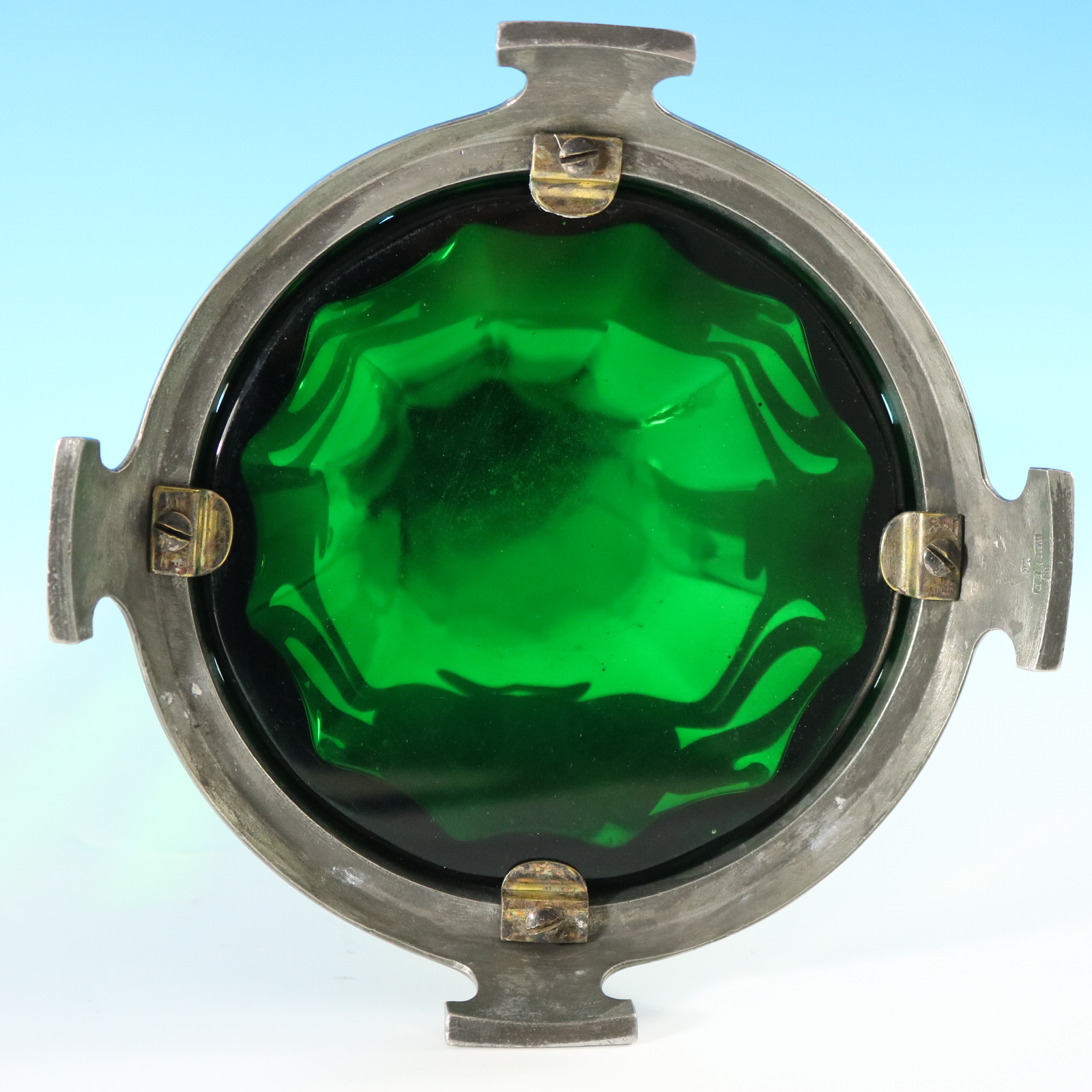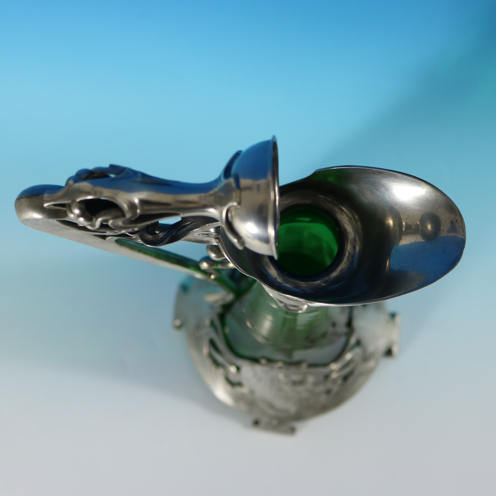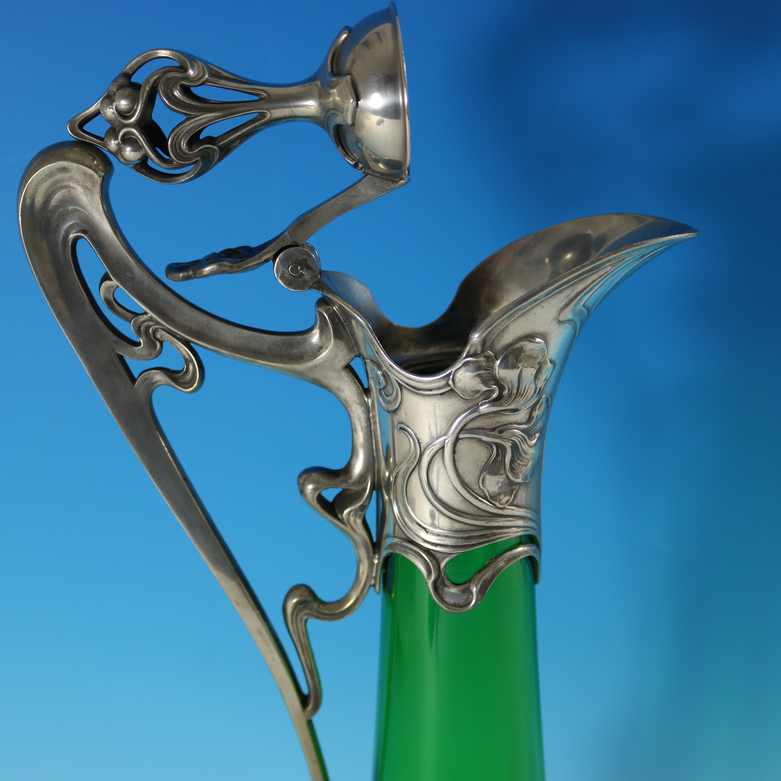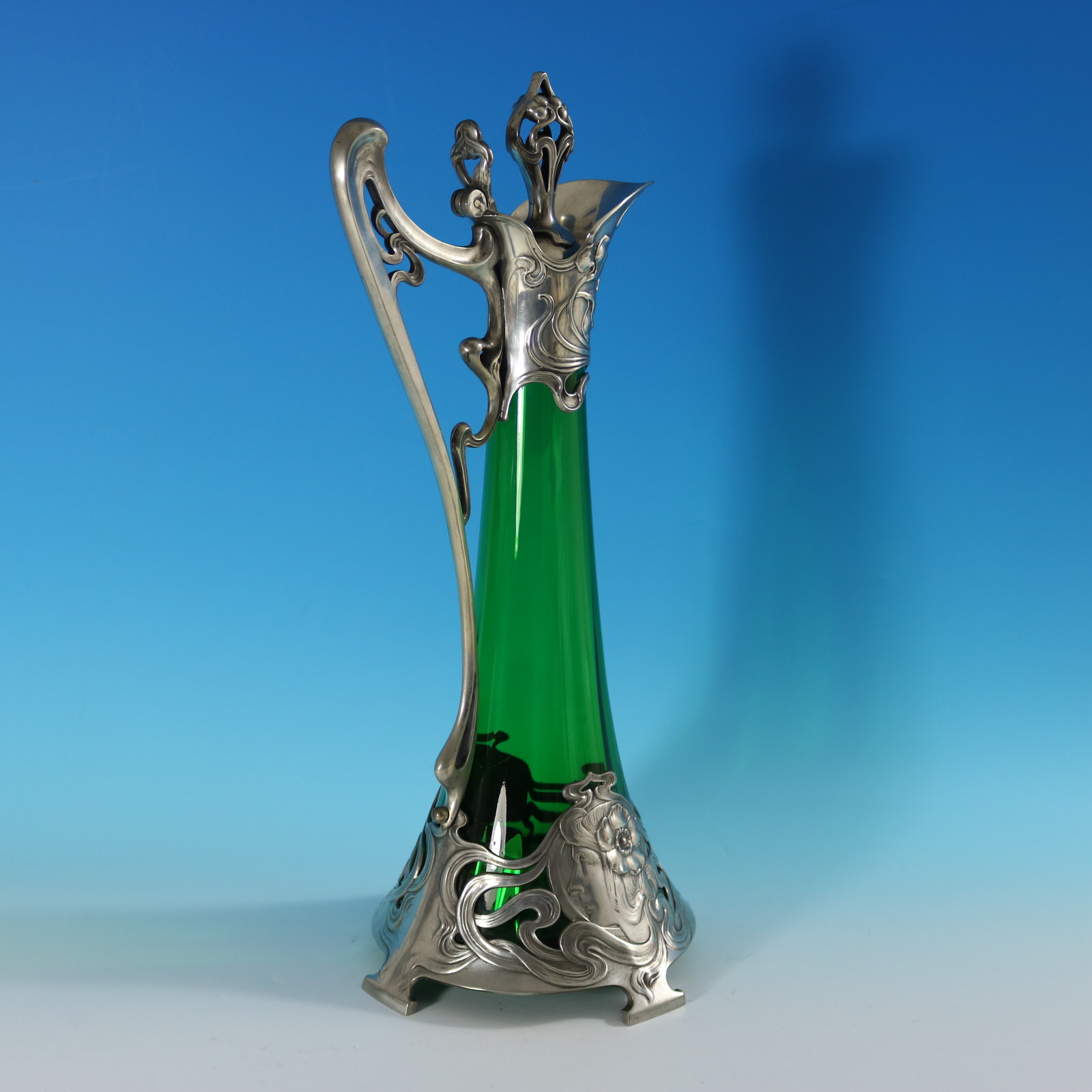 Circa 1910. 16.5ins high, 9.1ins wide, 7.1ins deep. WMF green glass claret jug of typical art nouveau stylised form.