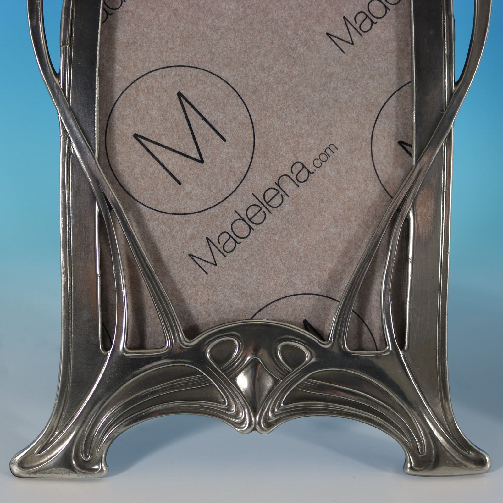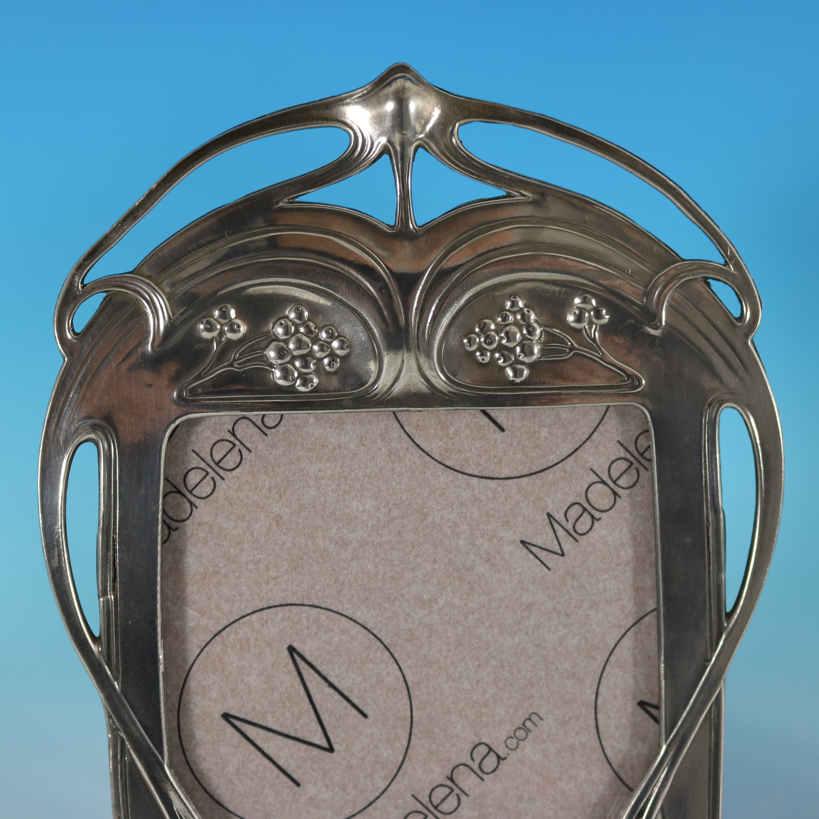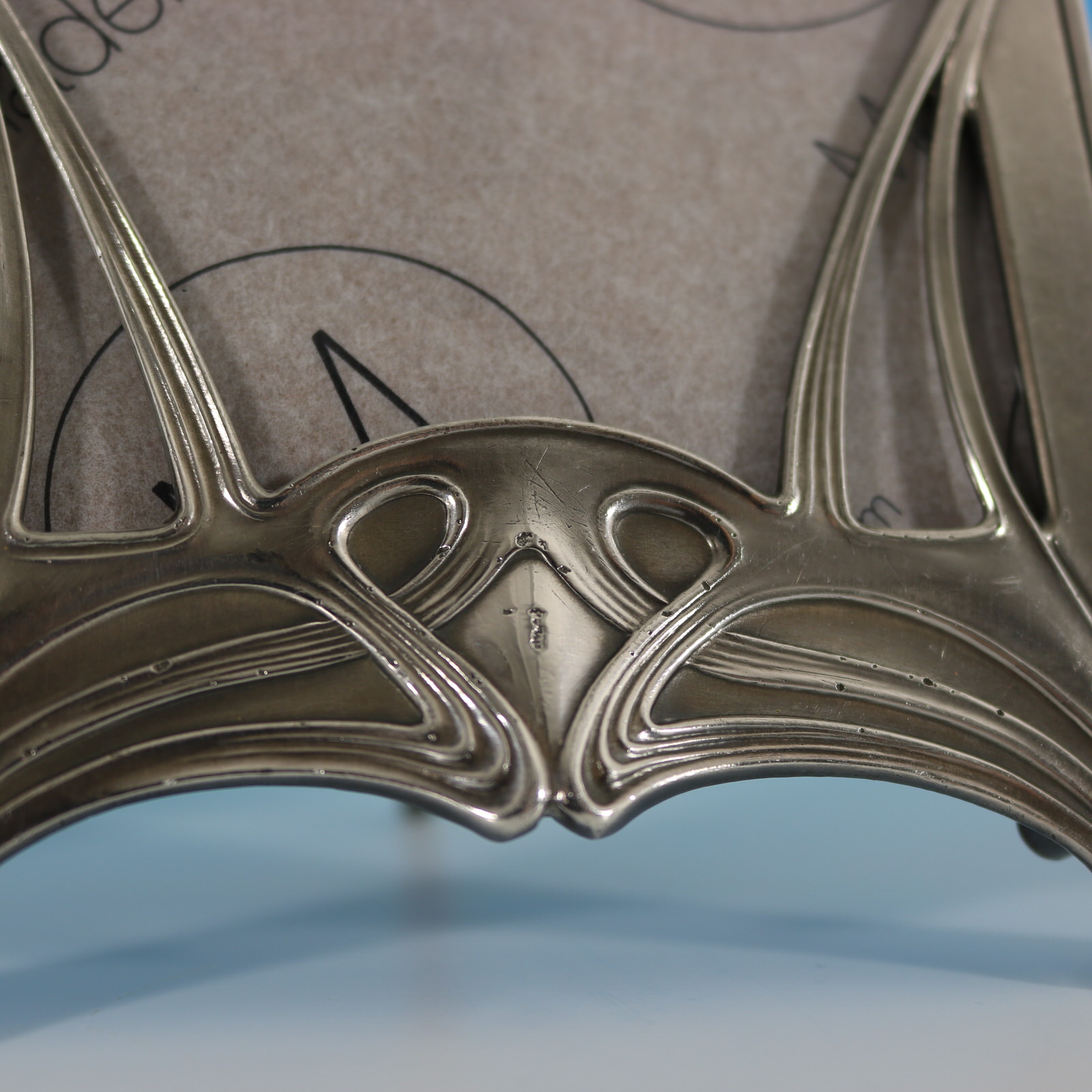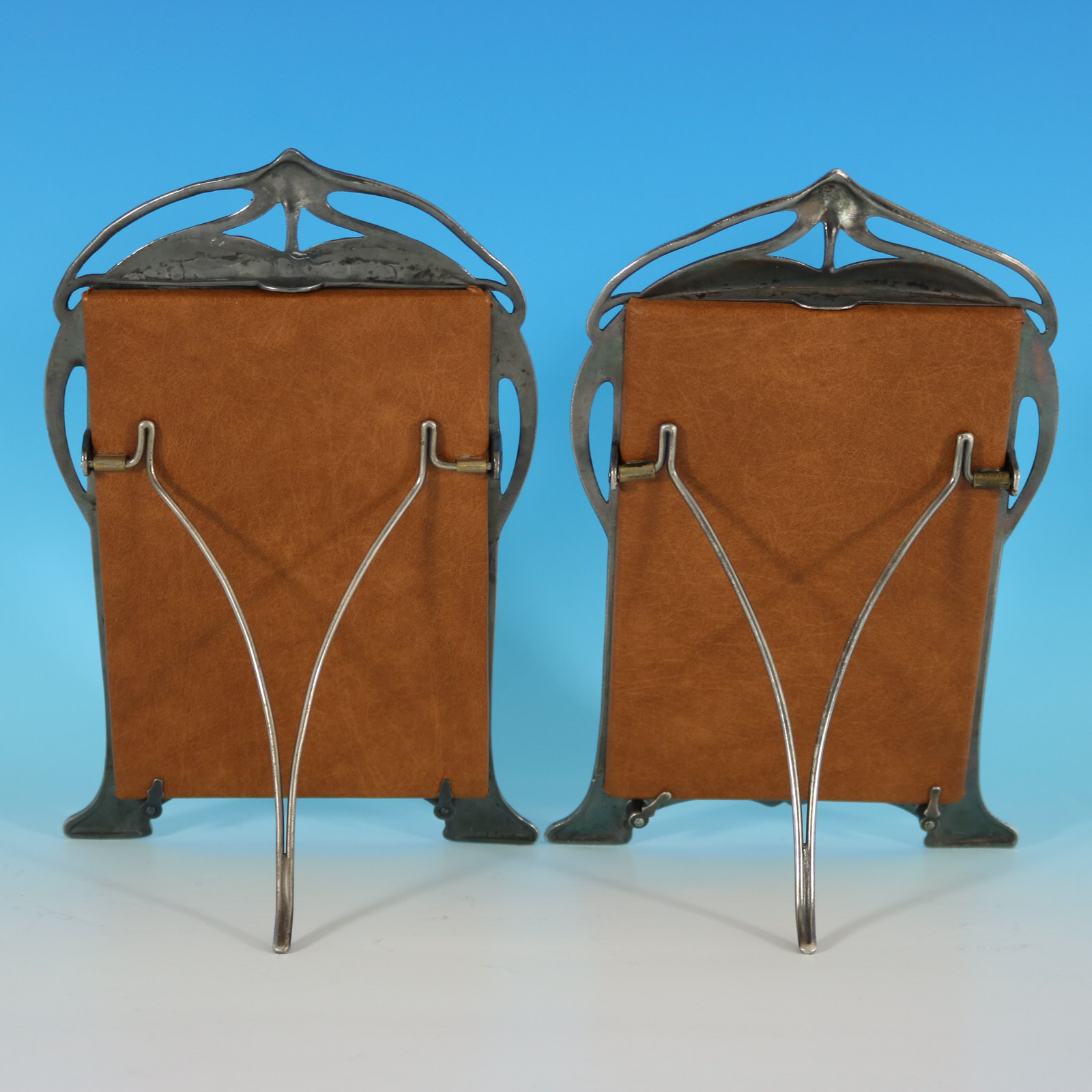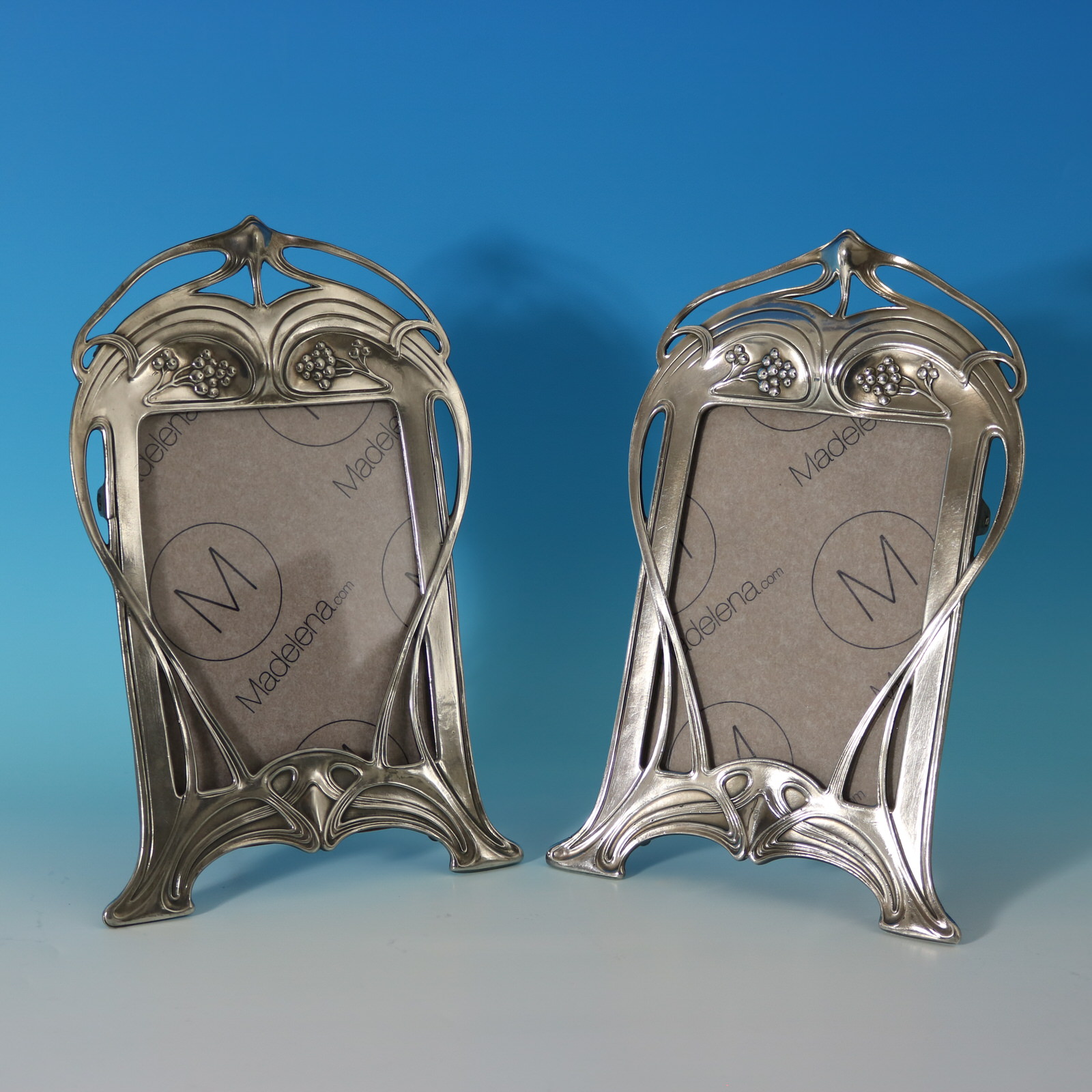 Circa 1910. 9.1ins high, 6ins wide, 4.3ins deep. A pair of WMF photo frames in typical Art Nouveau style. Whiplash curves adorn the front, with berries above the photo area.