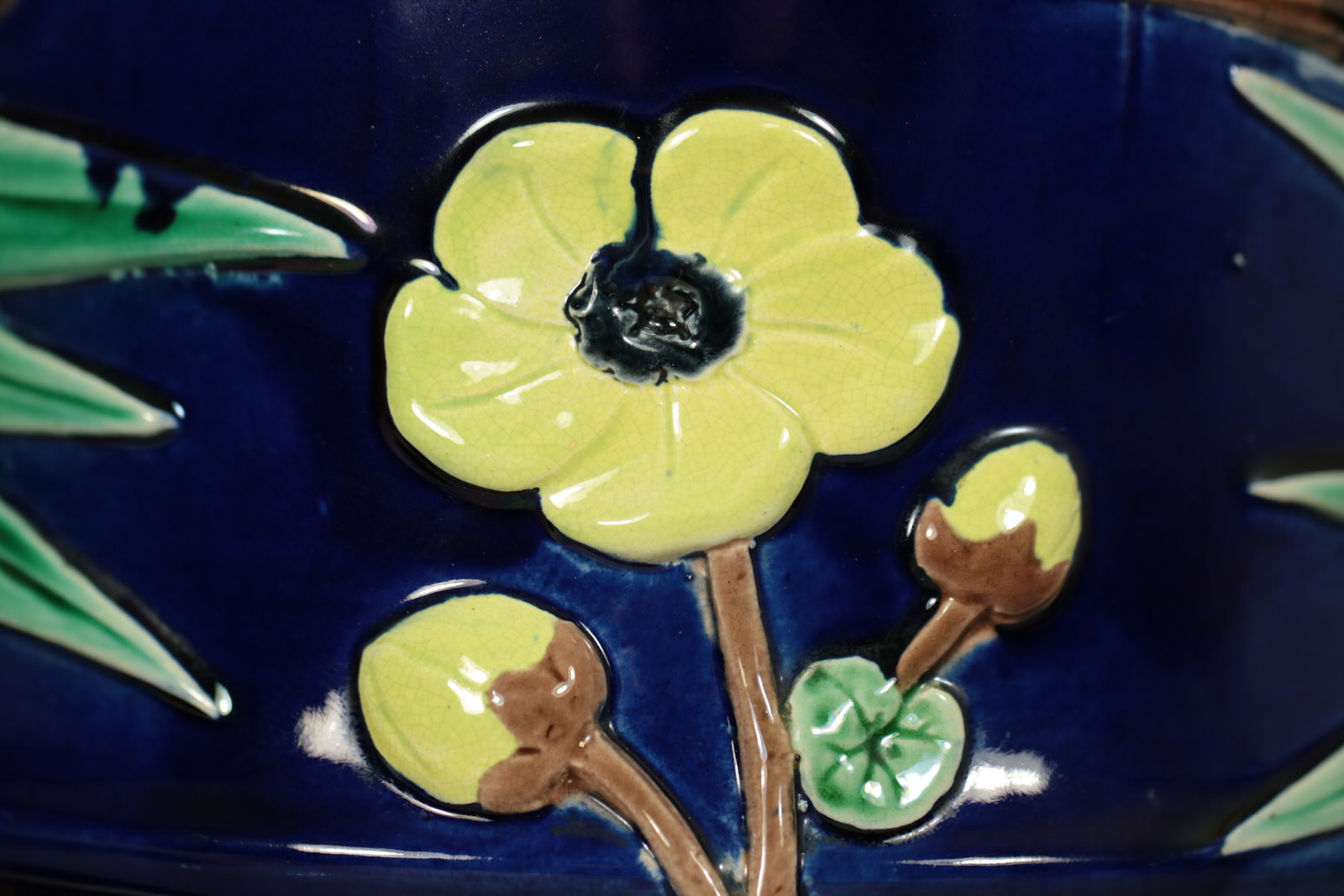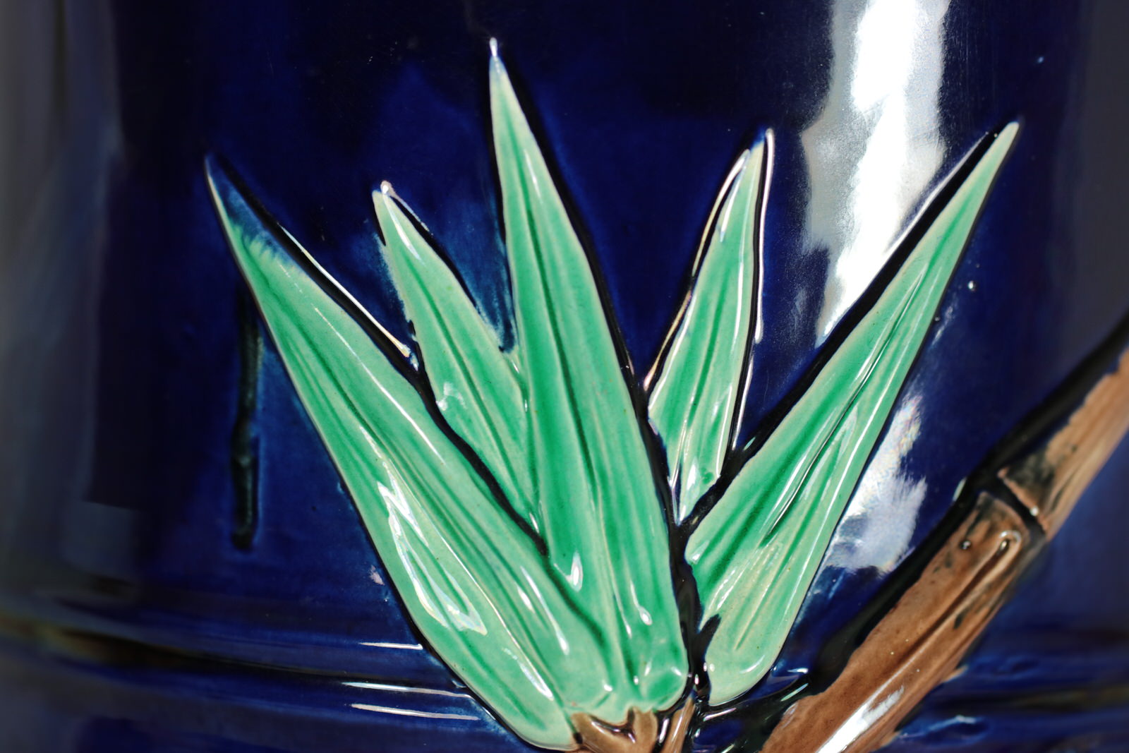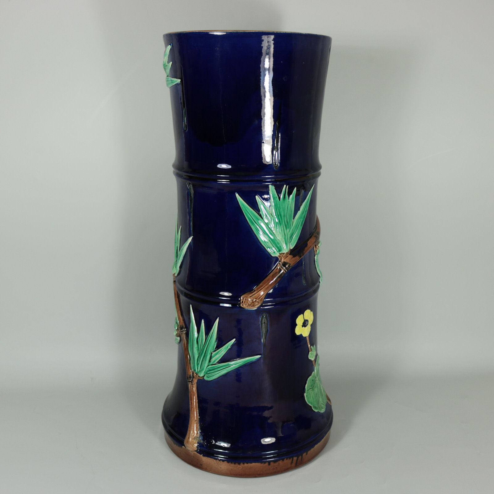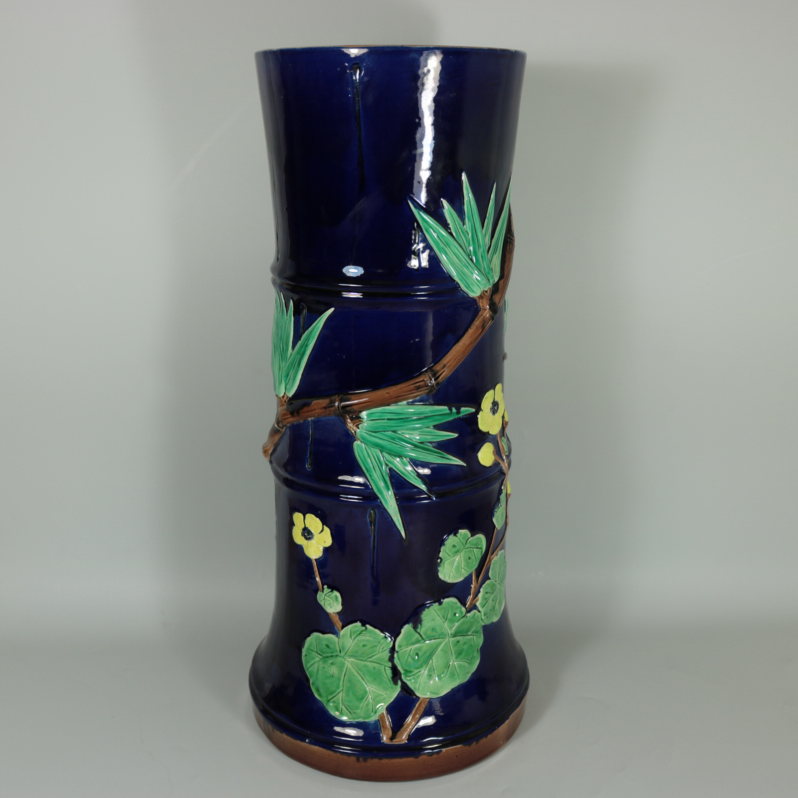 Victorian, circa 1880. 22.6ins high, 10.2ins wide, 10.2ins depth. Holdcroft Majolica stick or umbrella stand which features leafy bamboo branches and peony flowers up the sides.