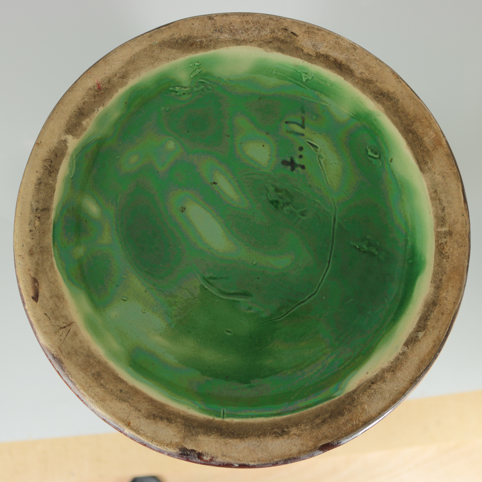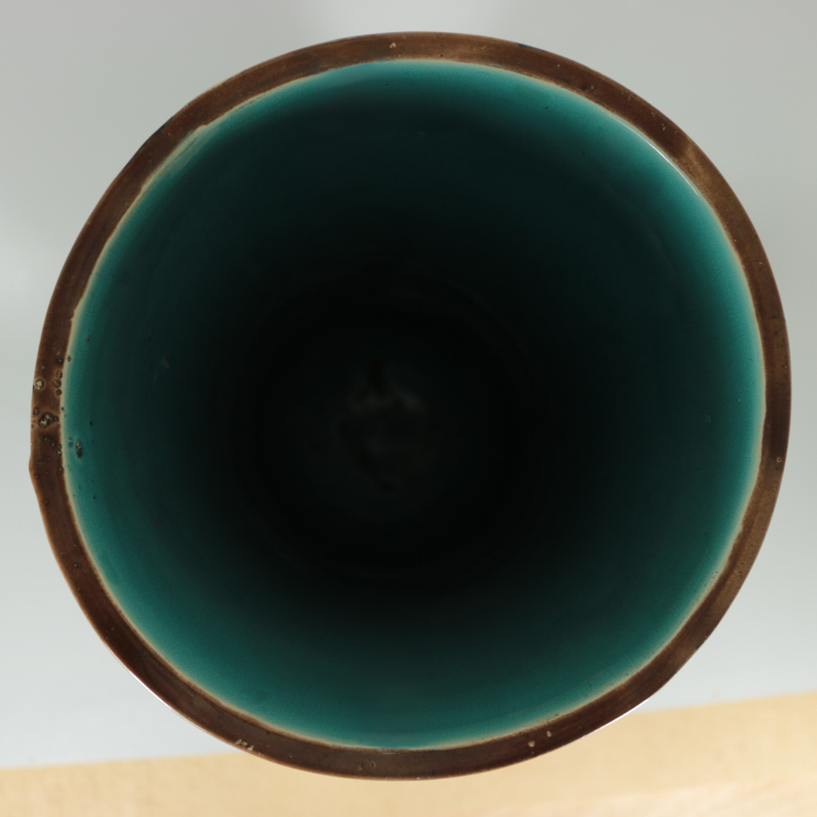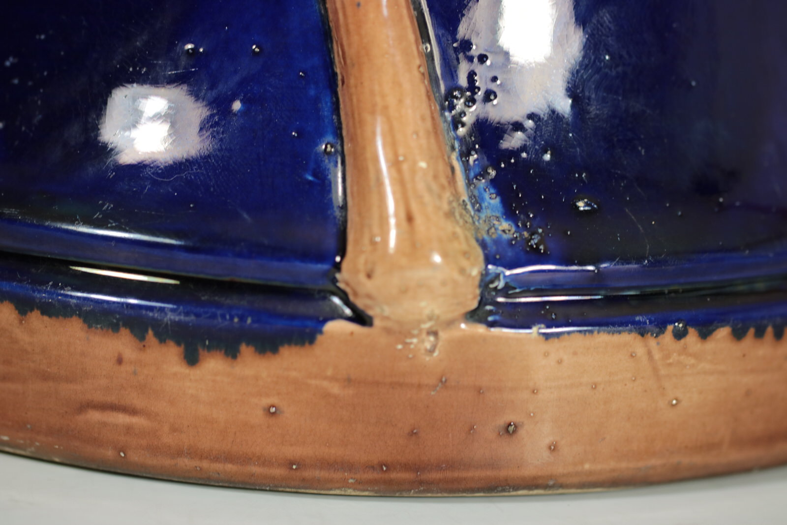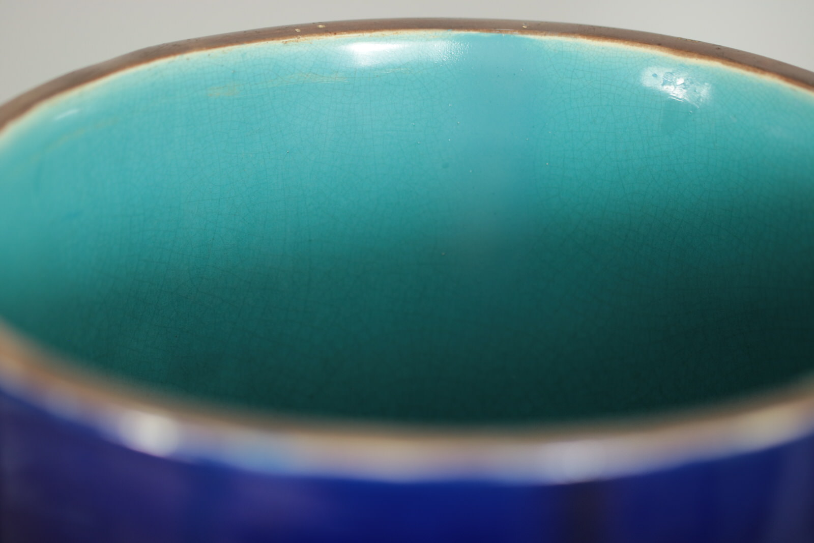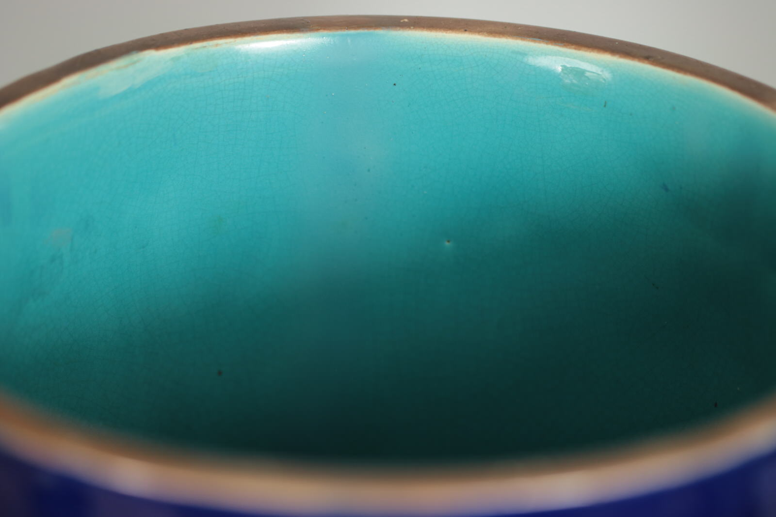KILN EFFECTS: kiln detritus caught in the glaze, on one side, near the base and on rim.