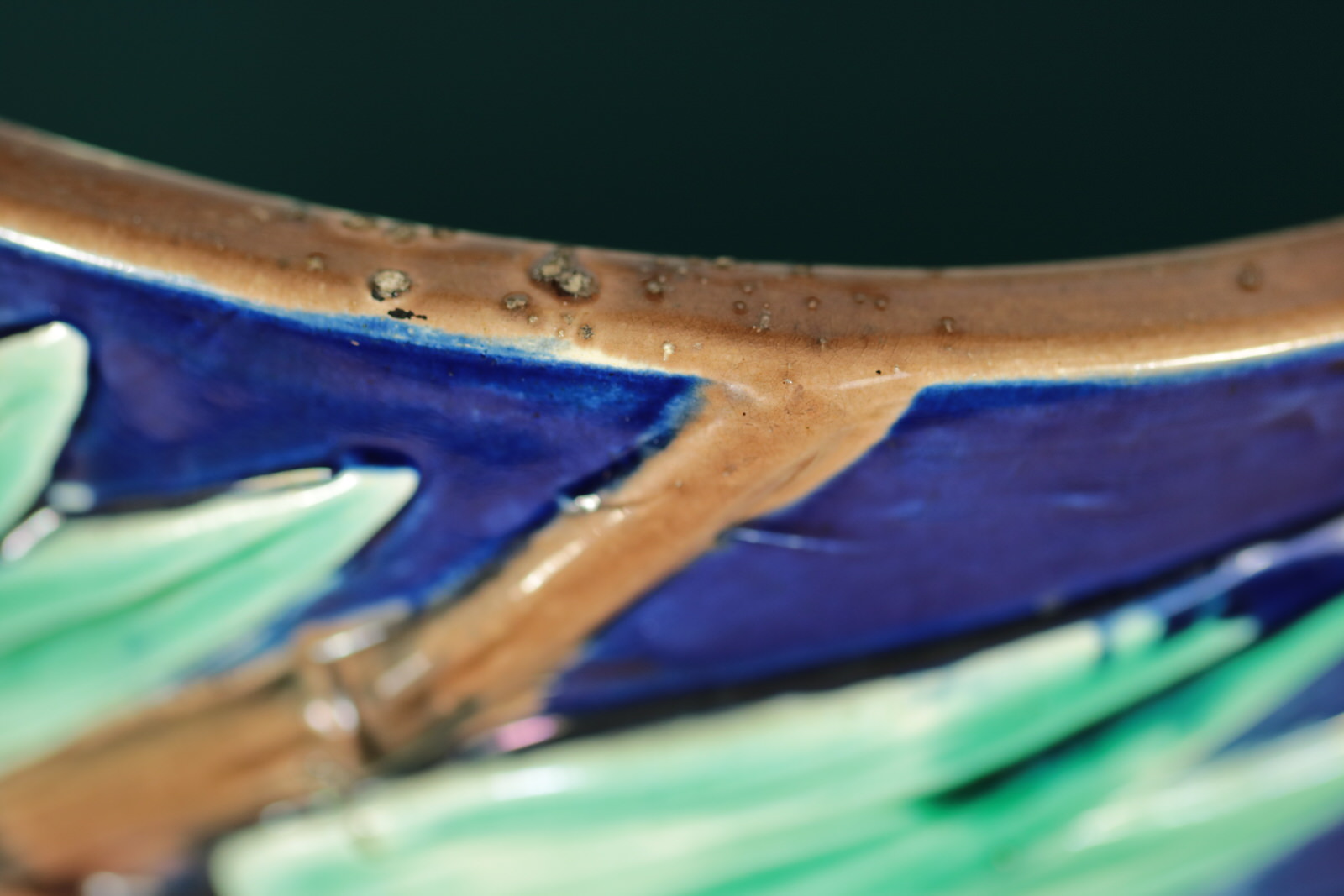 Colouration: cobalt blue, green, brown, are predominant.