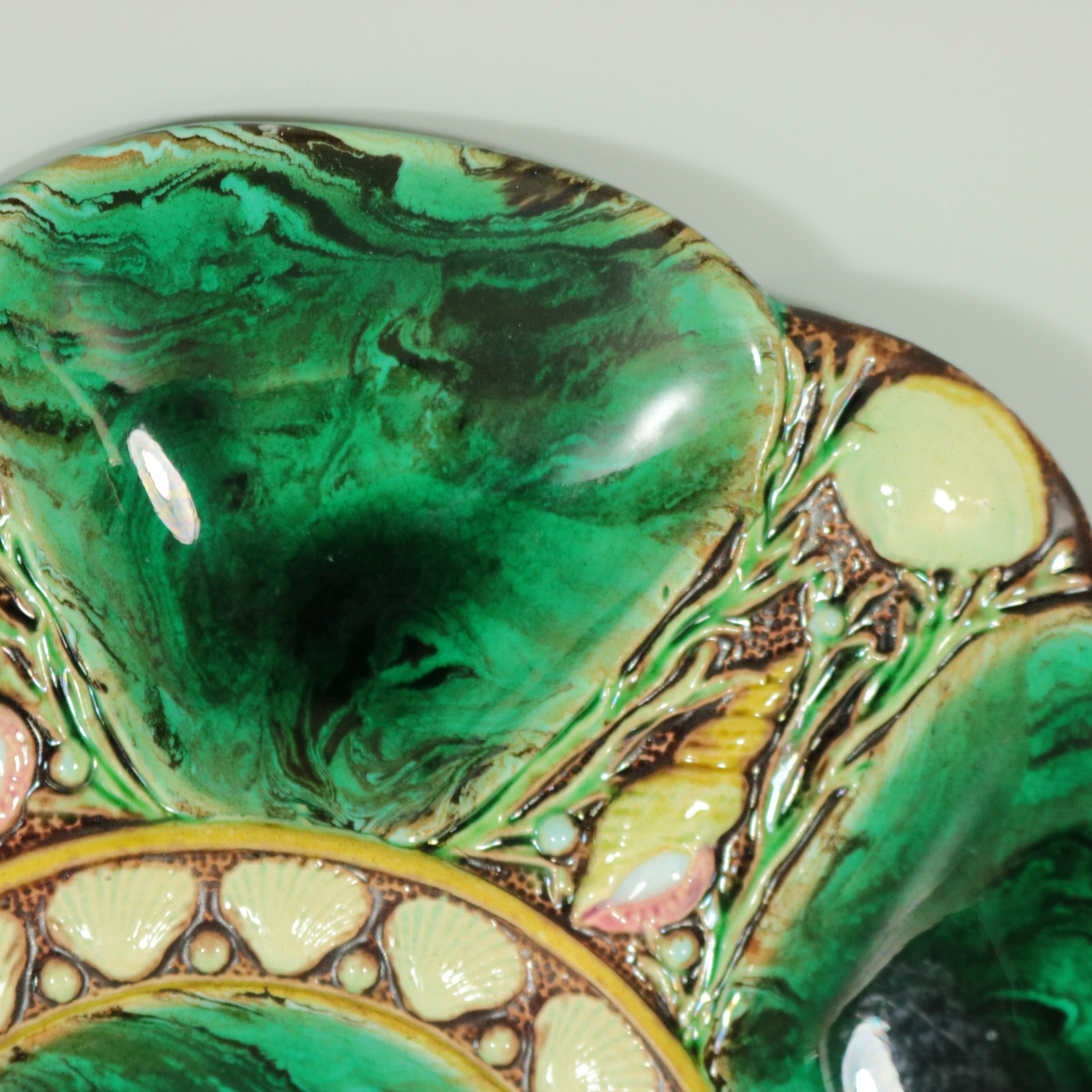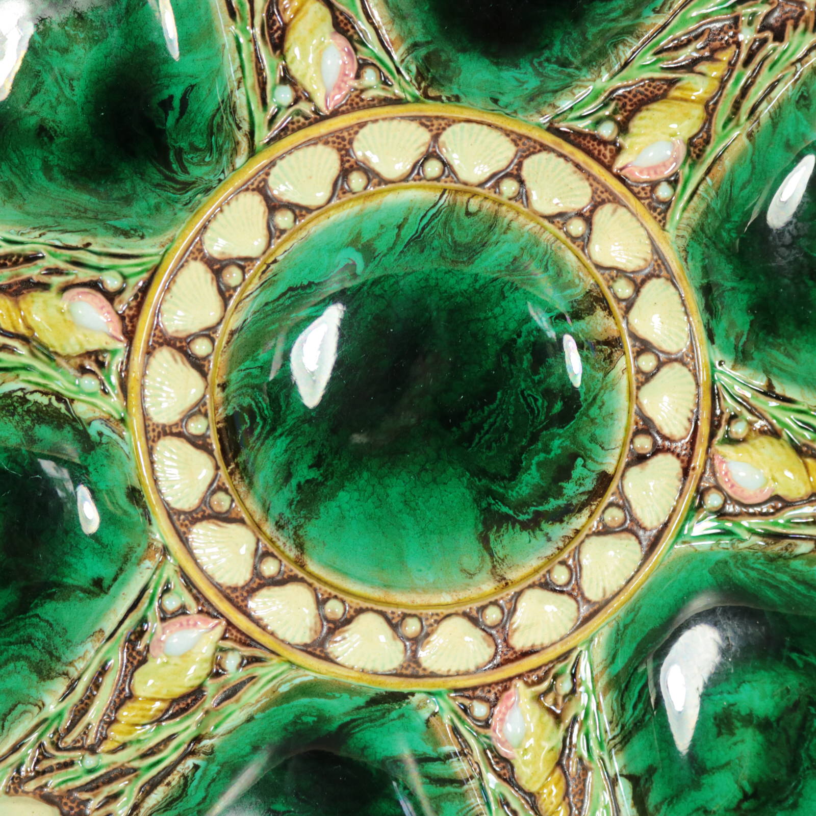 Victorian, circa 1875. 9.3ins high, 9.3ins wide, 0.9ins depth. Minton Majolica oyster plate which features six shell shaped wells with seashell surrounds.