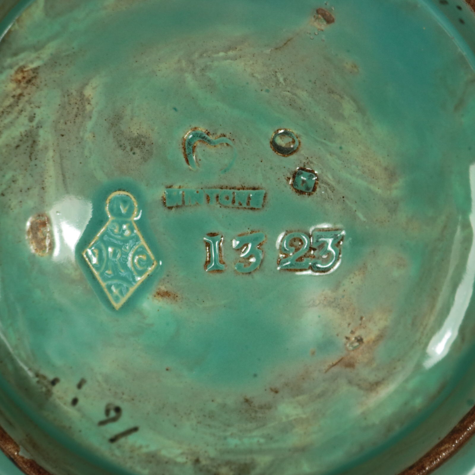 The piece bears maker's marks for the Minton pottery. Bears a pattern number, '1323'. English diamond registration mark for the date 25/11/1870. Marks include a factory specific date cipher for the year 1875.