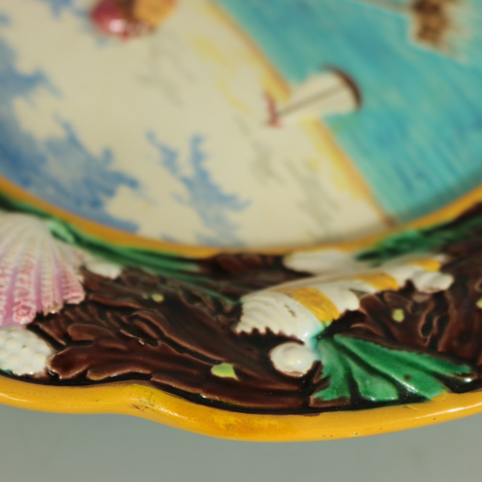 Victorian, circa 1870. 9.4ins high, 9.4ins wide, 1.4ins depth. George Jones Majolica plate which features a girl fishing for shrimp.