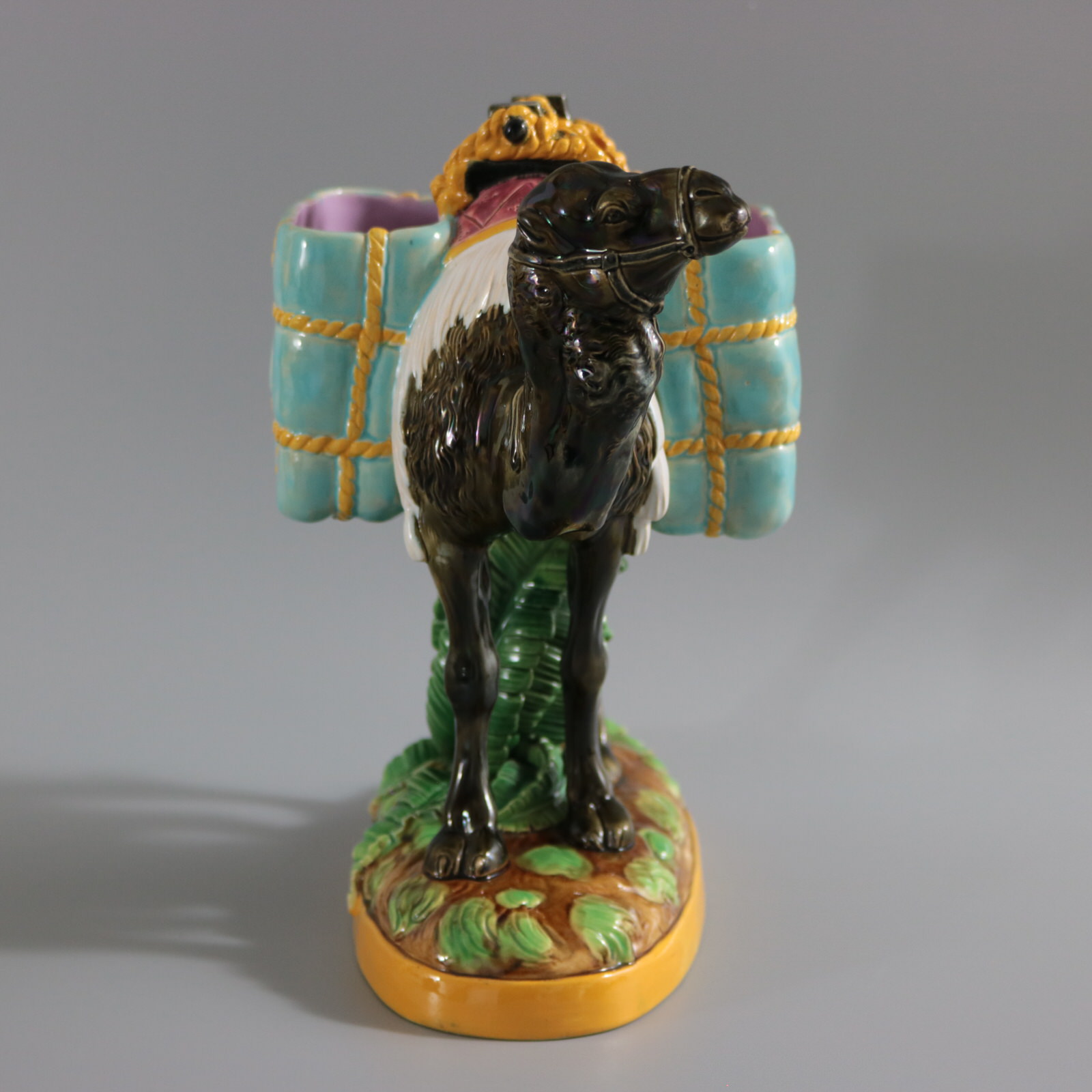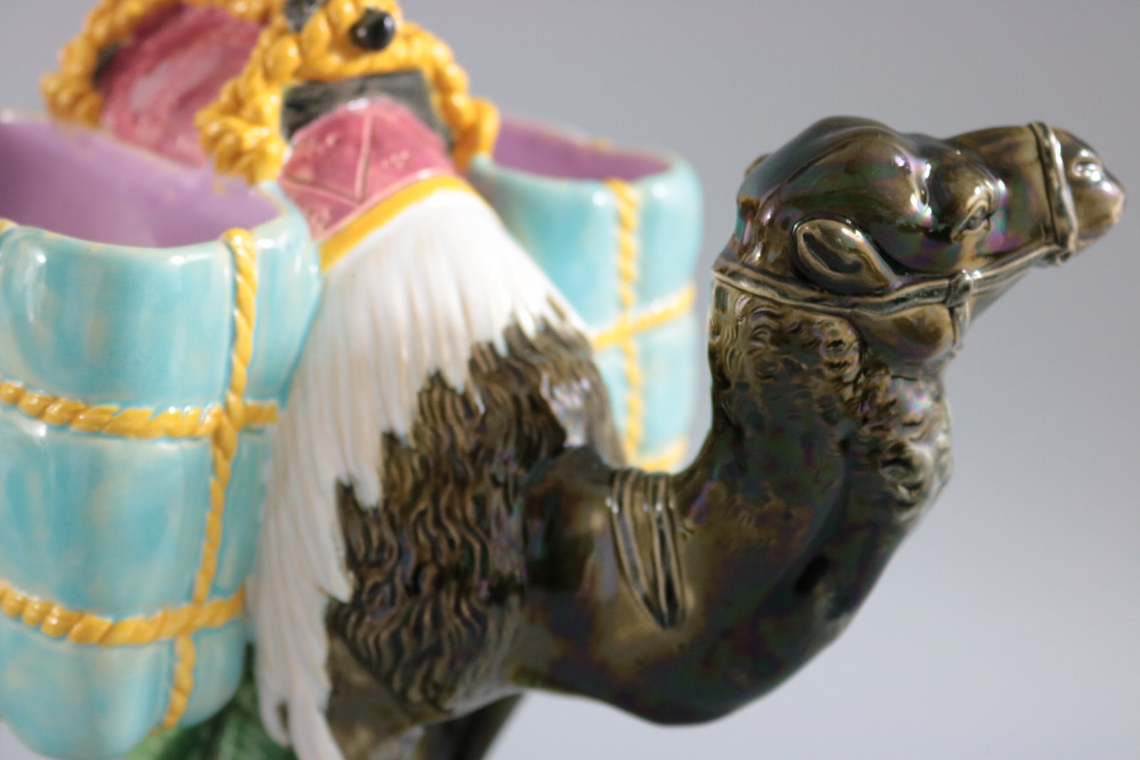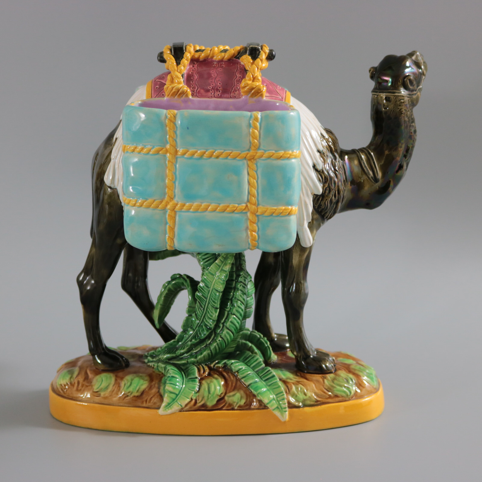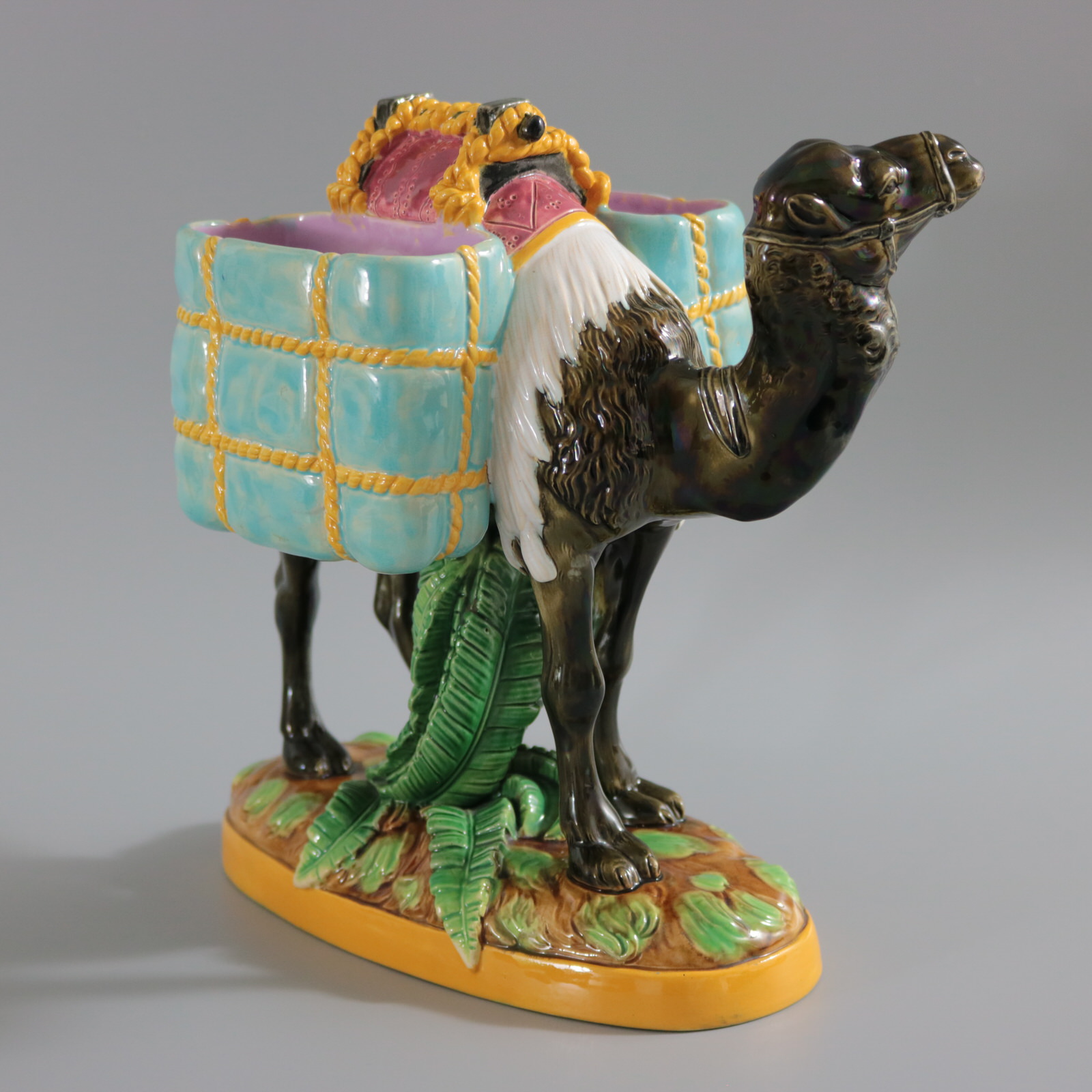 Victorian, circa 1871. 8.9ins high, 9.4ins wide, 5.5ins depth. George Jones Majolica flower holder which features a camel, stood over leaves, carrying panniers on it's back.