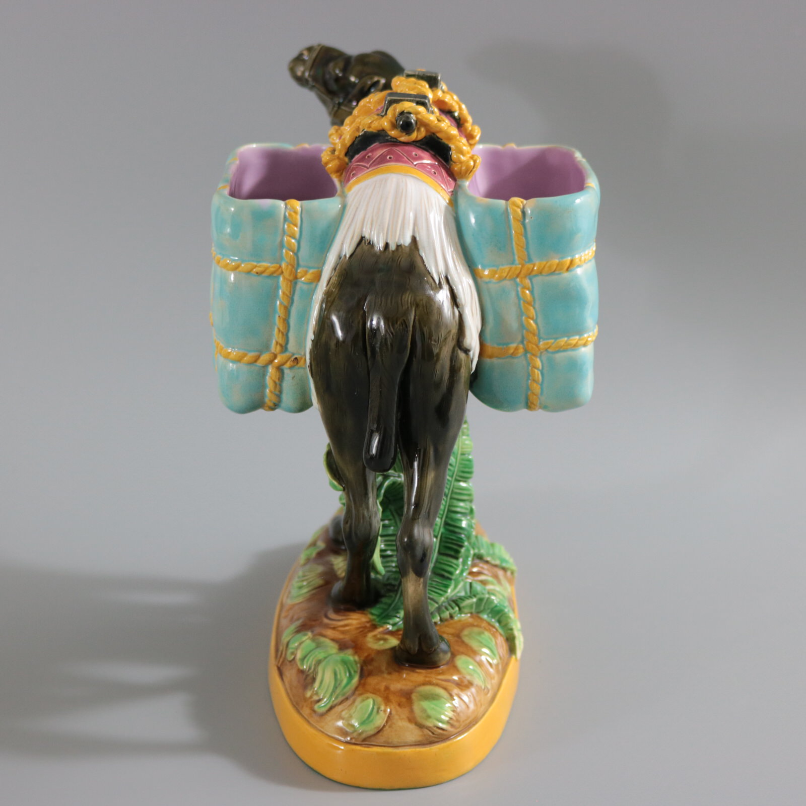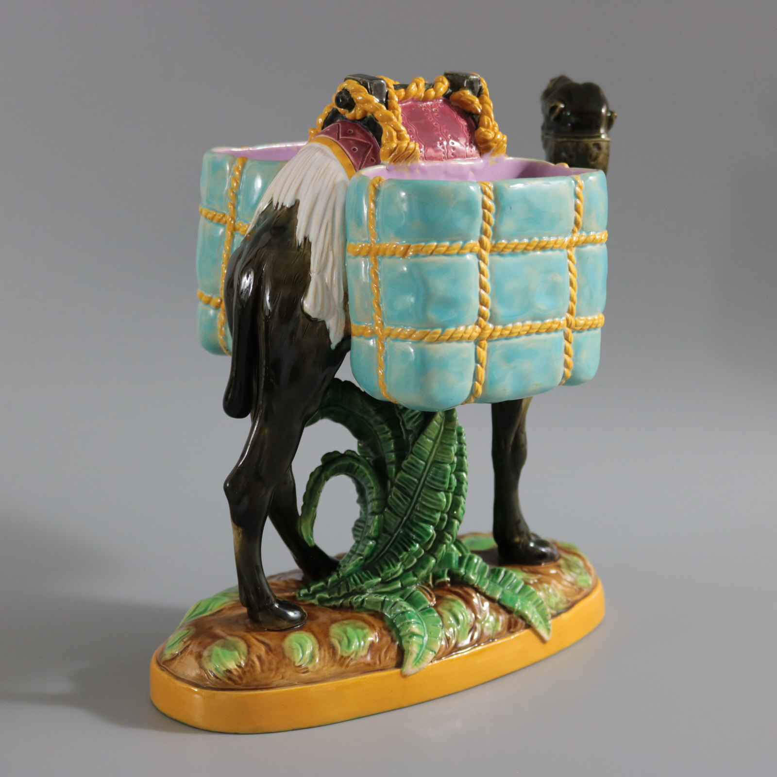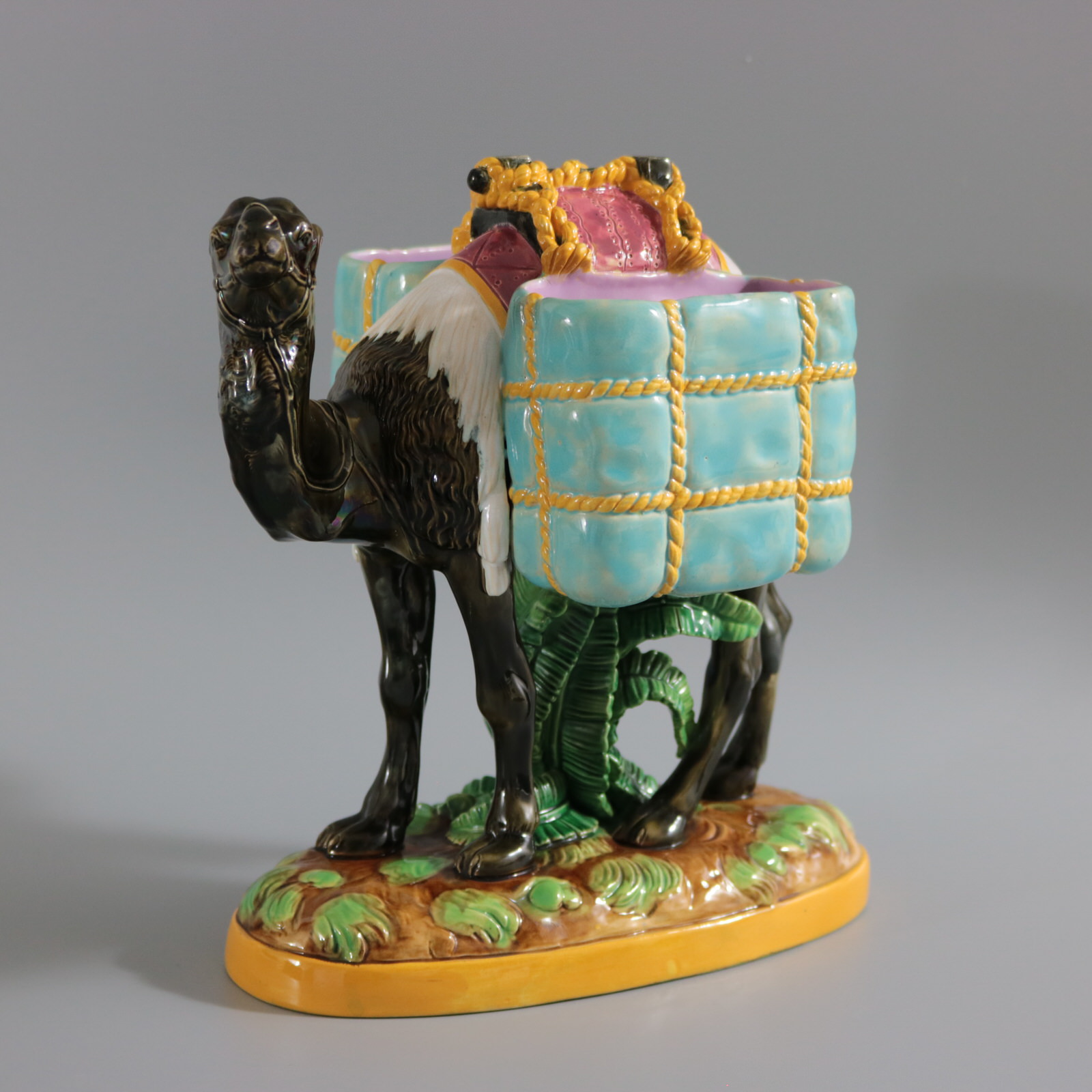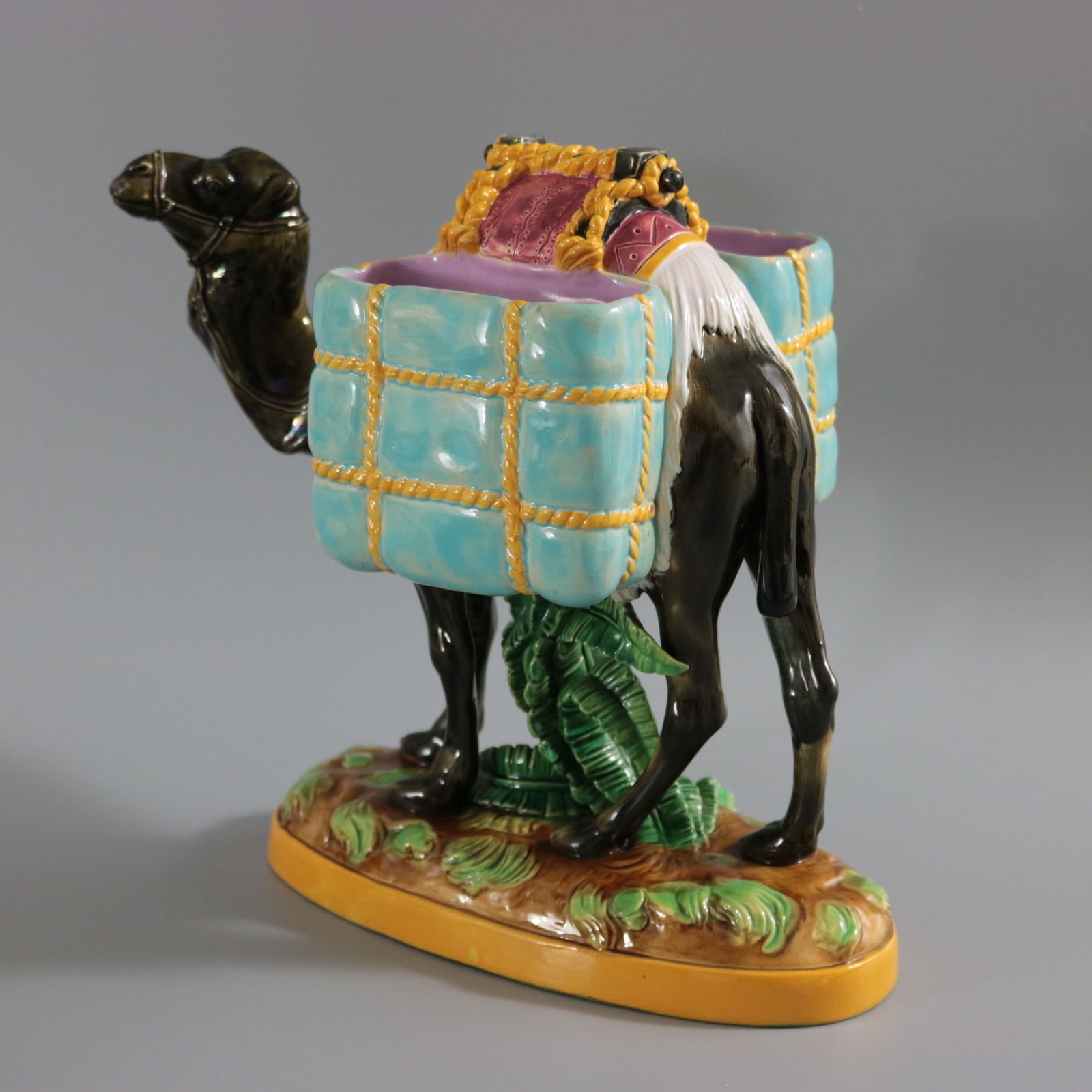 Victorian, circa 1871. 8.9ins high, 9.4ins wide, 5.5ins depth. George Jones Majolica flower holder which features a camel, stood over leaves, carrying panniers on it's back.