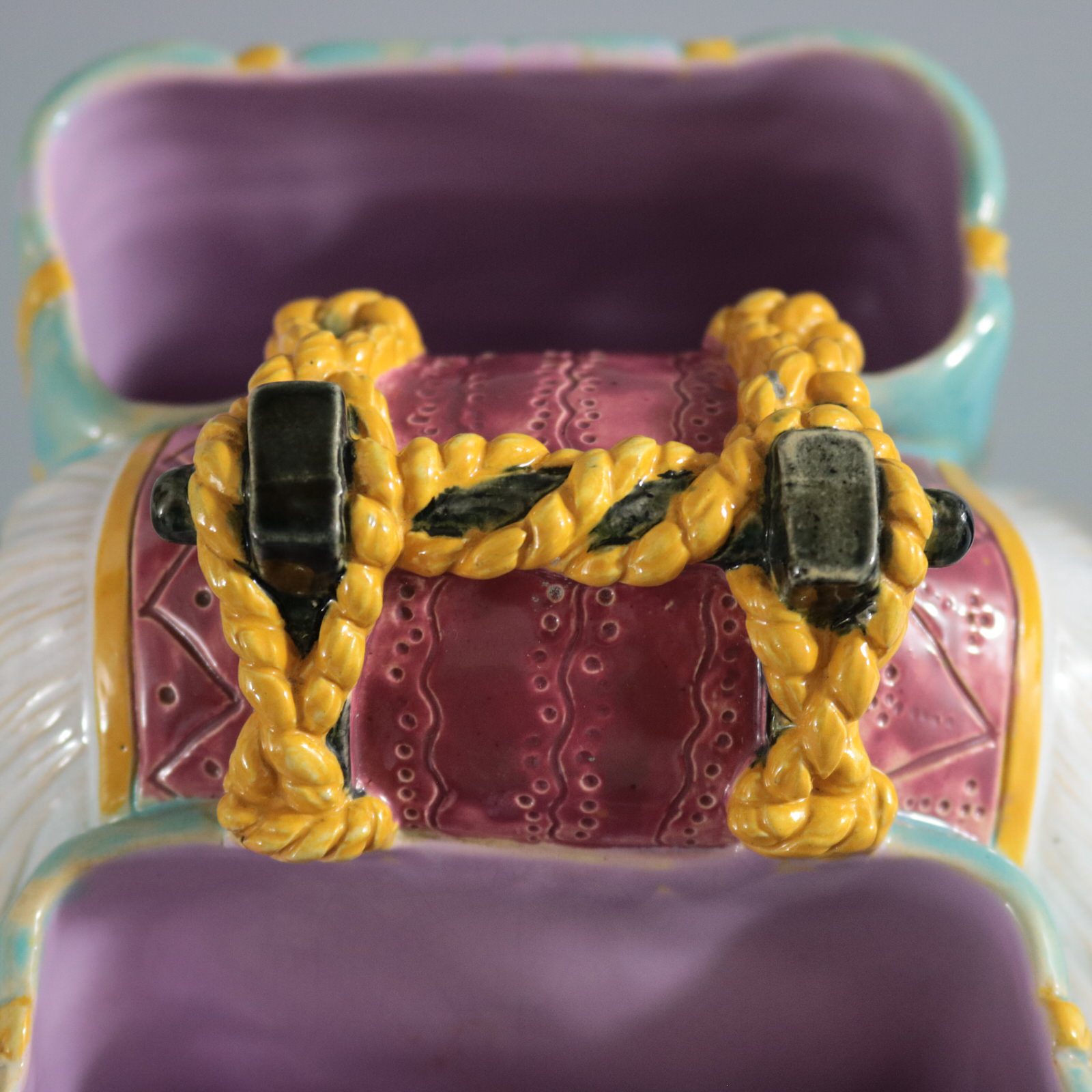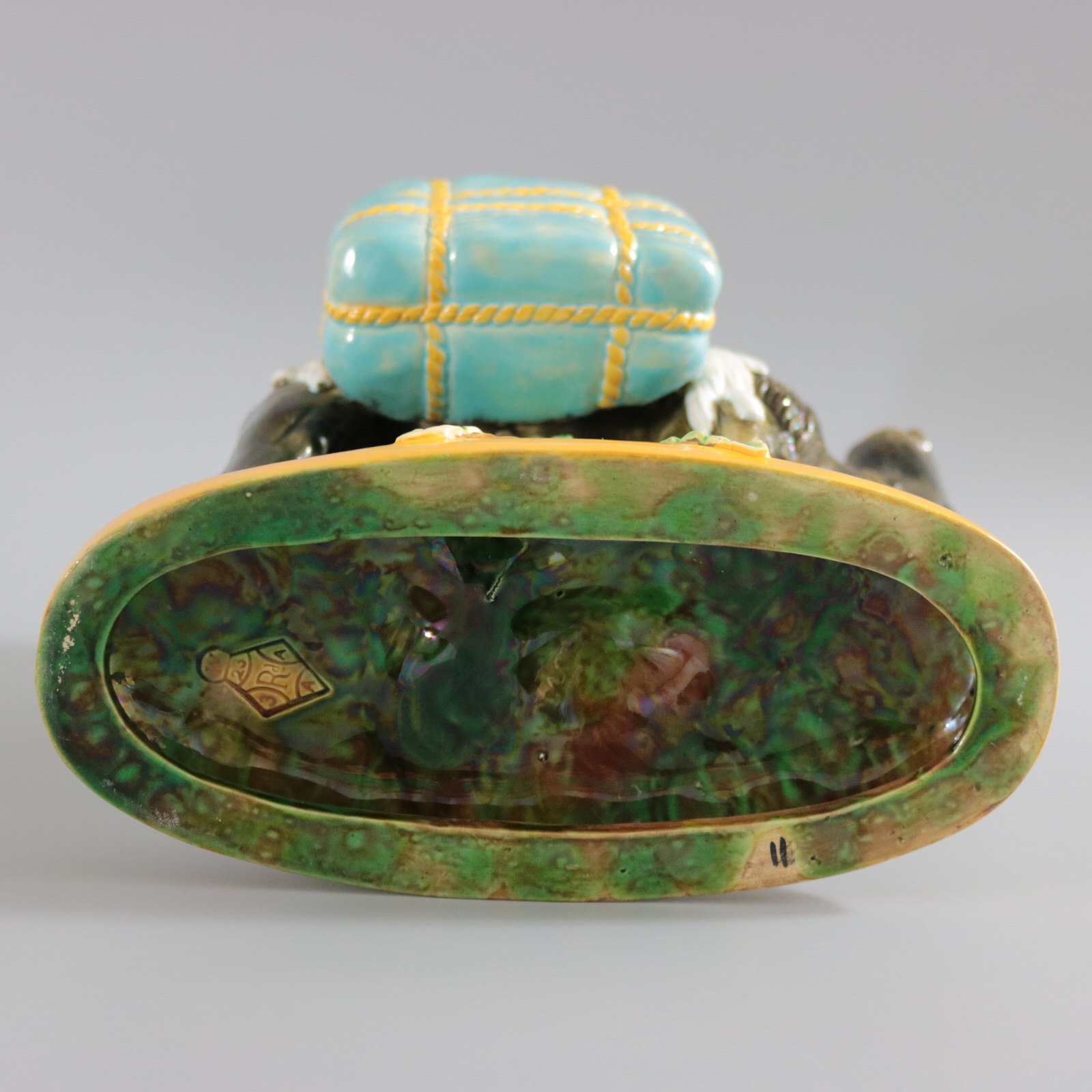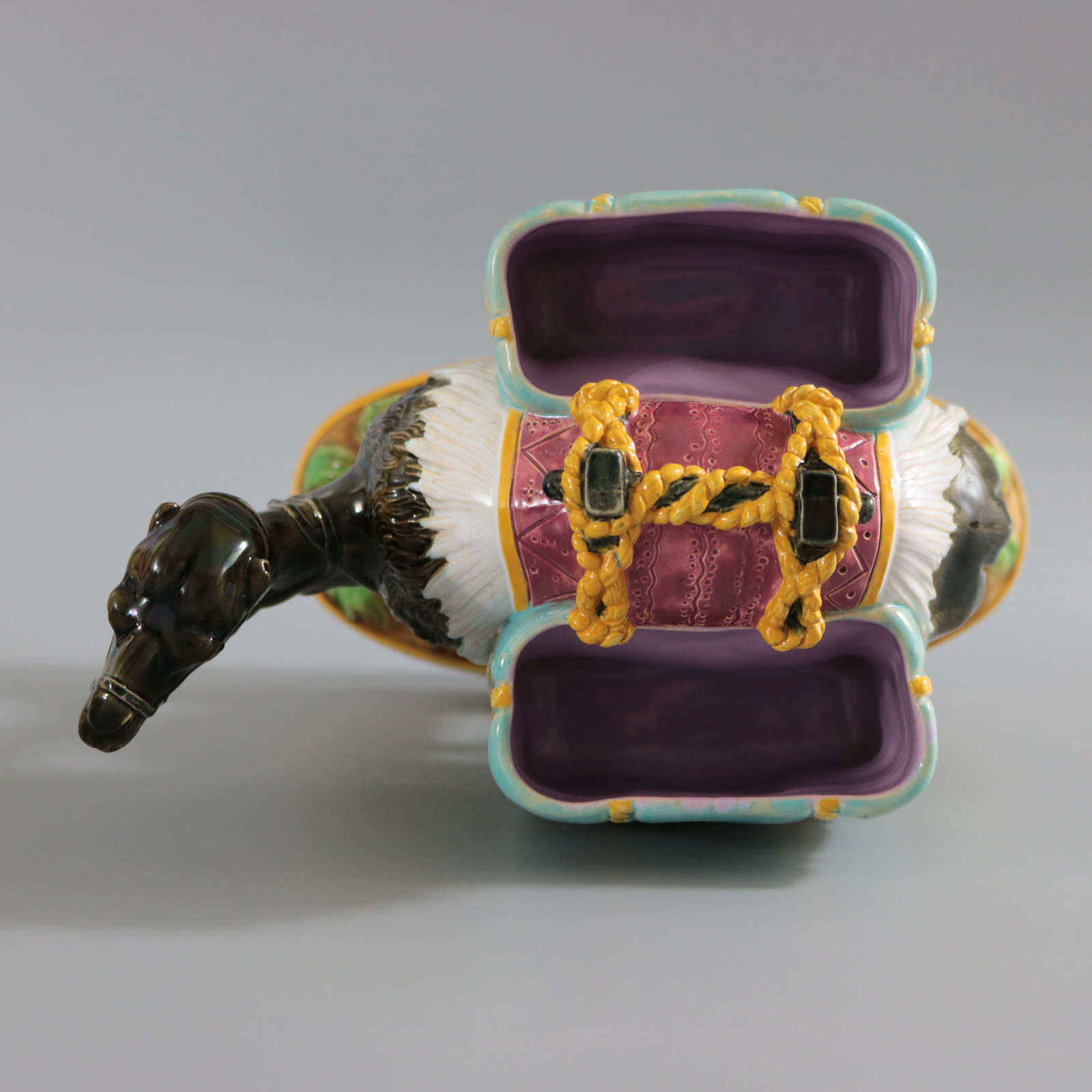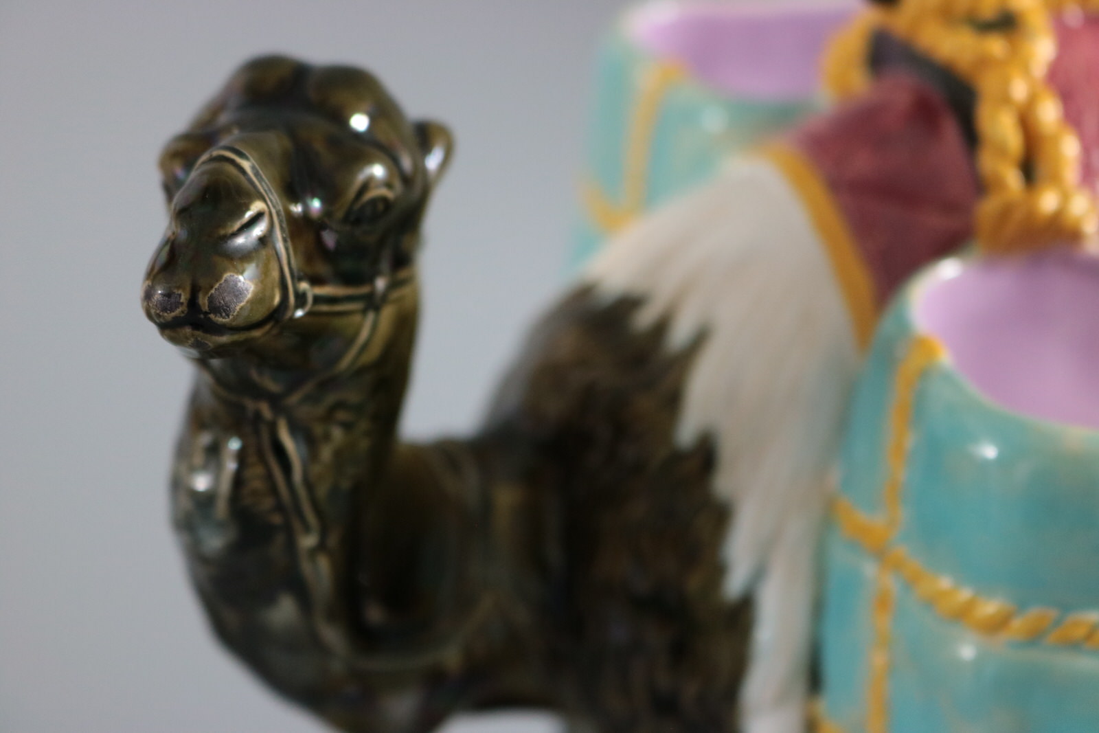 Victorian, circa 1871. 8.9ins high, 9.4ins wide, 5.5ins depth. George Jones Majolica flower holder which features a camel, stood over leaves, carrying panniers on it's back.